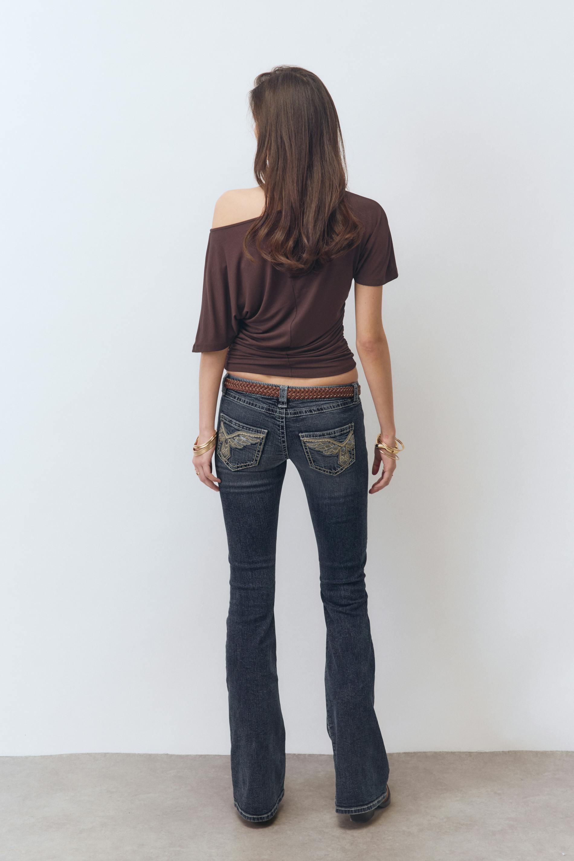 Boot cut jeans with low waist. The jeans are blue and have embroidered back pockets with sequins. They have flared legs, figure-hugging fit and soft quality with low stretch.