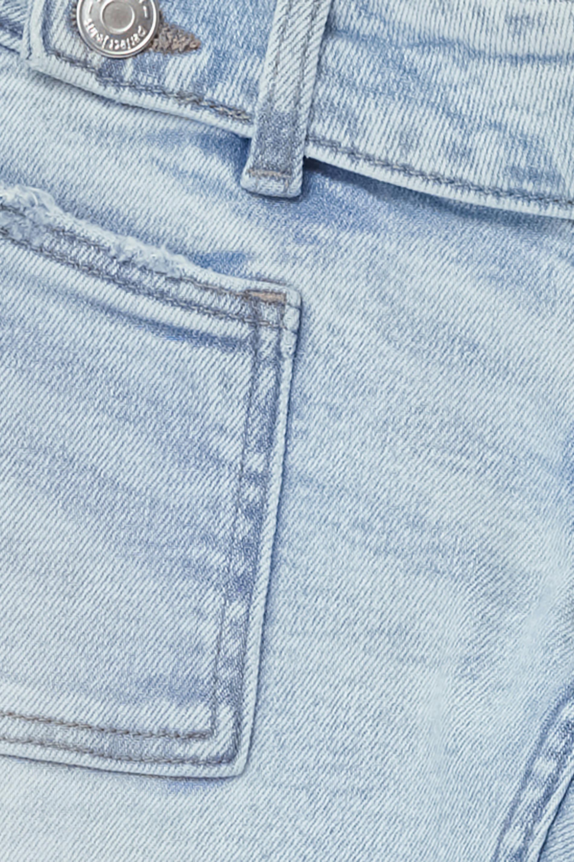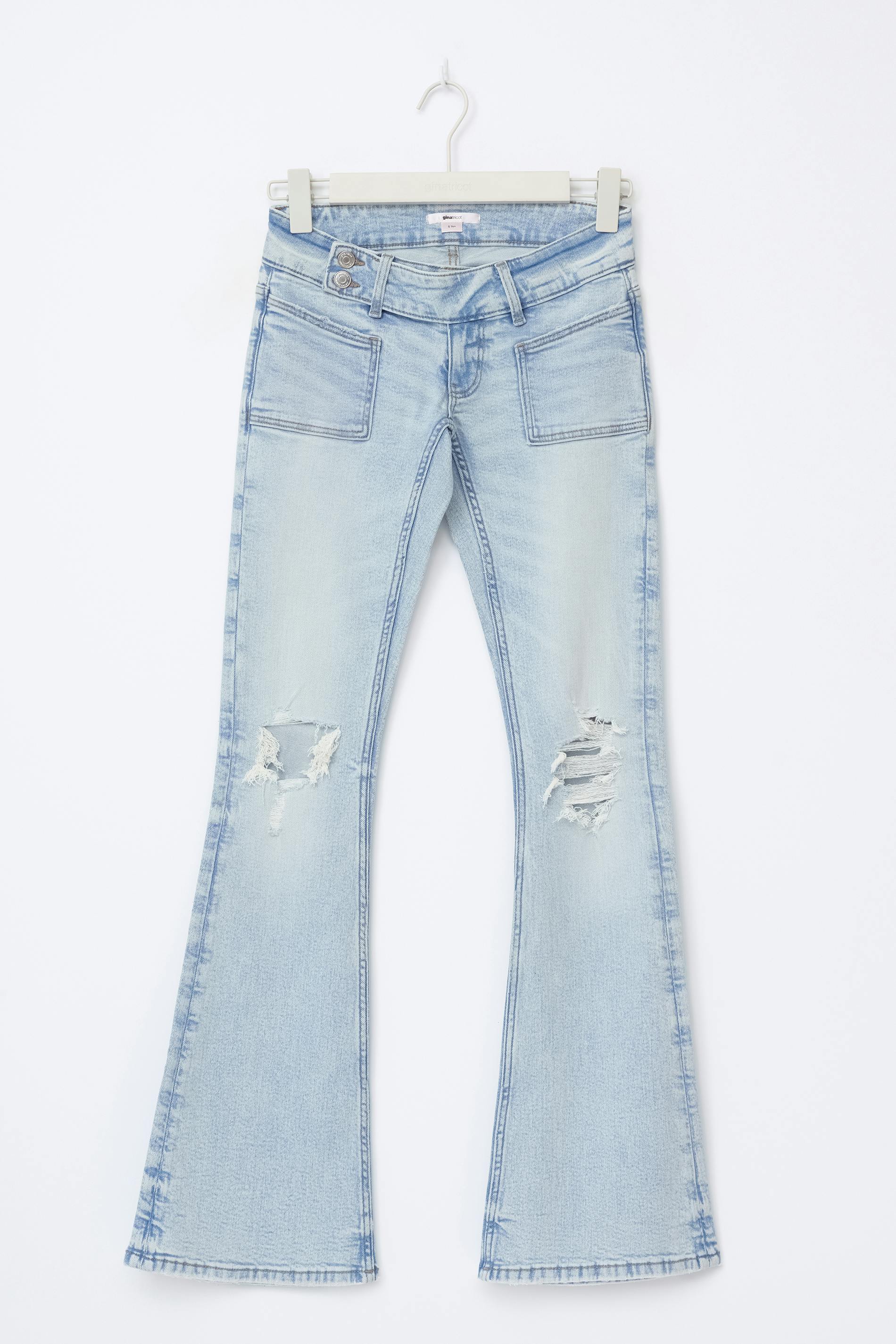 Flare jeans med slitna detaljer framtill. Jeansen är ljusblåa och har låg midja. De har utsvängda ben, låg stretch, dragkedjegylf, dubbla knappar i sidan och fickor fram och bak.