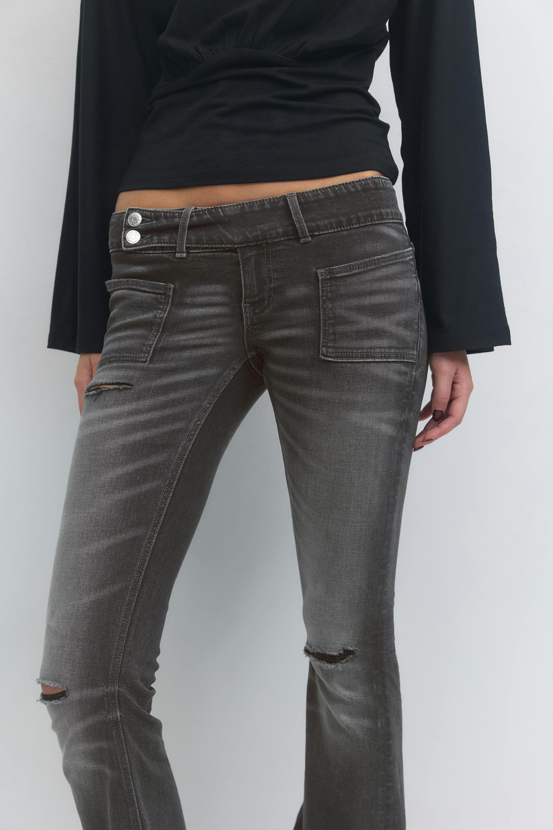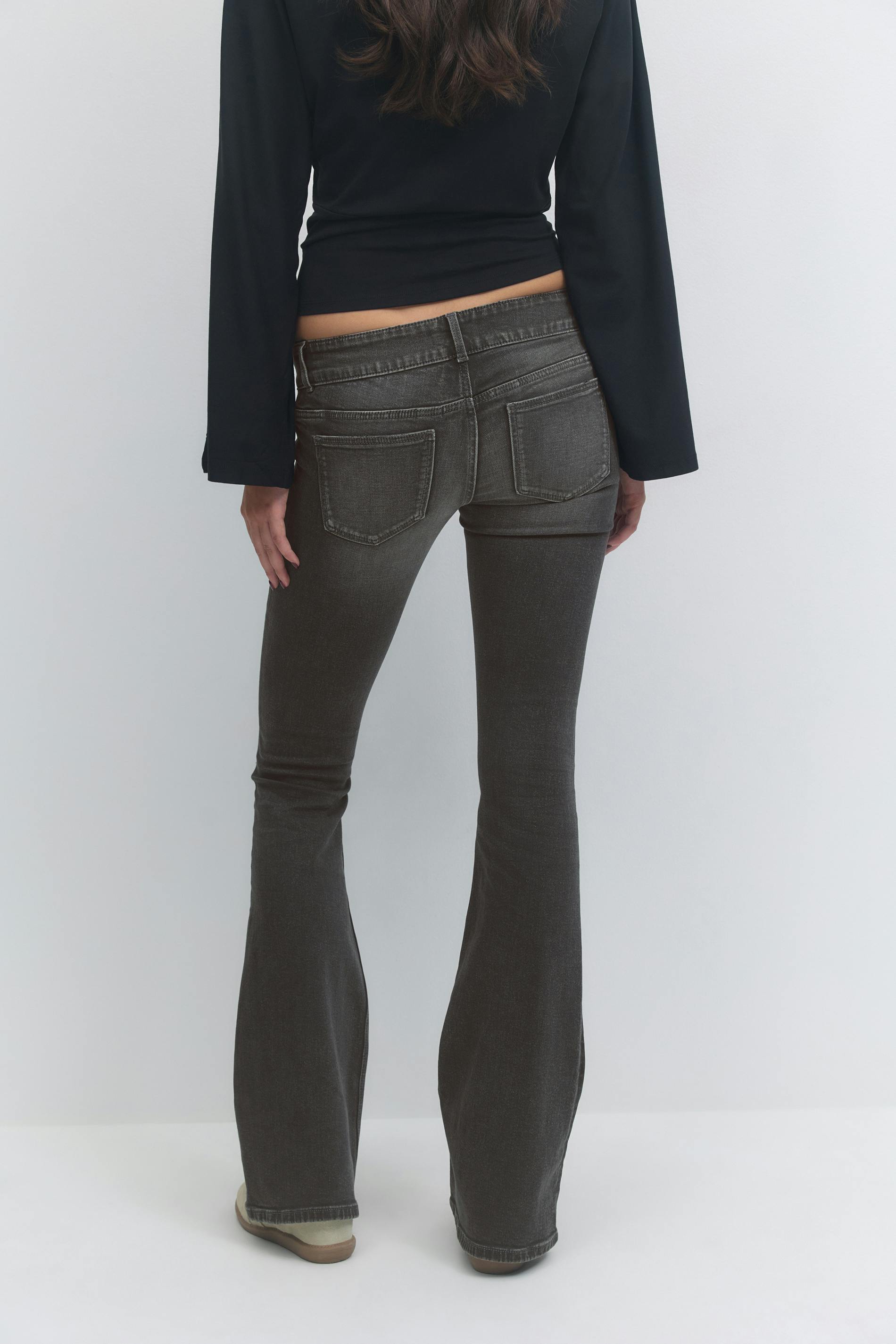 Flare jeans med extra långa ben. Jeansen är gråa och har slitna detaljer framtill. De har låg midja, utsvängda ben, låg stretch, dragkedjegylf, dubbla knappar i sidan och fickor fram och bak. Passar för dig som är 175 cm eller längre. Passar för dig som ä