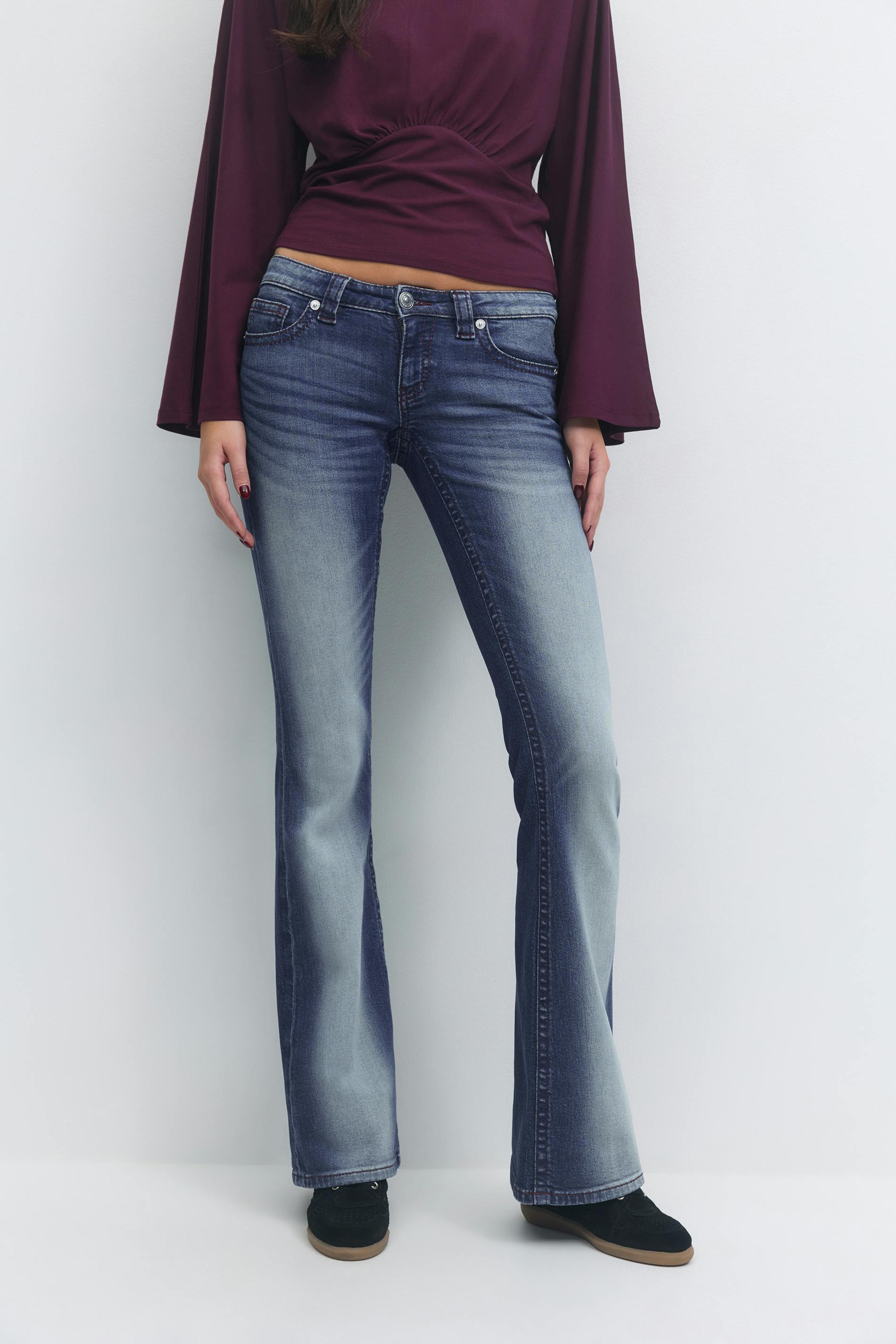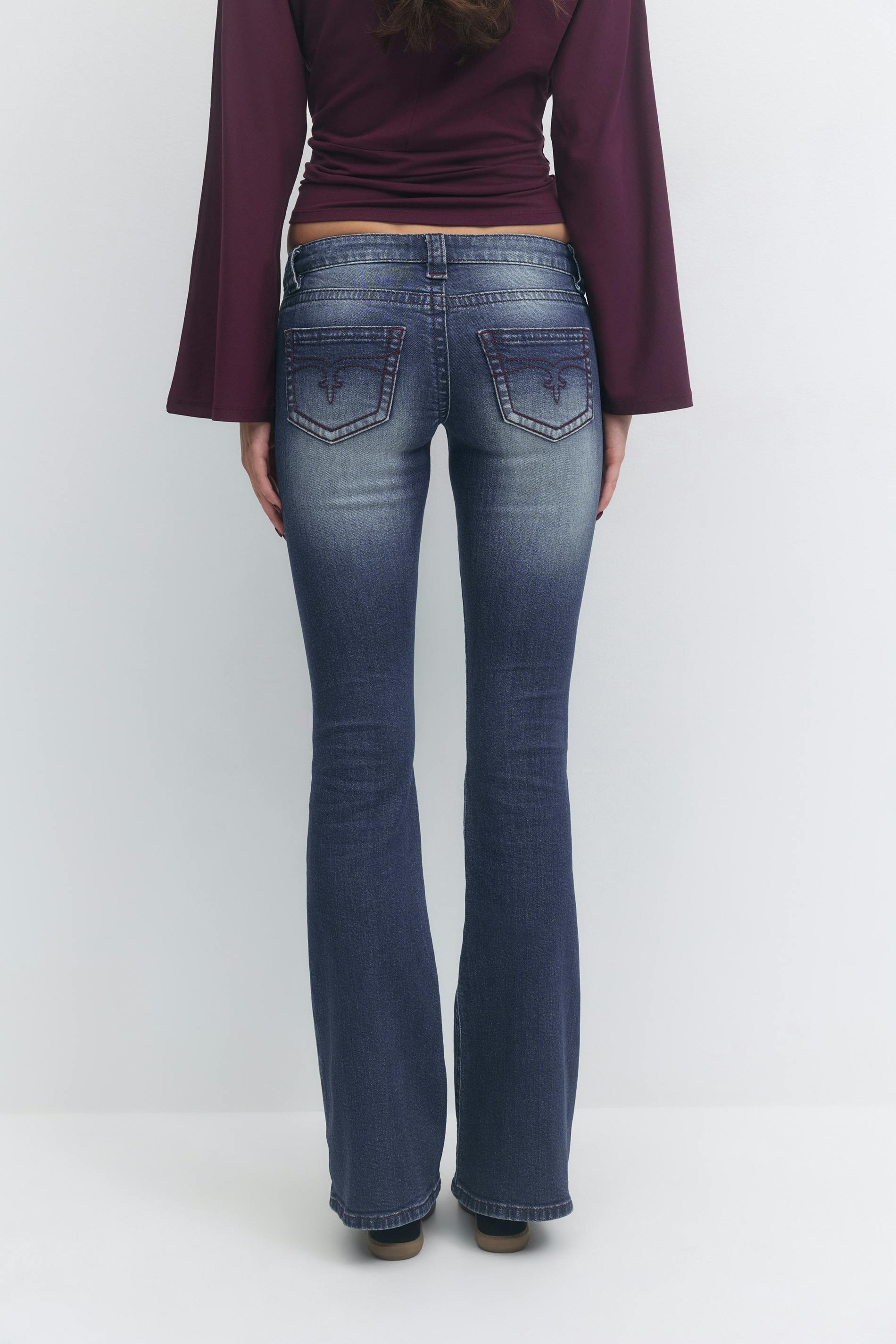 Tall low waist jeans med utsvängda ben. Jeansen är blåa och har bakfickor med ett broderi. De har en normallängd, en dragkedjegylf och en knapp på framsidan. Passar för dig som är 175 cm eller längre.