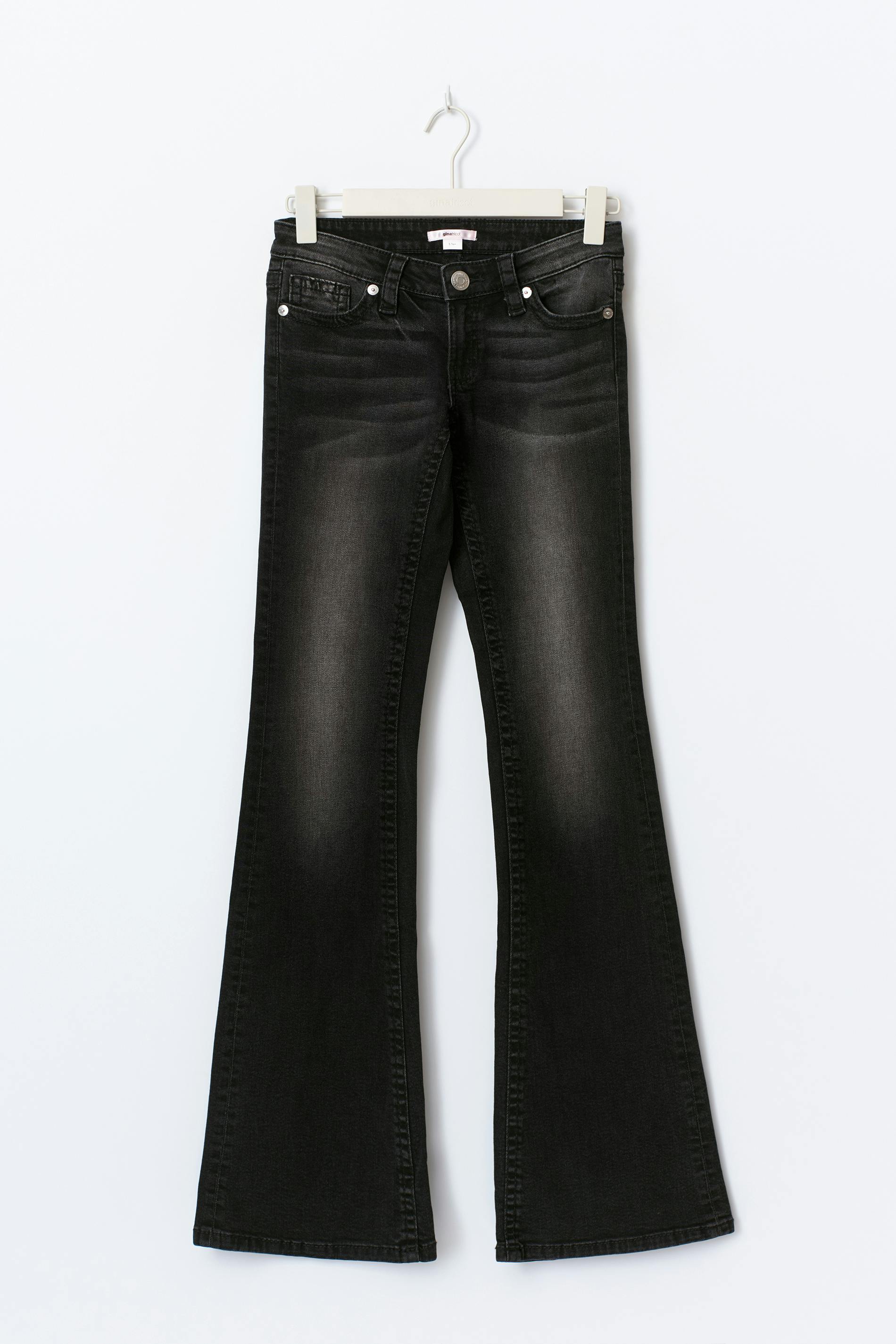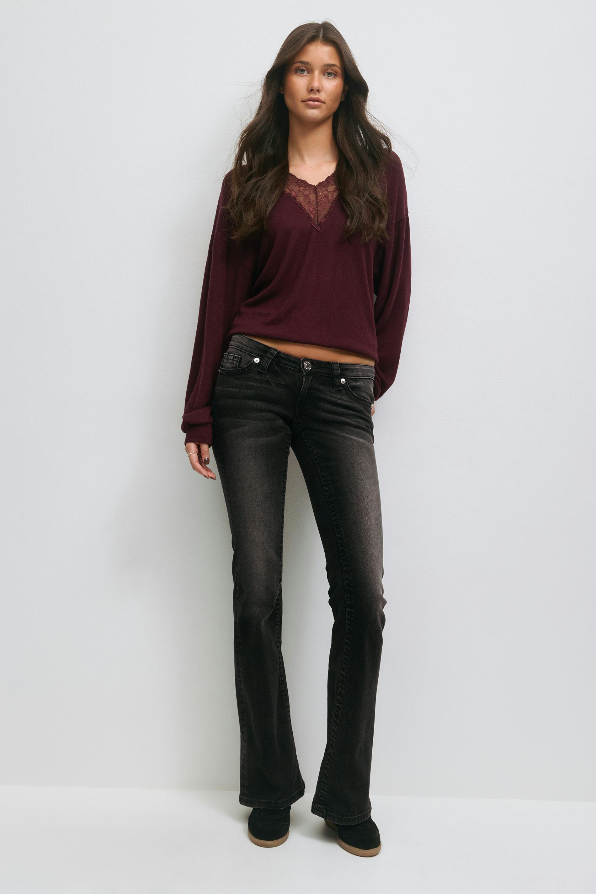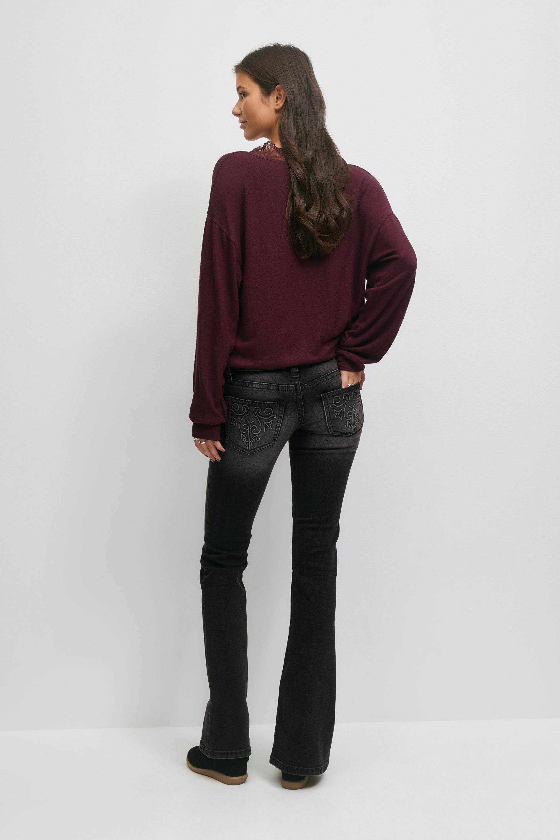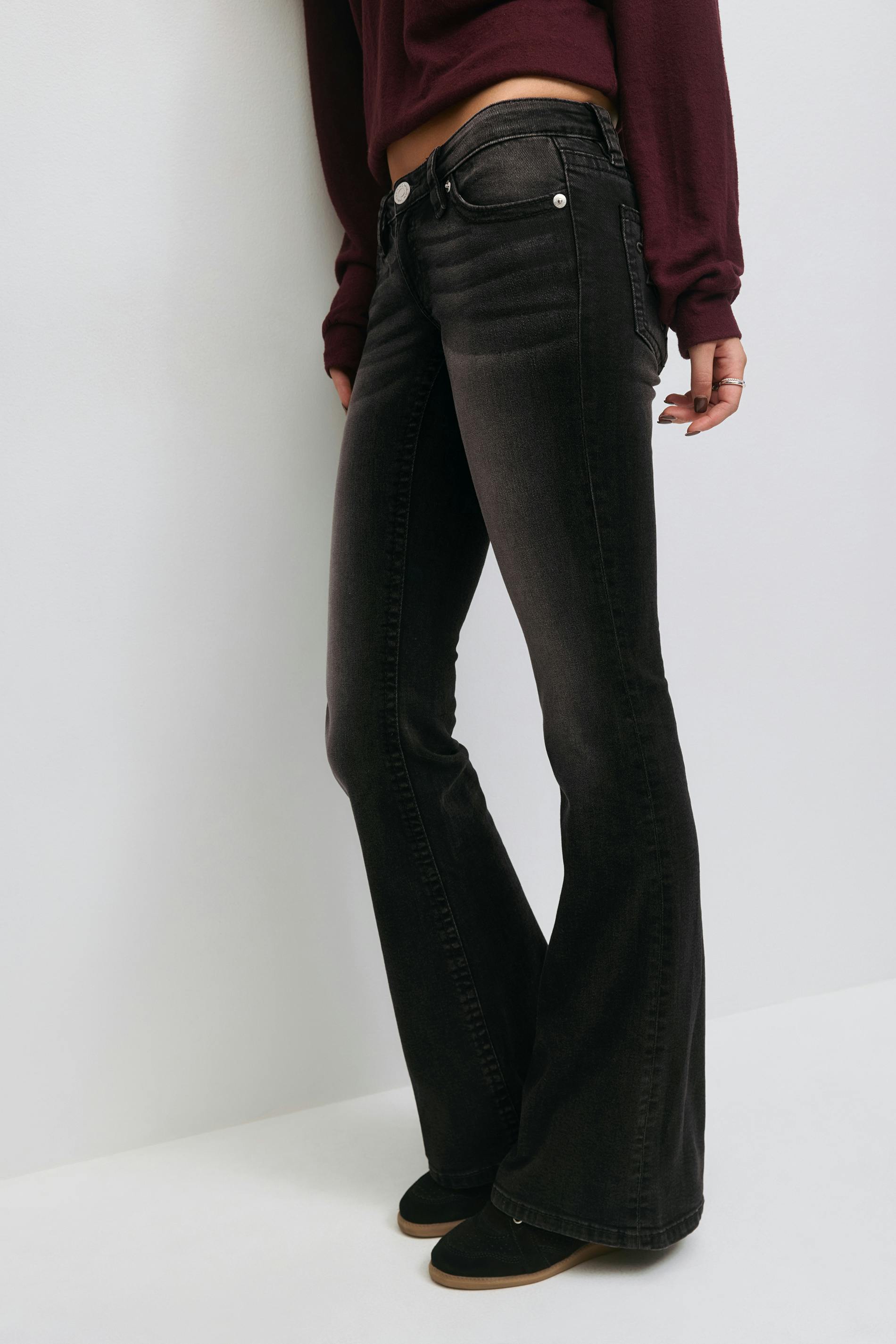 Flare jeans med en låg midja. Jeansen är svarta och har broderade fickor baktill. De har en normallängd, en dragkedjegylf och en normal passform.