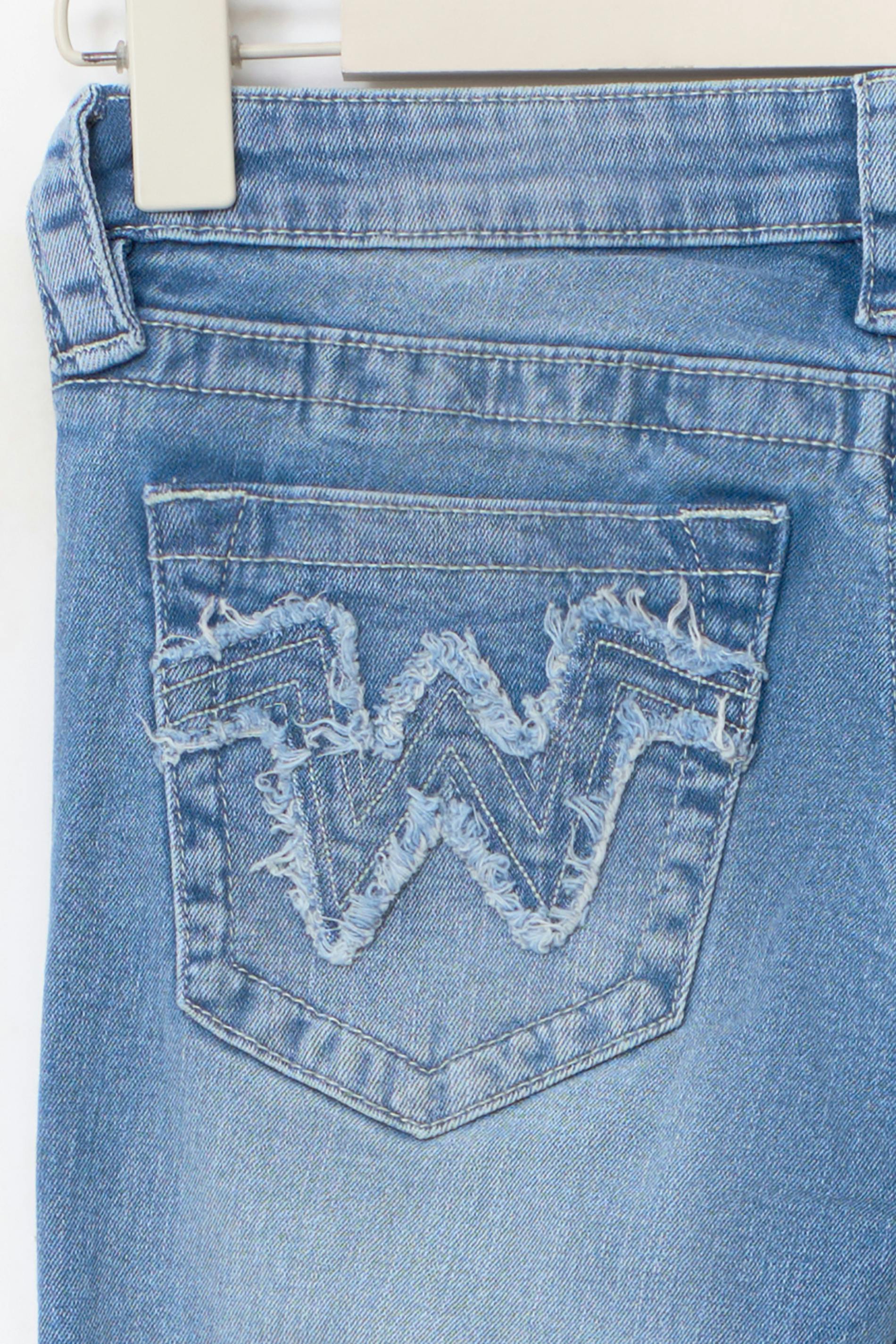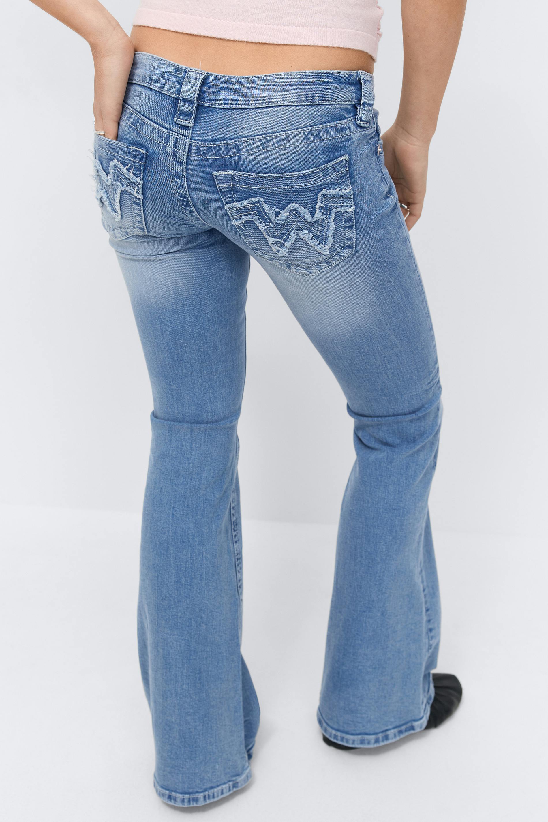 Bootcut jeans med låg midja. Jeansen är blåa och har utsvängda ben. De har bälteshällor, dragkedjegylf, framfickor och broderade bakfickor.