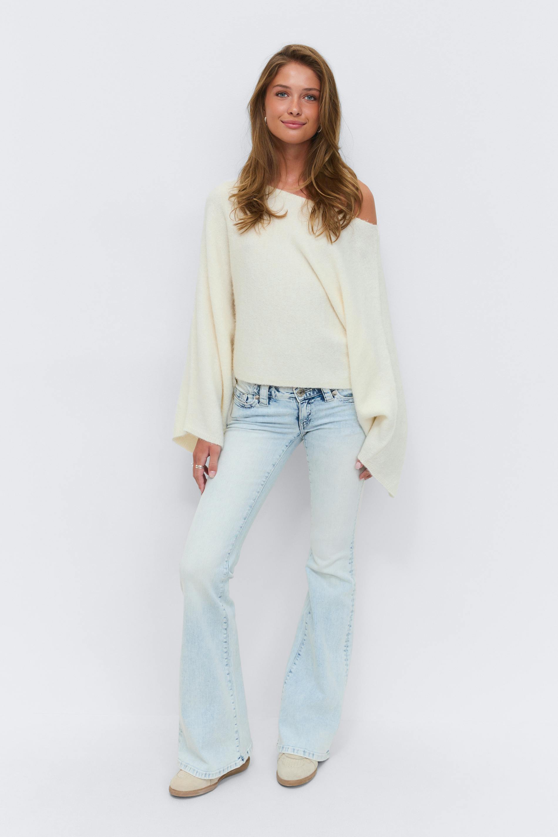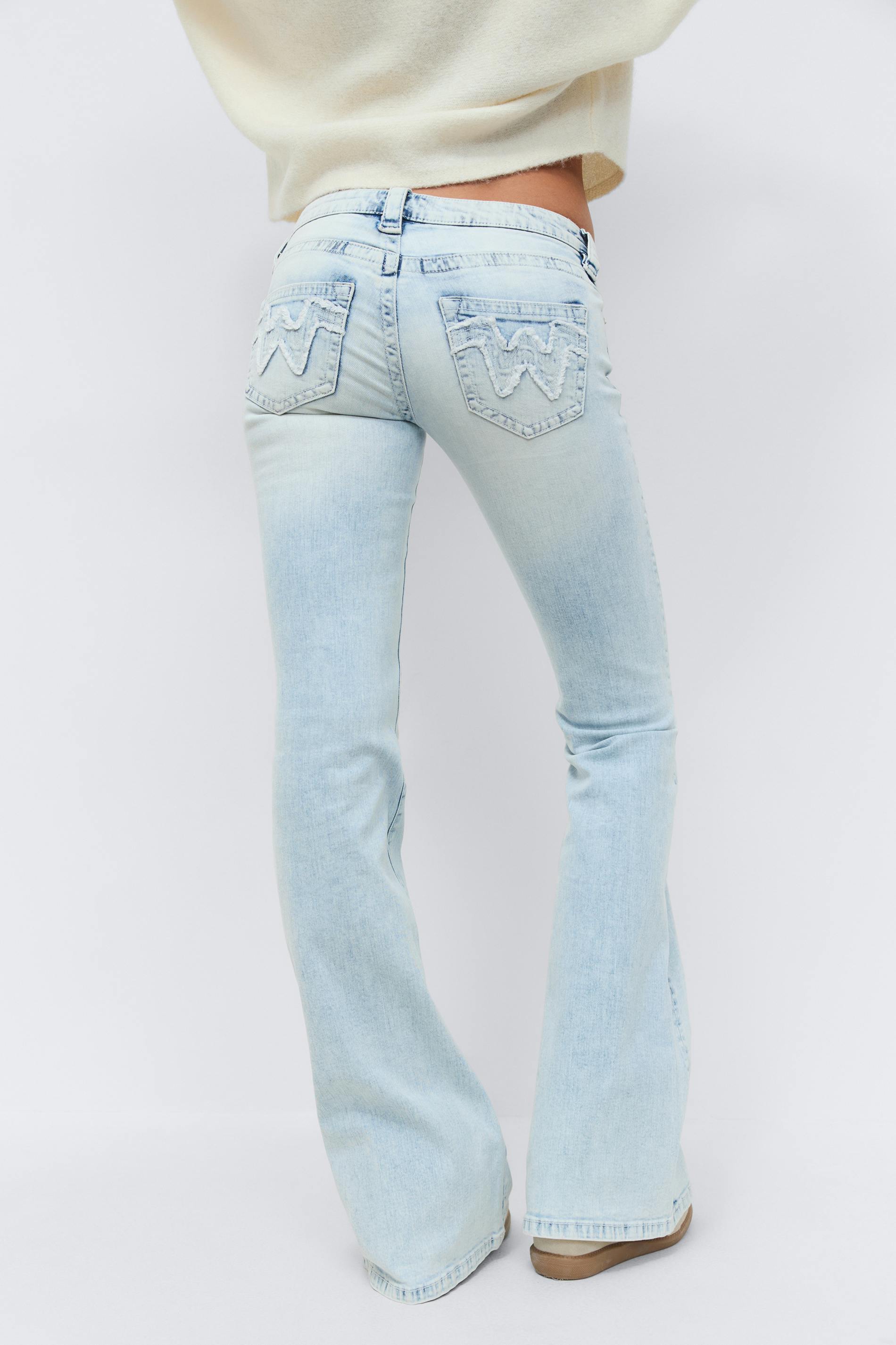 Bootcut jeans med låg midja. Jeansen är ljusblåa och har utsvängda ben. De har bälteshällor, dragkedjegylf, framfickor och broderade bakfickor.