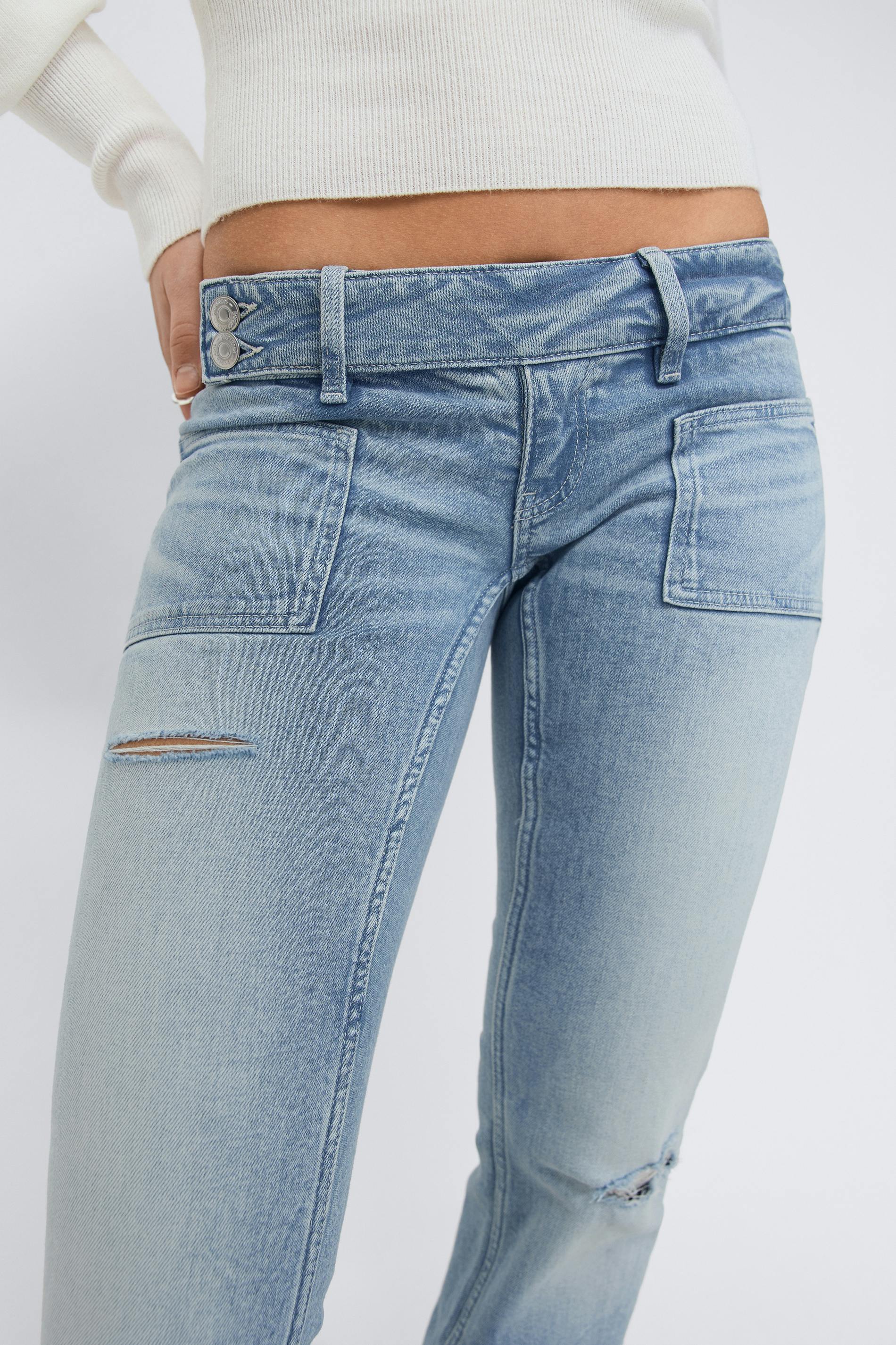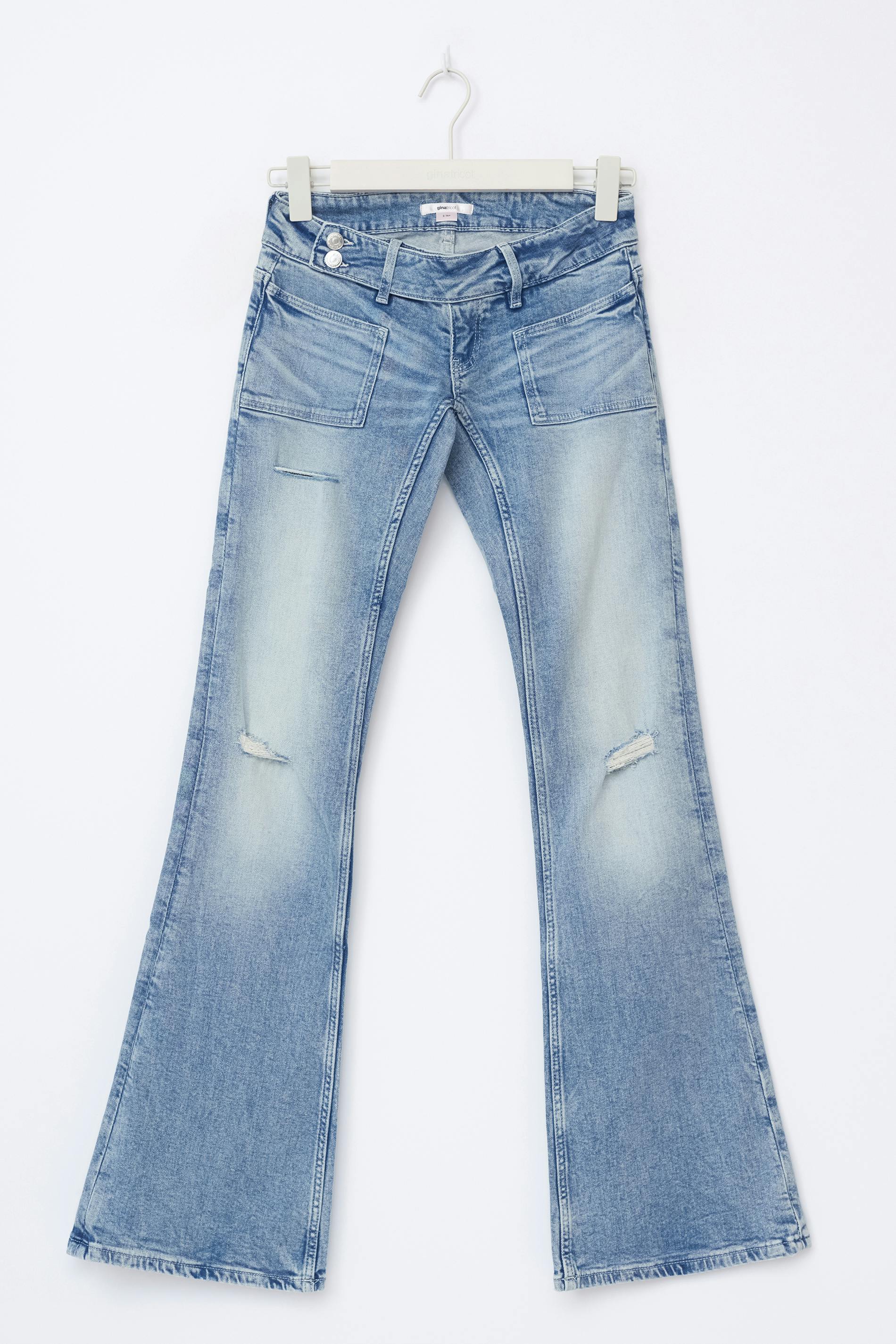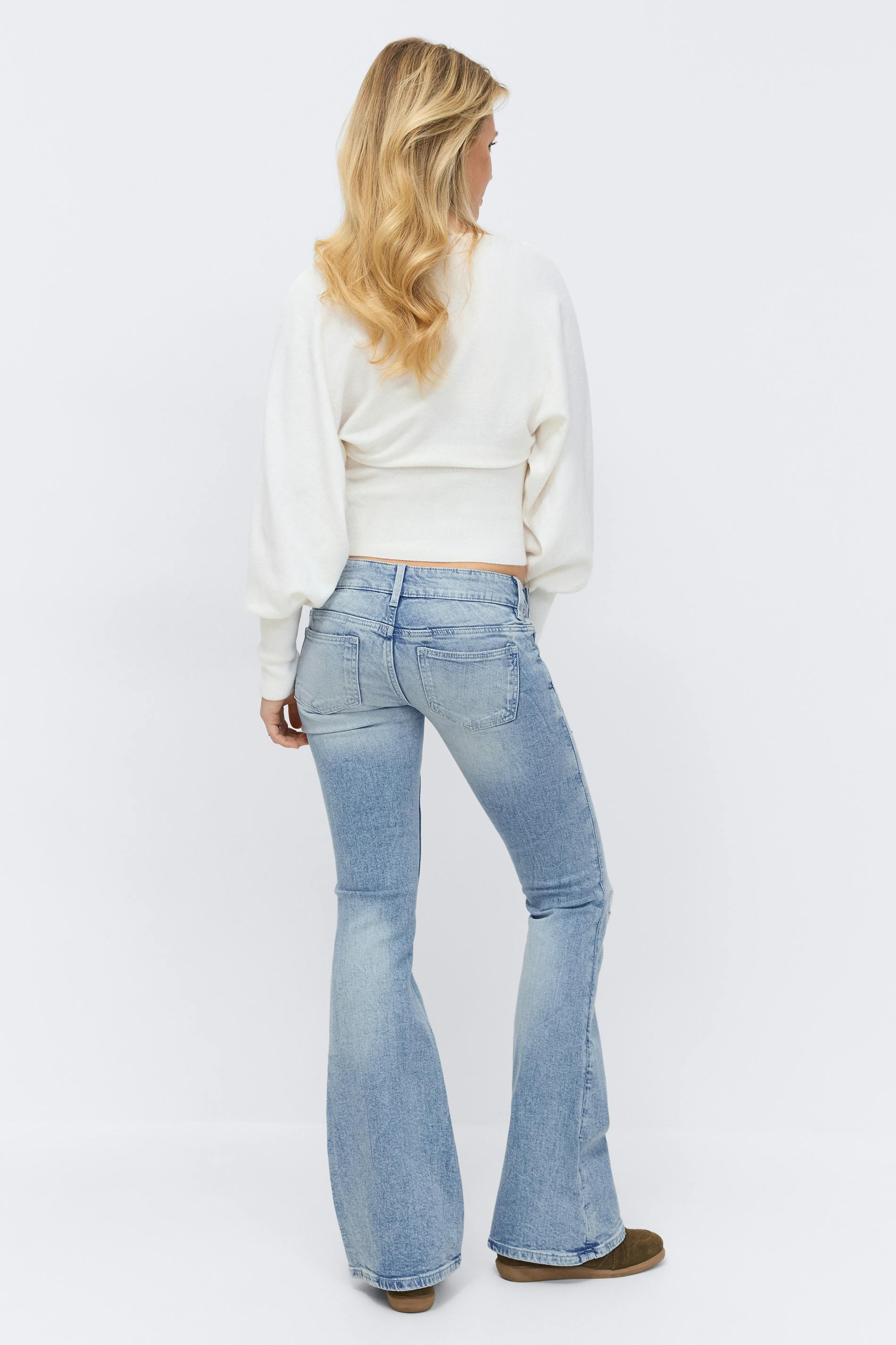 Flare jeans med låg midja. Jeansen är ljusblåa och har påsydda framfickor. De har låg stretch, bakfickor och utsvängda ben med normallängd.