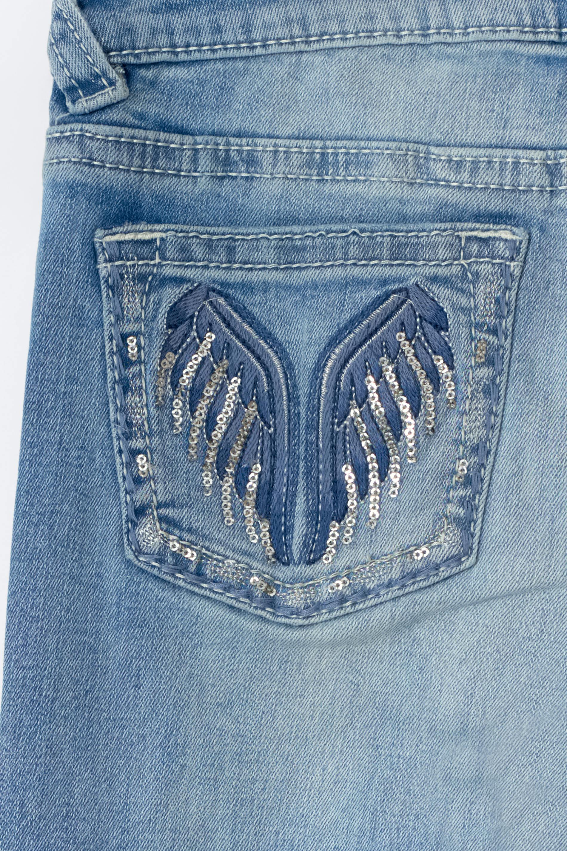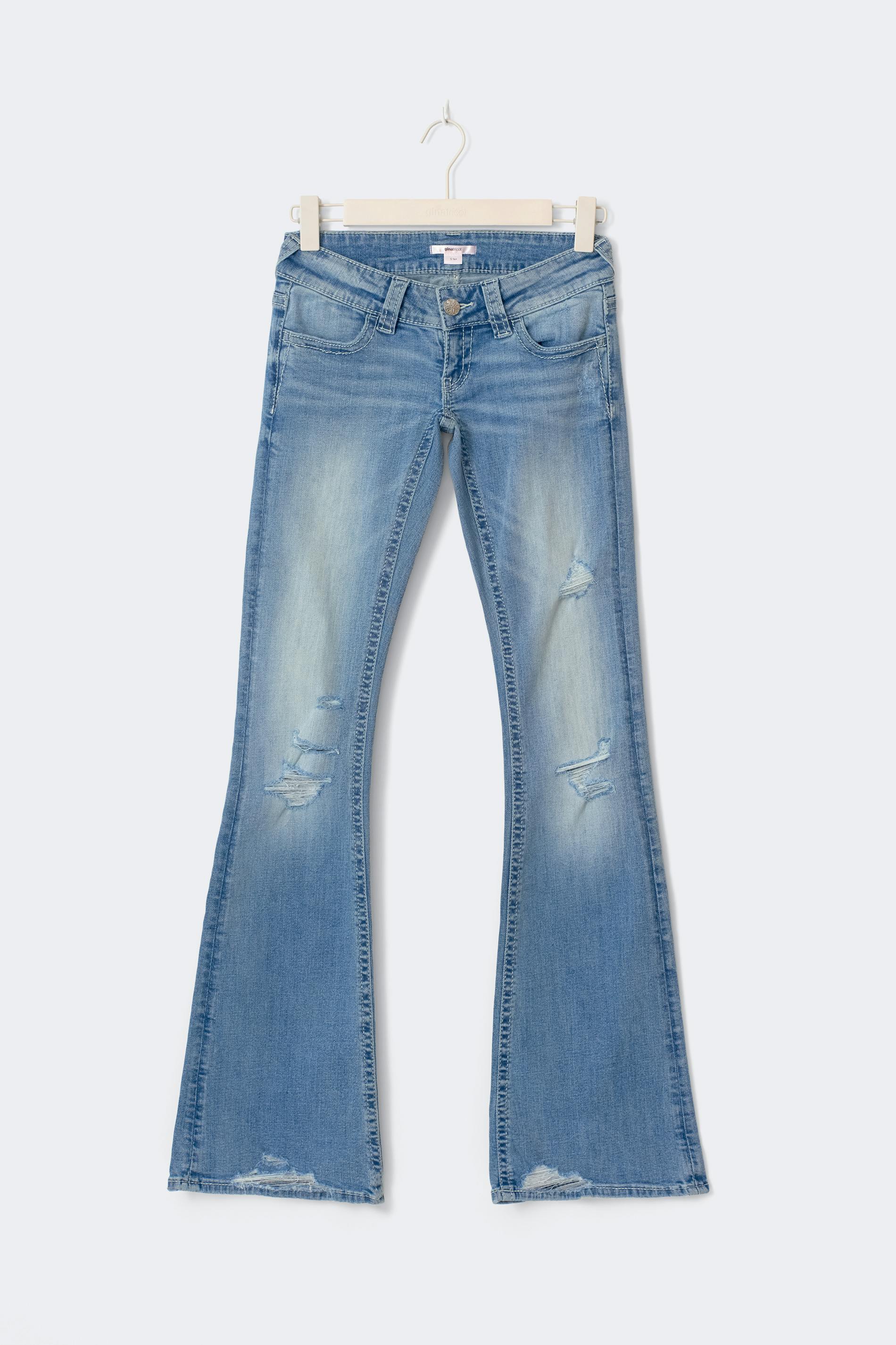 Tall flare jeans med bakfickor med paljettbroderade vingar. Jeansen är blåa och har låg midja. De har slitningar på framsidan, extra långa, utsvängda ben, dragkedjegylf, bälteshällor, fickor fram och bak, normal passform och låg stretch. Se gärna vår stor