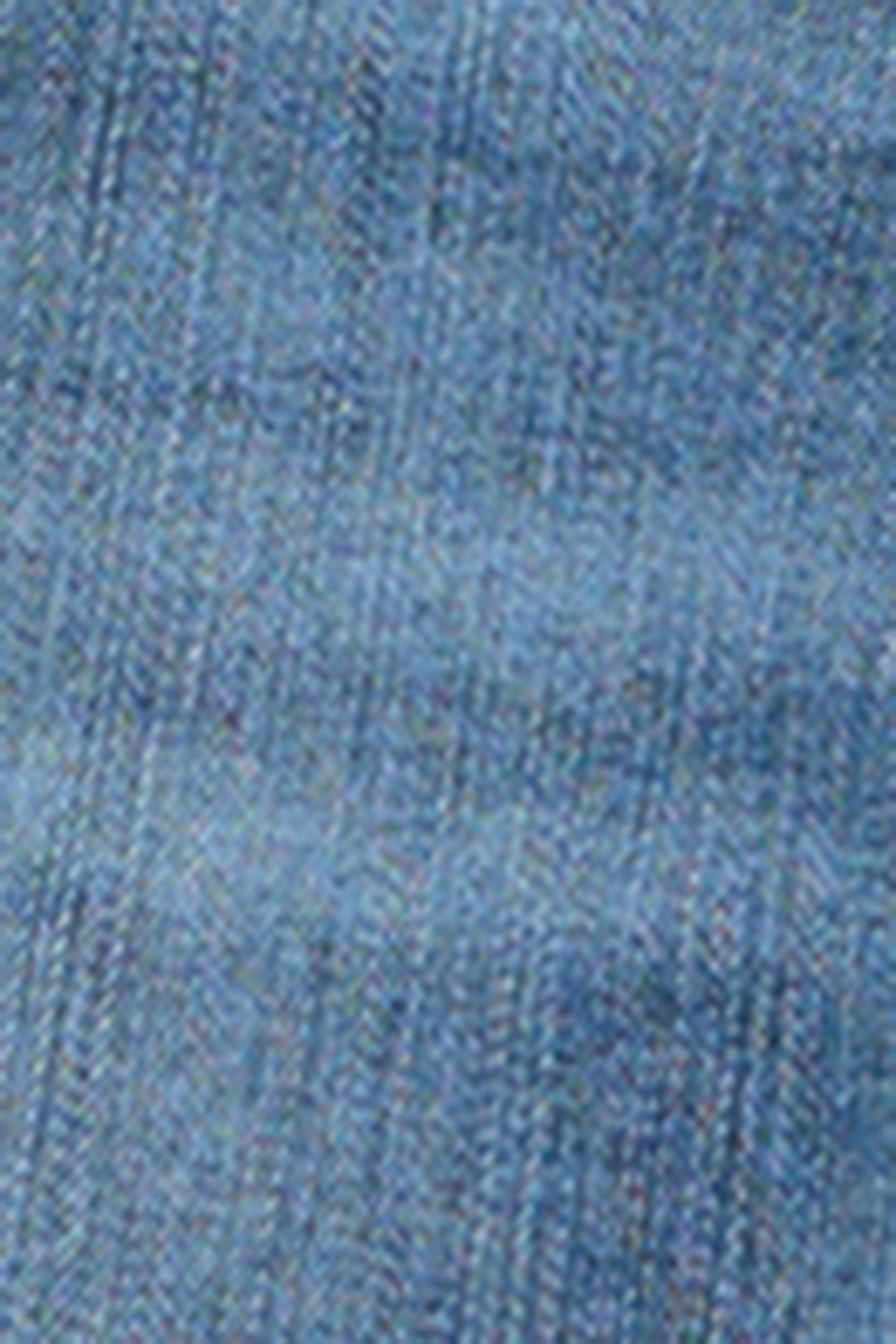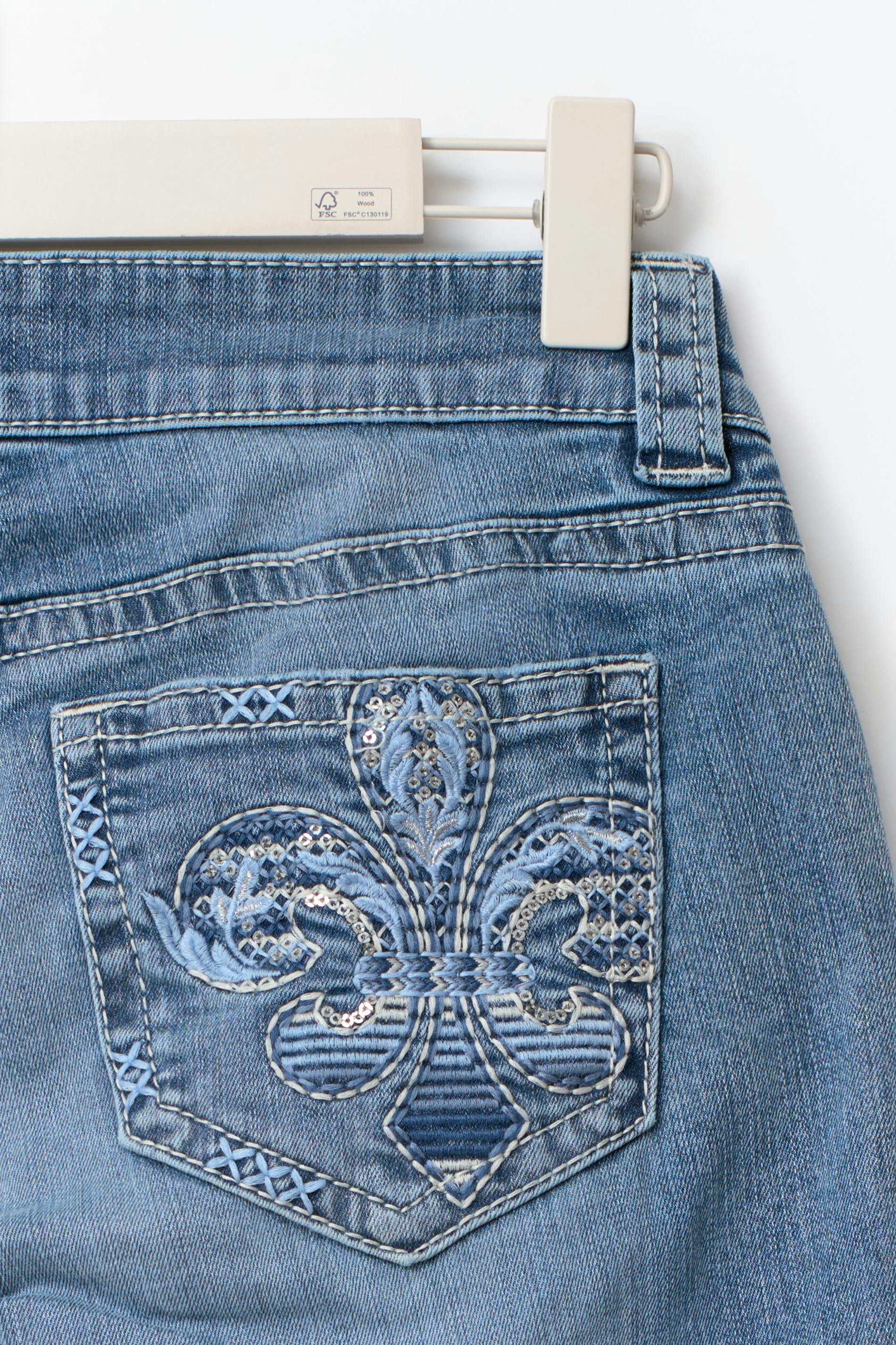 Flare jeans med slitningar. Jeansen är blåa och har låg midja. De har broderade bakfickor med paljetter, låg stretch, utsvängda ben, dragkedjegylf och framfickor.