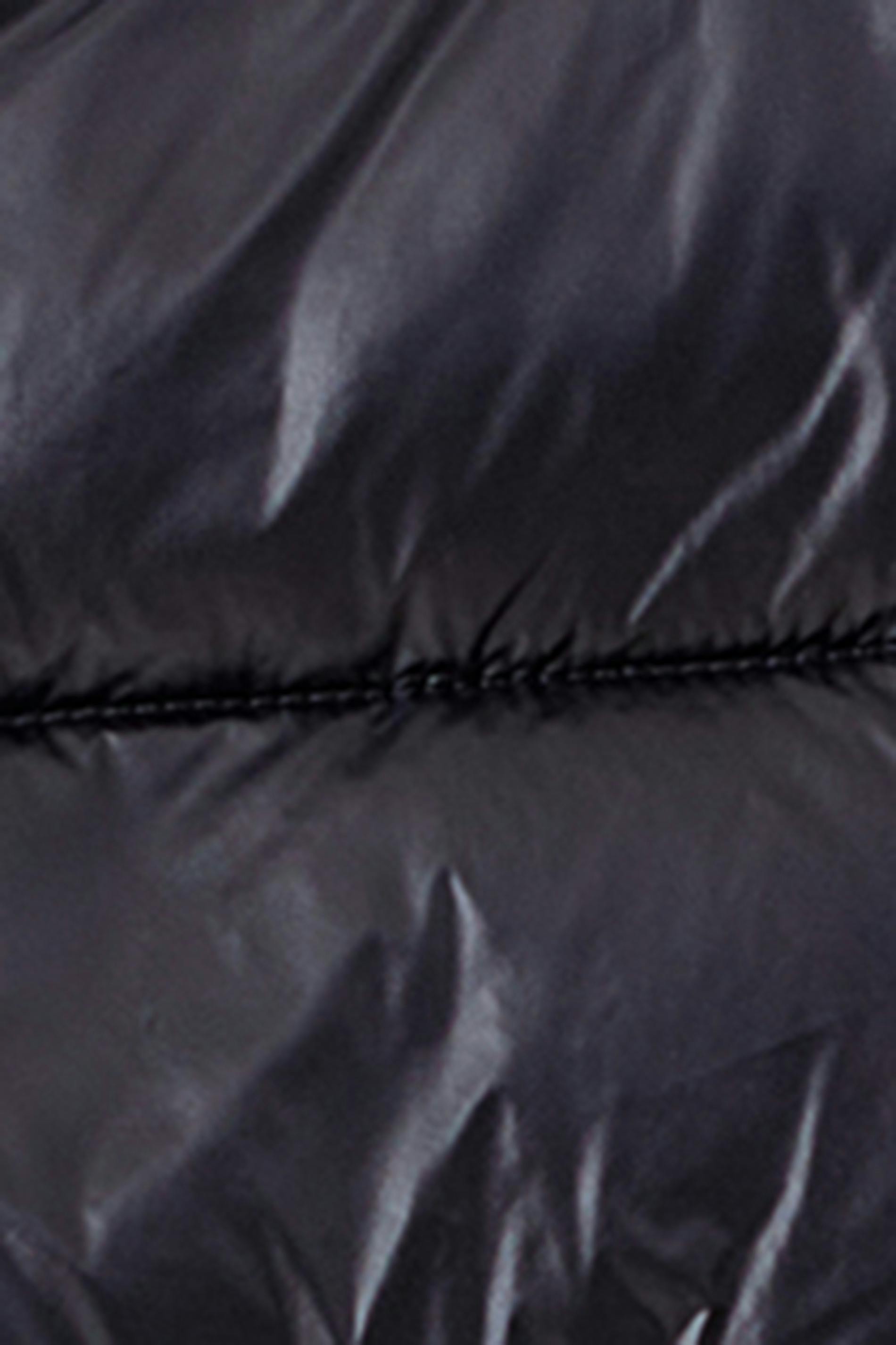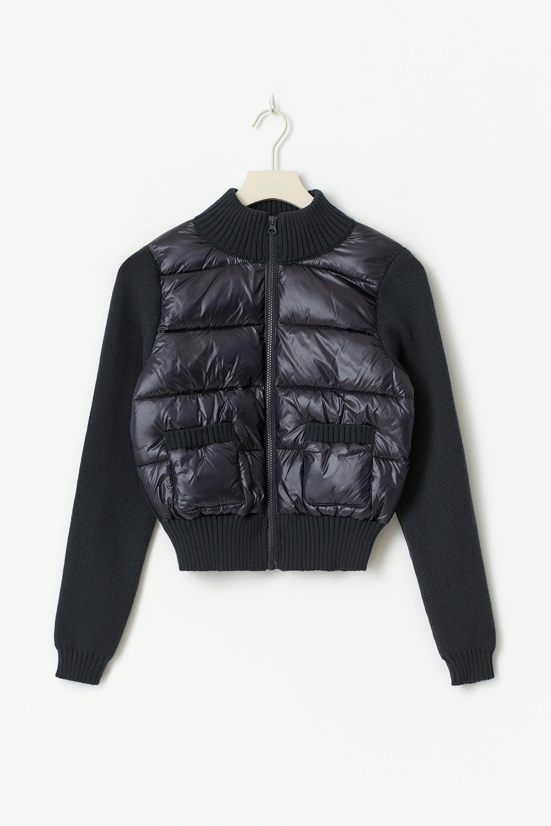 Quiltad lättviktsjacka med stickade ärmar. Jackan är marinblå och har fickor i sidorna. Den har rund halsringning, dragkedja framtill och bred, ribbad mudd vid ärmslut och i nederkant.