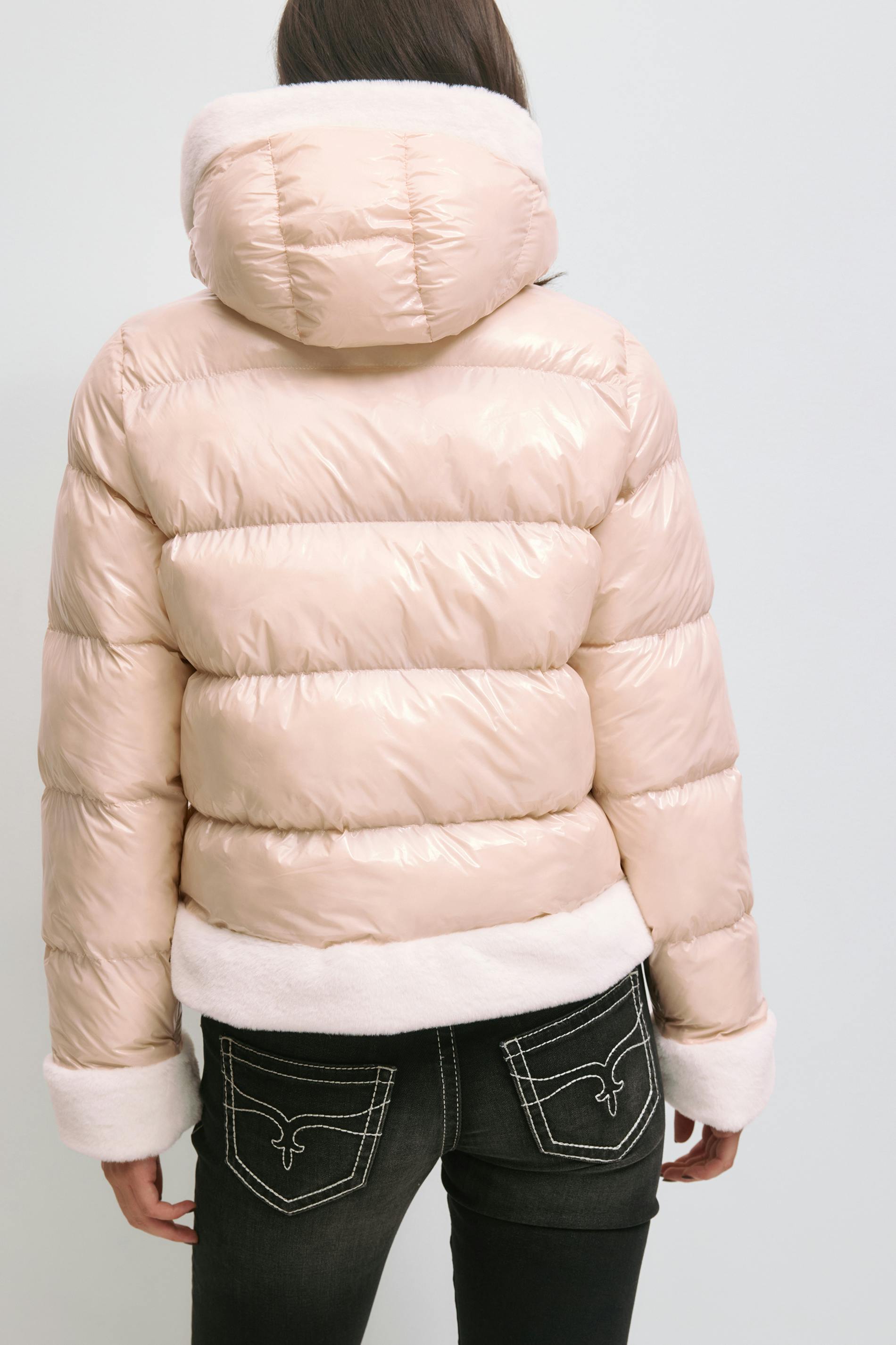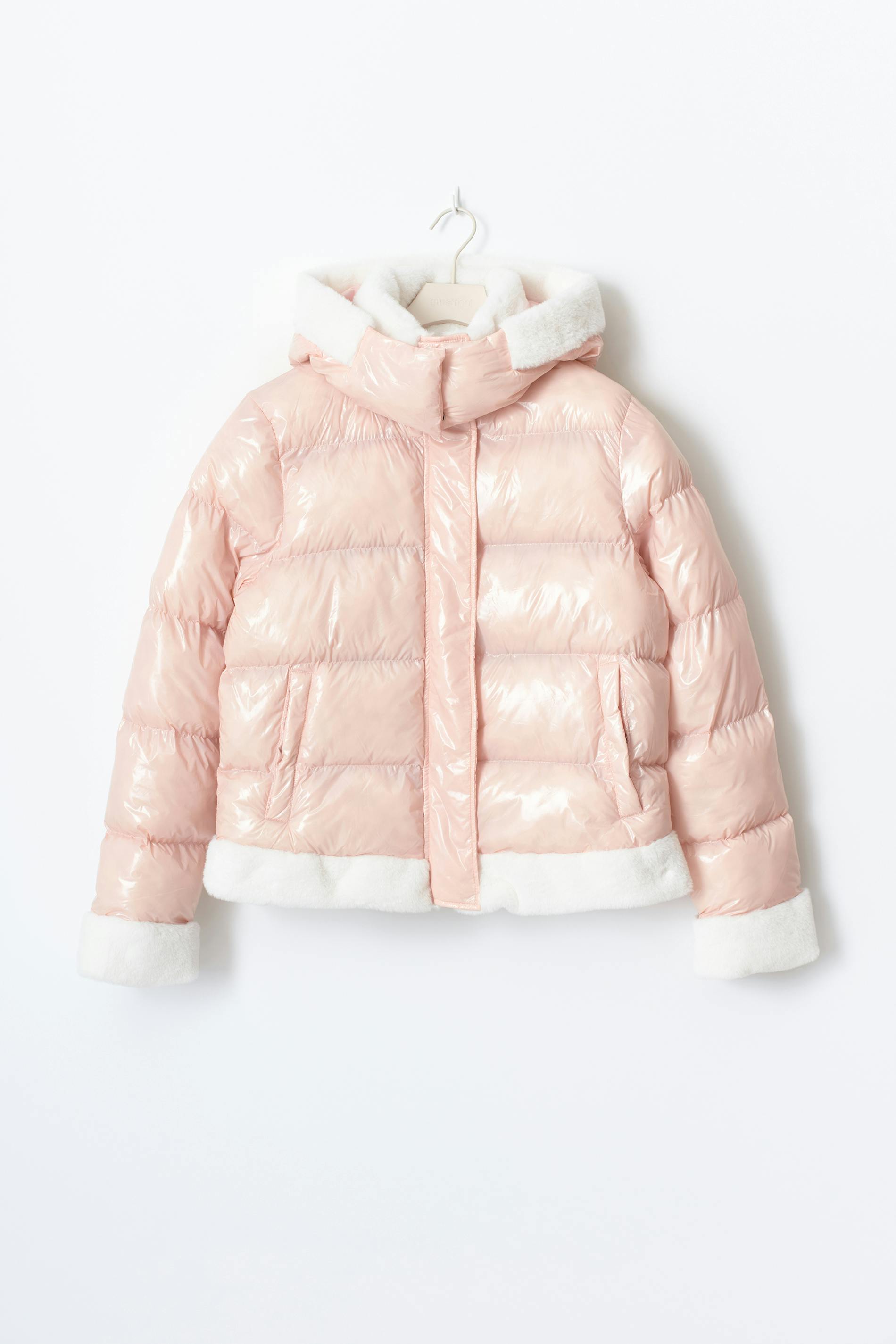Pufferjacka med huva. Jackan är ljusrosa och har fickor i sidan. Den har dragkedjestängning med knäppning, fuskpäls i nederkant, vid huvan, på kragen och vid ärmsluten och en normal passform.
