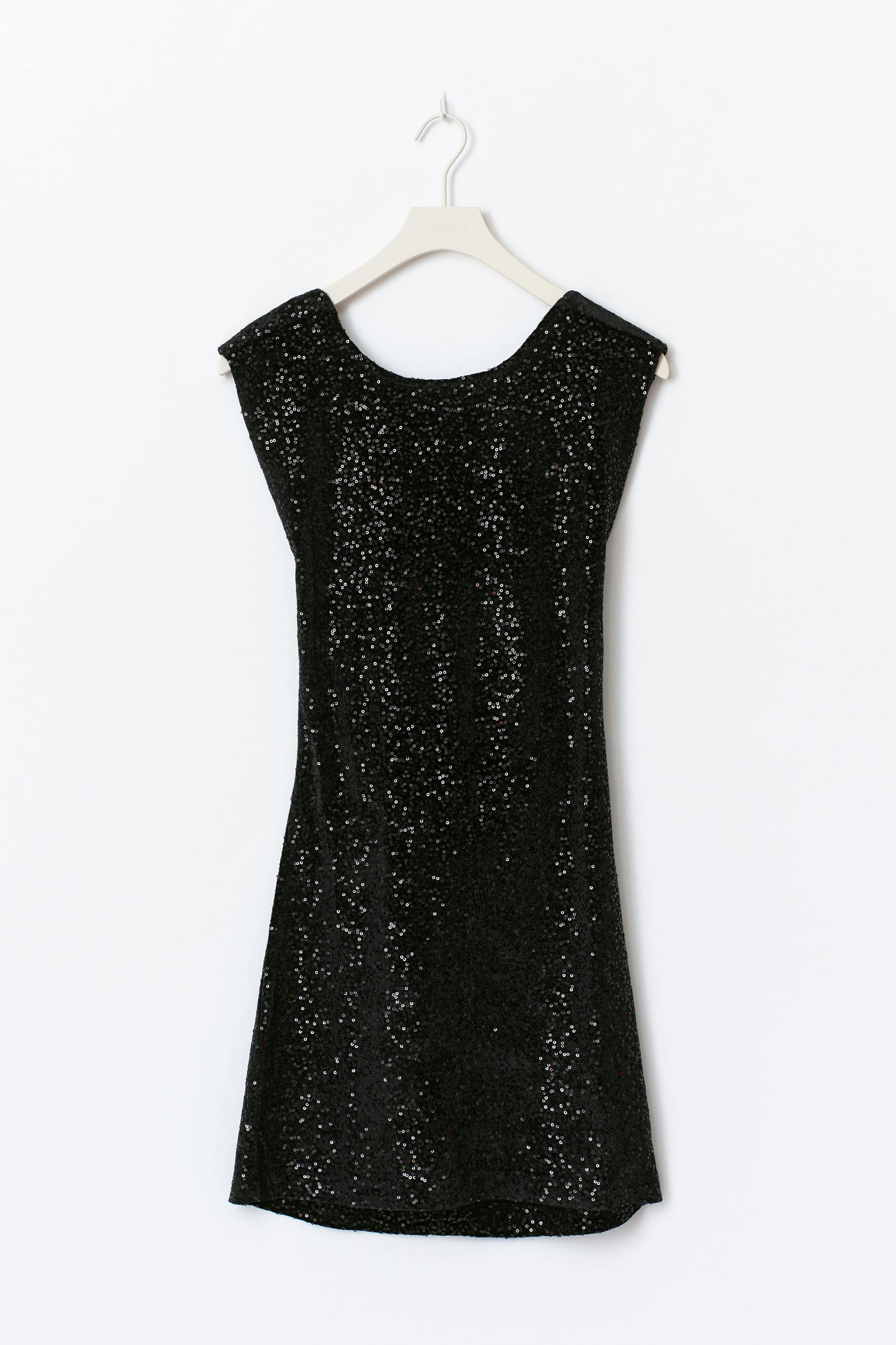 Paljettklänning med en kort ärm. Klänningen är svart och har en båtringning. Den har en kort figurnära passform, dragkedjestängning och en öppen rygg.
