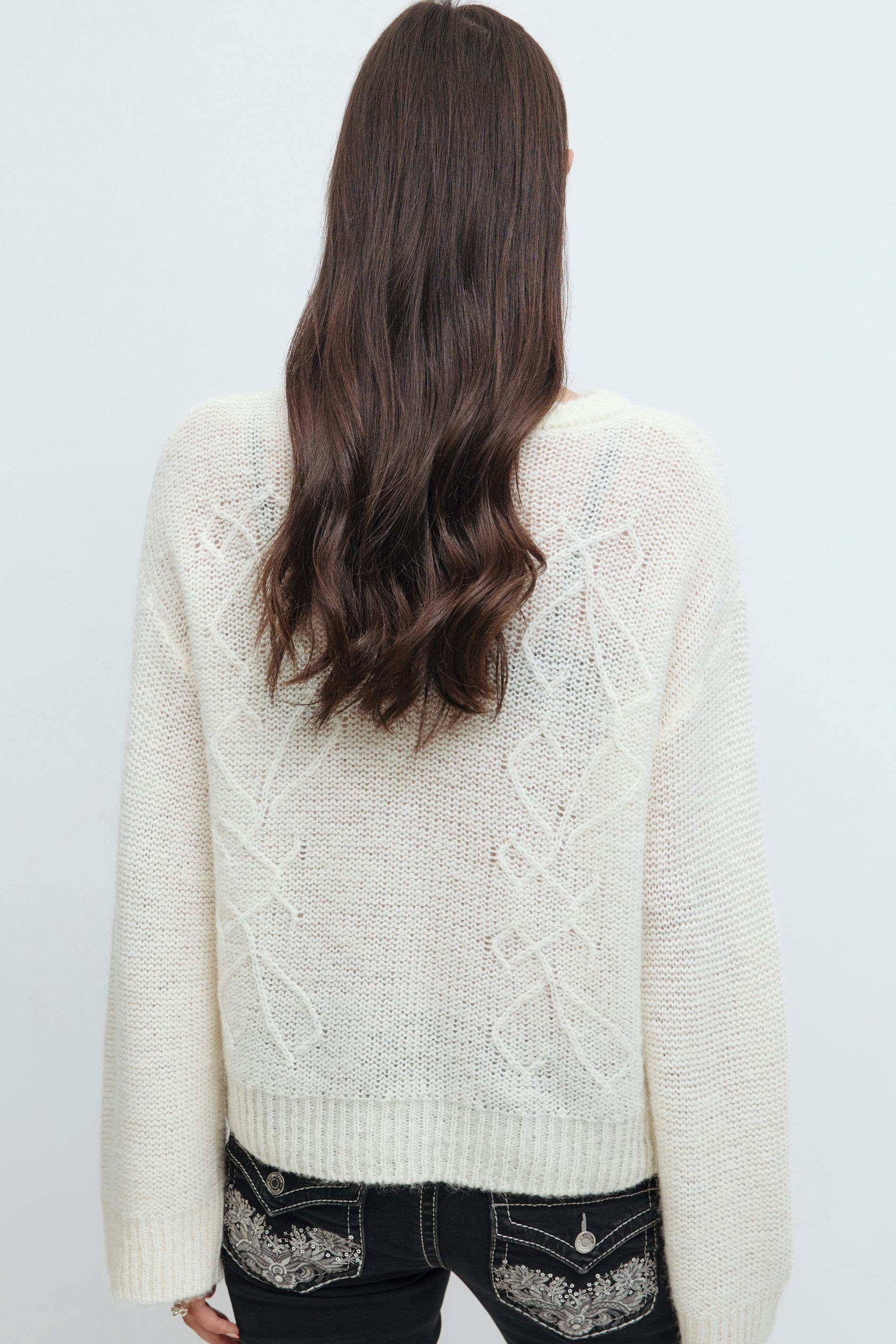 Knit with a decorative fine knit at the front and at the back. The knit is off-white and has a round neck in ribbed quality. It has a ribbed cuff on the sleeve ends and at the bottom and a loose-fitting style.