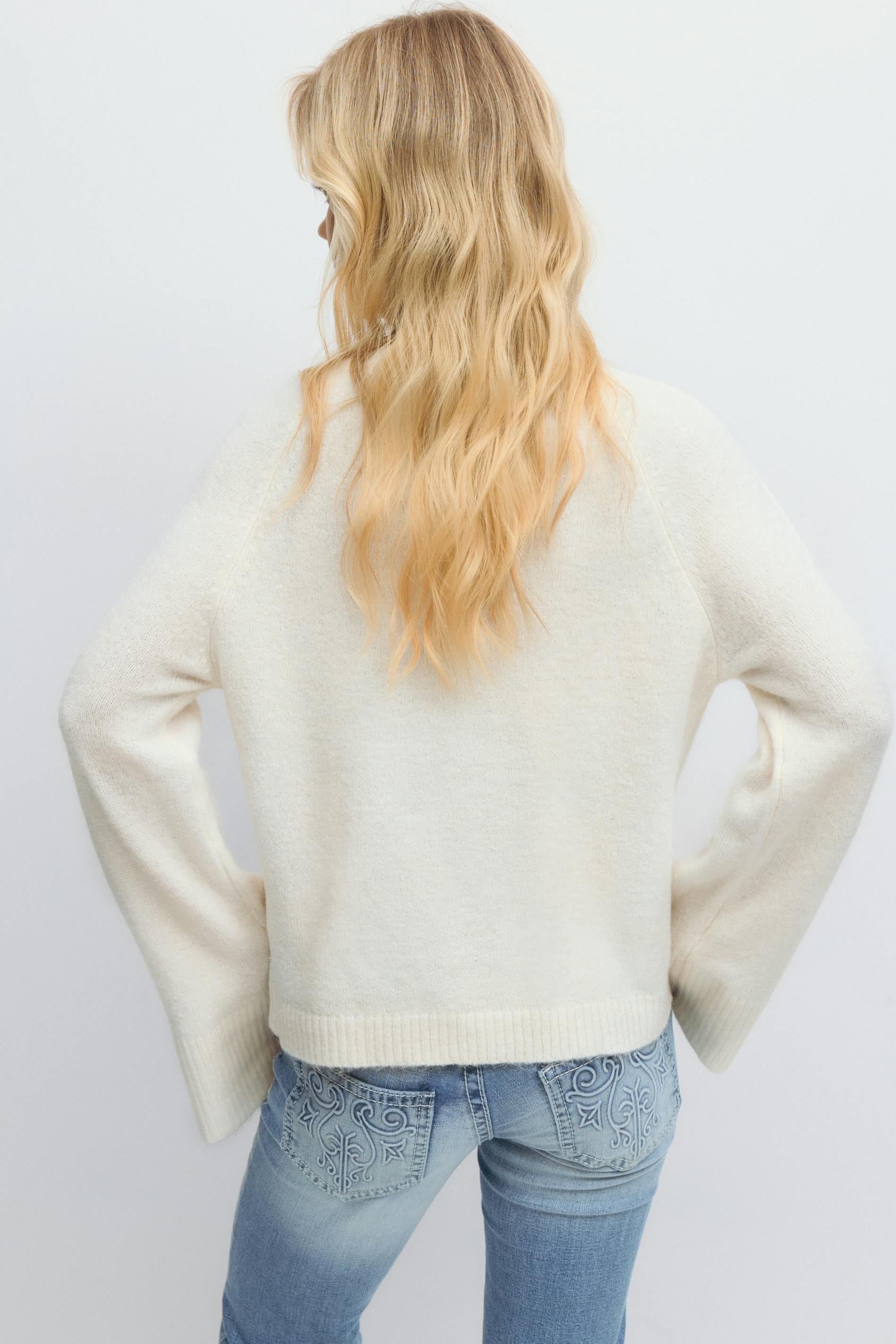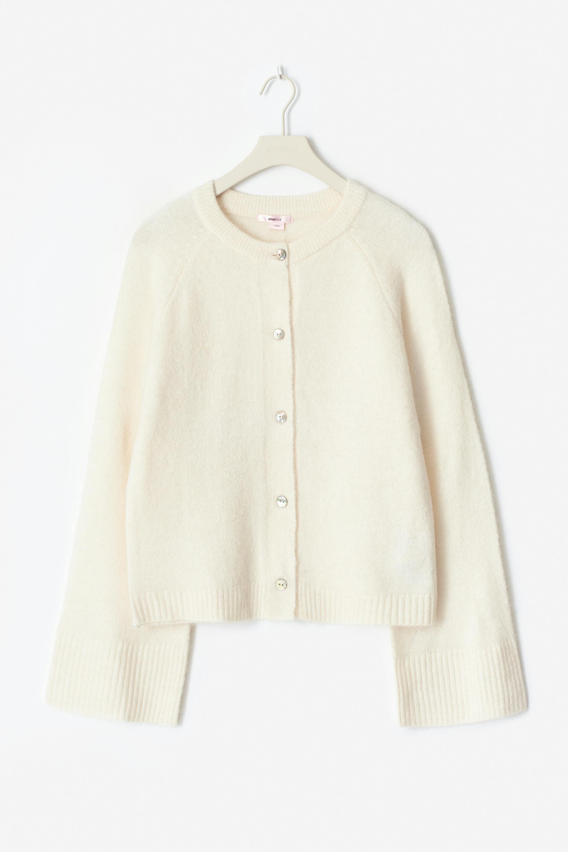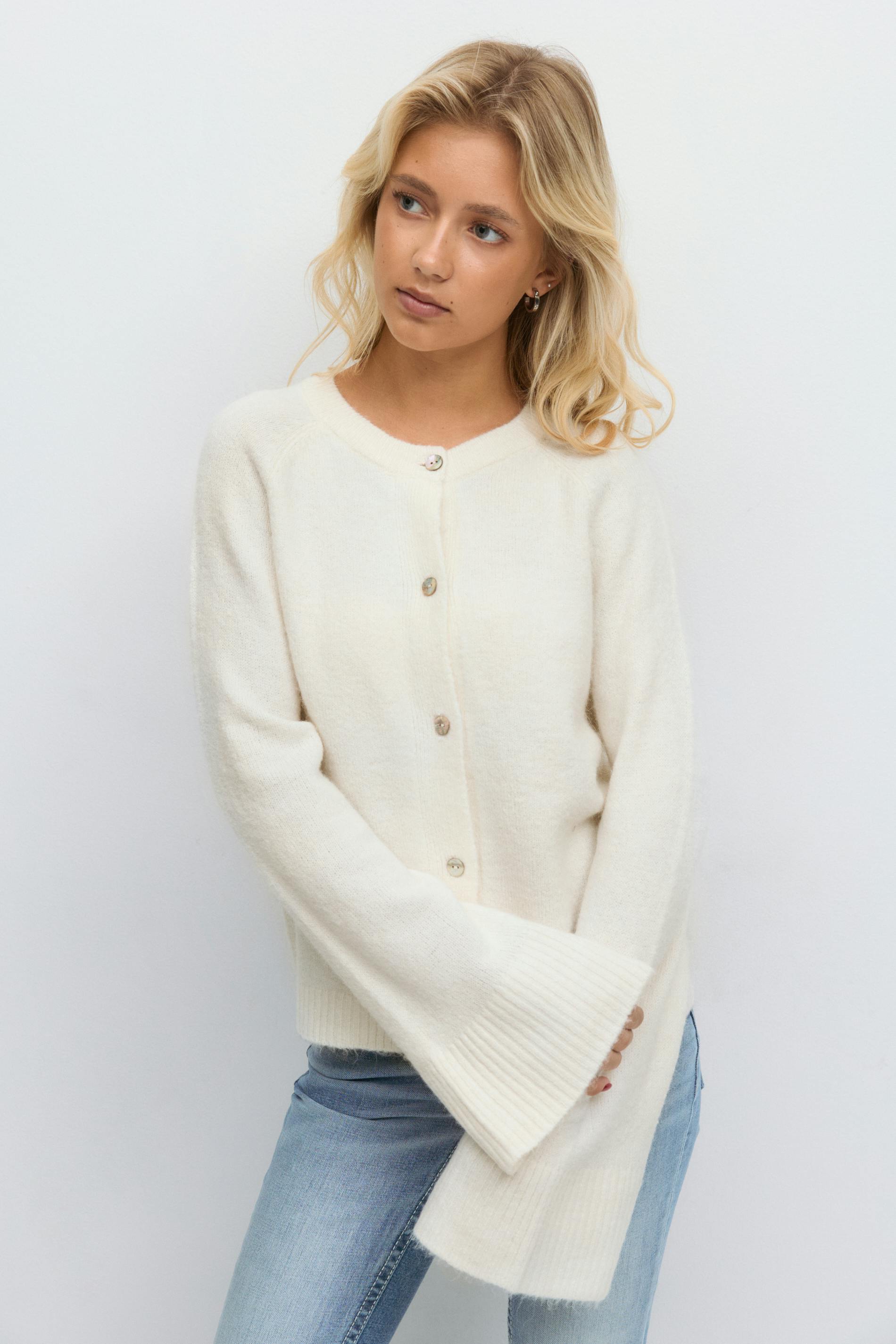 Stickad kofta i ullmix med knappar. Cardigan är vit och har rund halsringning. Den har normal passform, långa ärmar och ribbstickning.