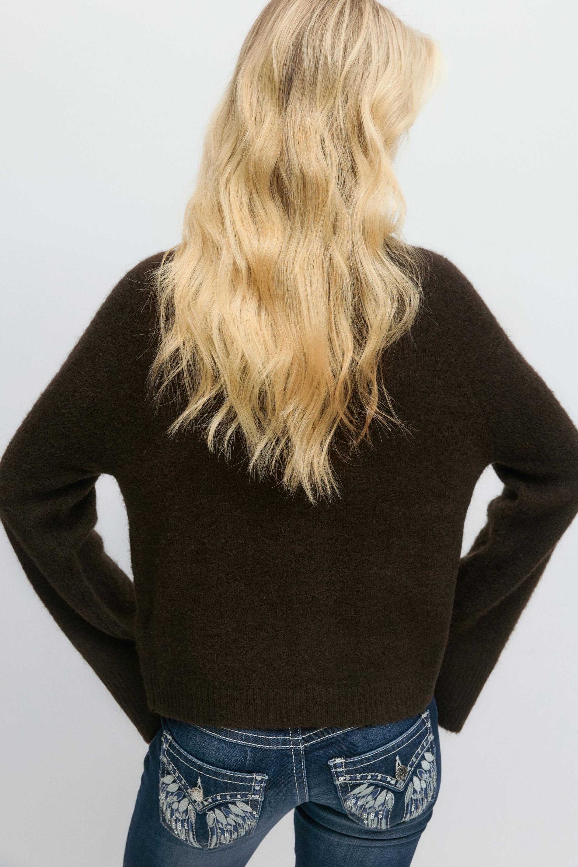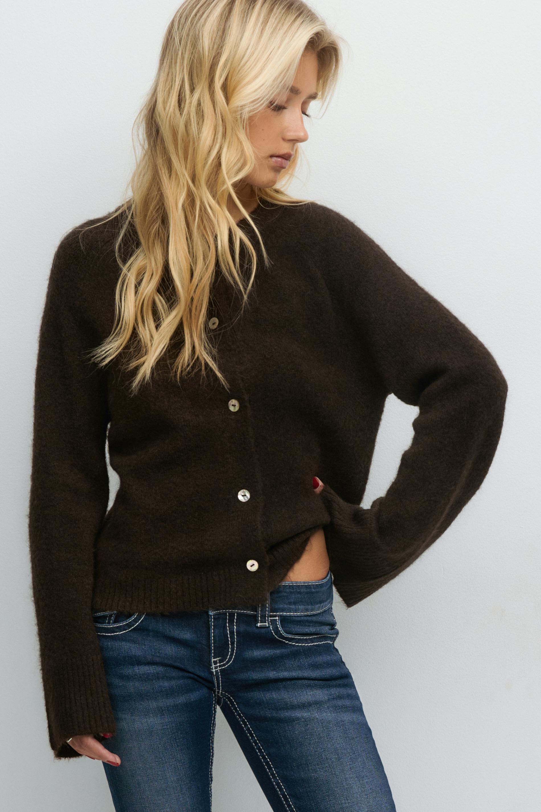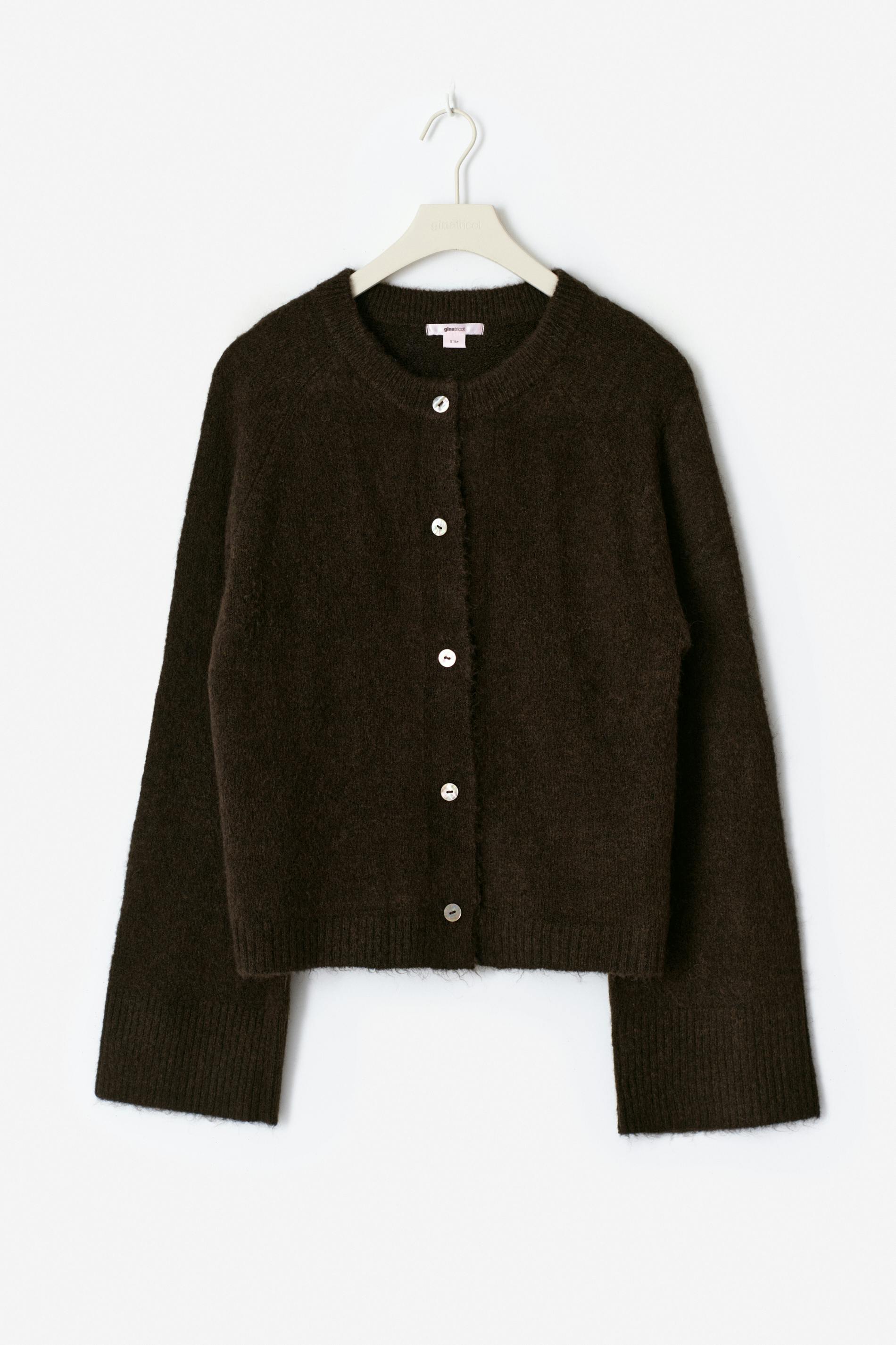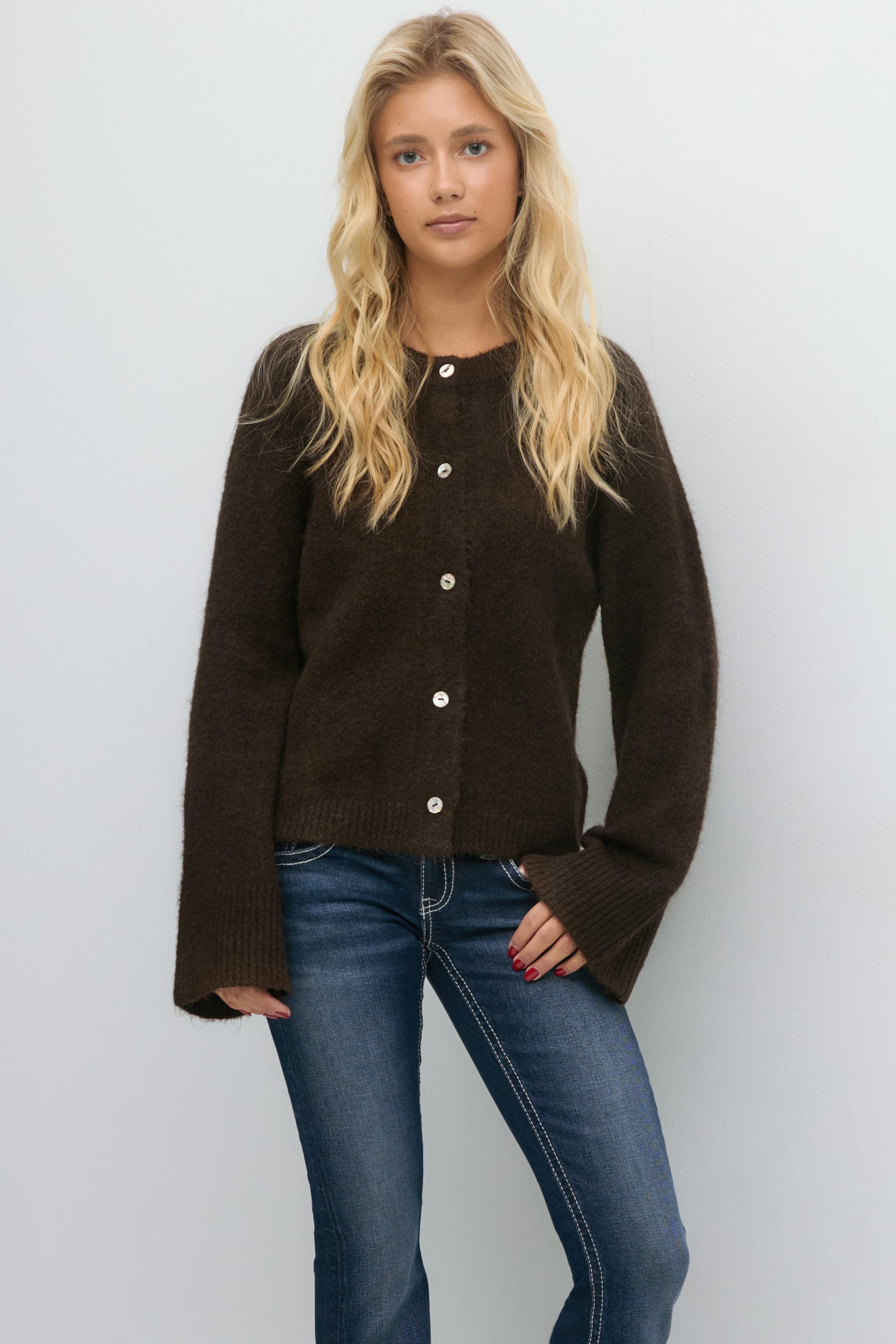Stickad kofta i ullmix med knappar. Cardigan är brun och har rund halsringning. Den har normal passform, långa ärmar och ribbstickning.