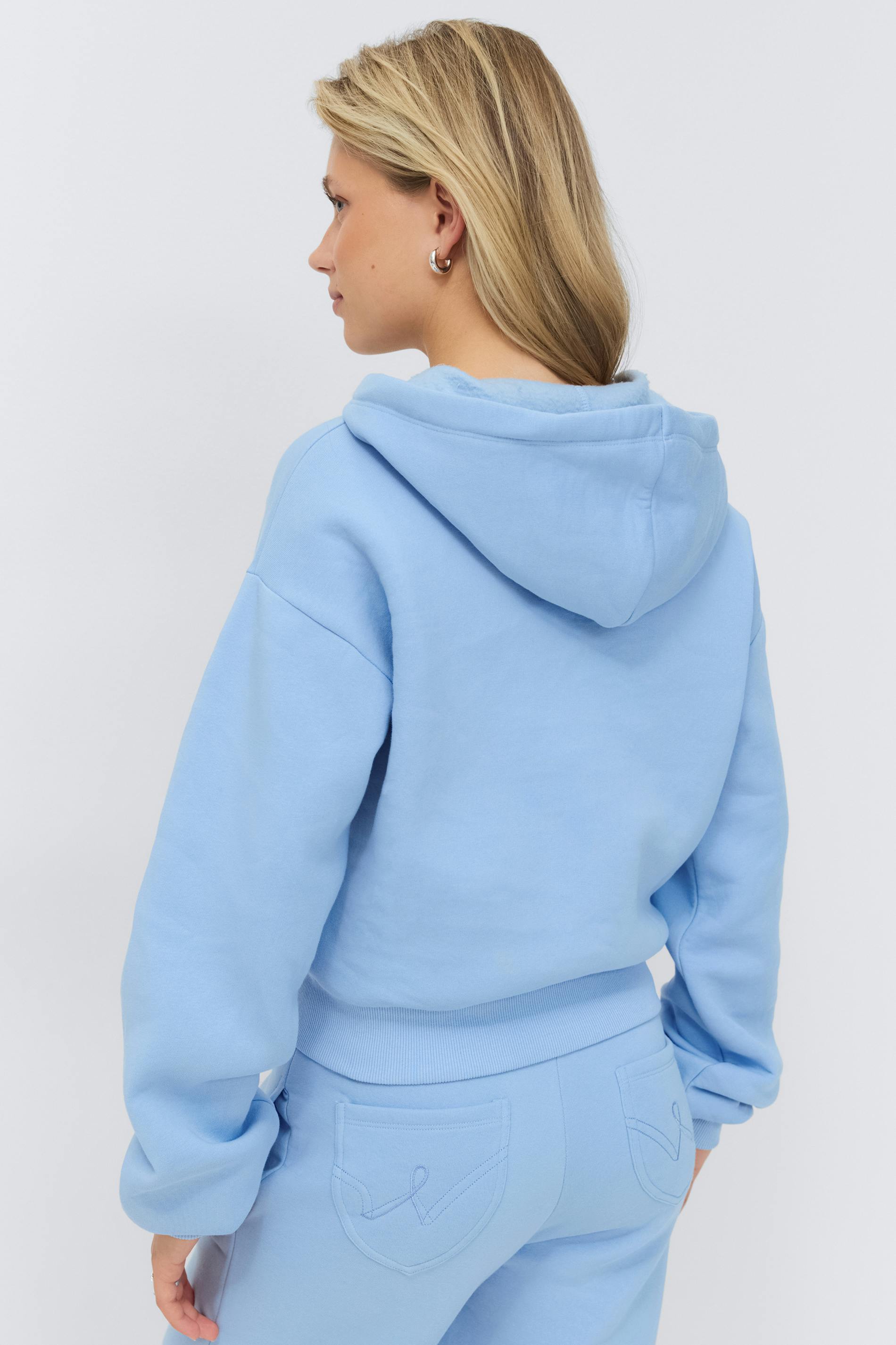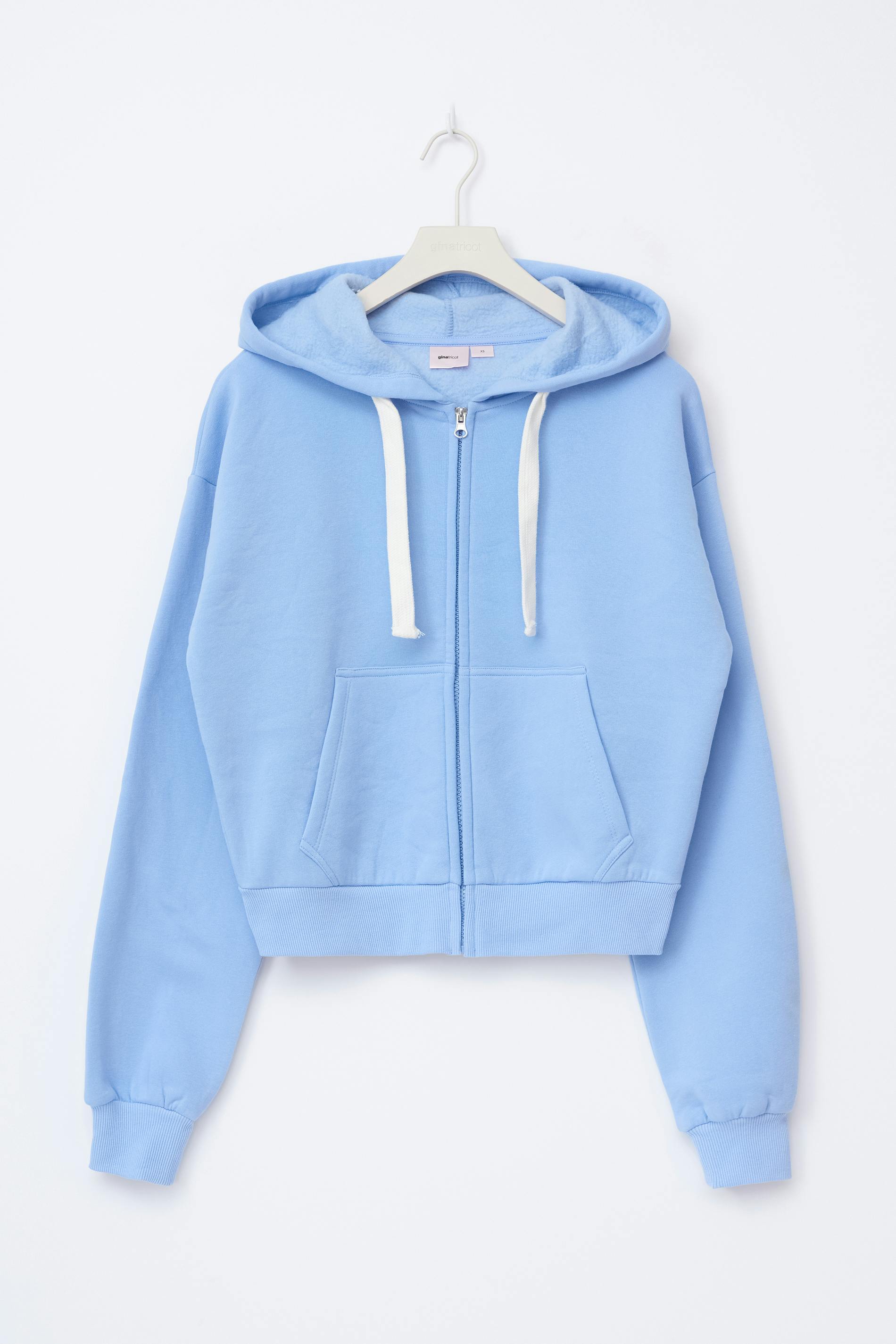 Huvtröja med dragkedja fram. Tröjan är blå och har huva med dragsko. Den har fickor framtill, ribbad mudd vid ärmslut och i nederkant, mjukt tyg och generös passform.