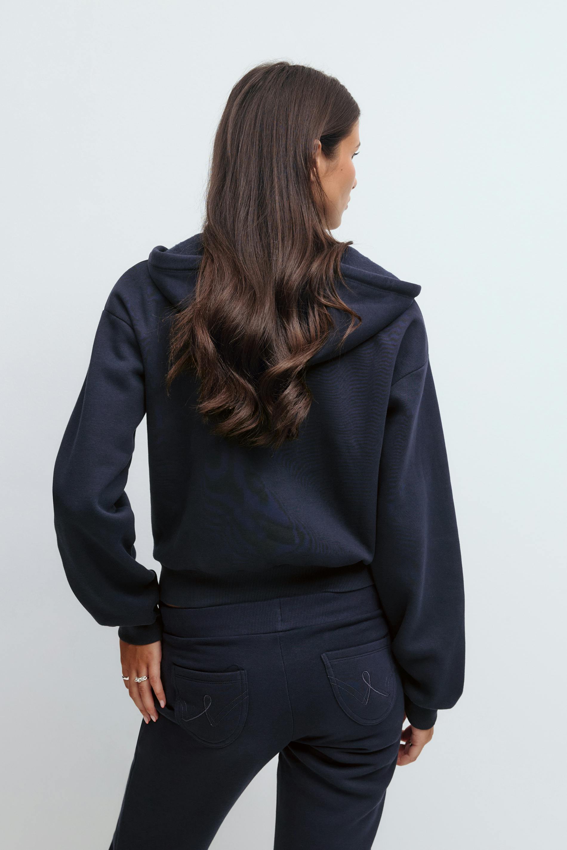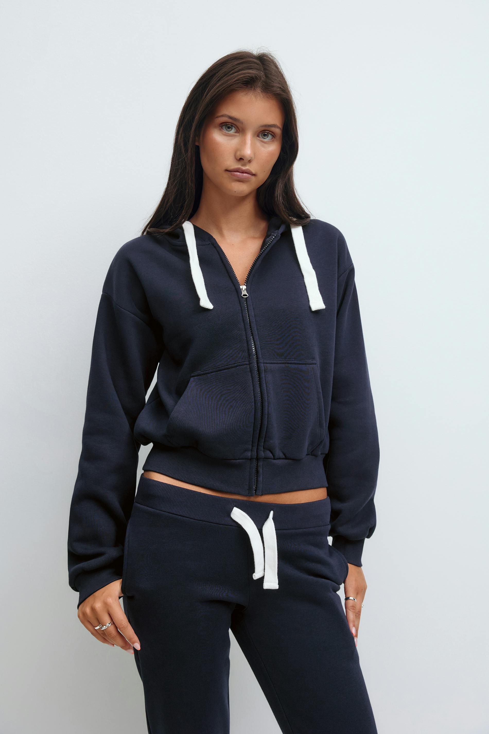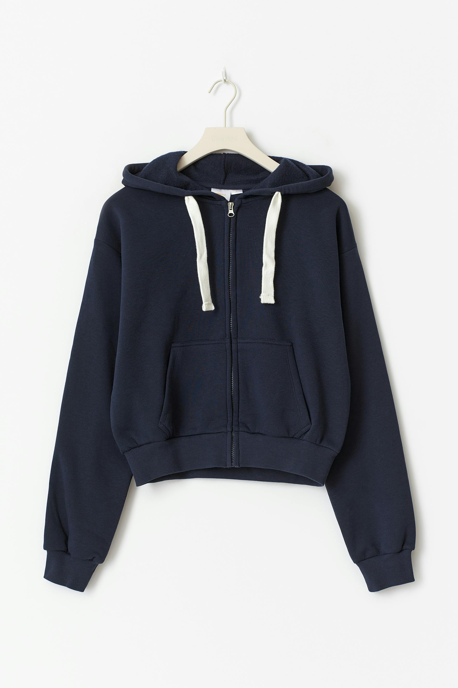 Huvtröja med dragkedja fram. Tröjan är marinblå och har huva med dragsko. Den har fickor framtill, ribbad mudd vid ärmslut och i nederkant, mjukt tyg och generös passform.