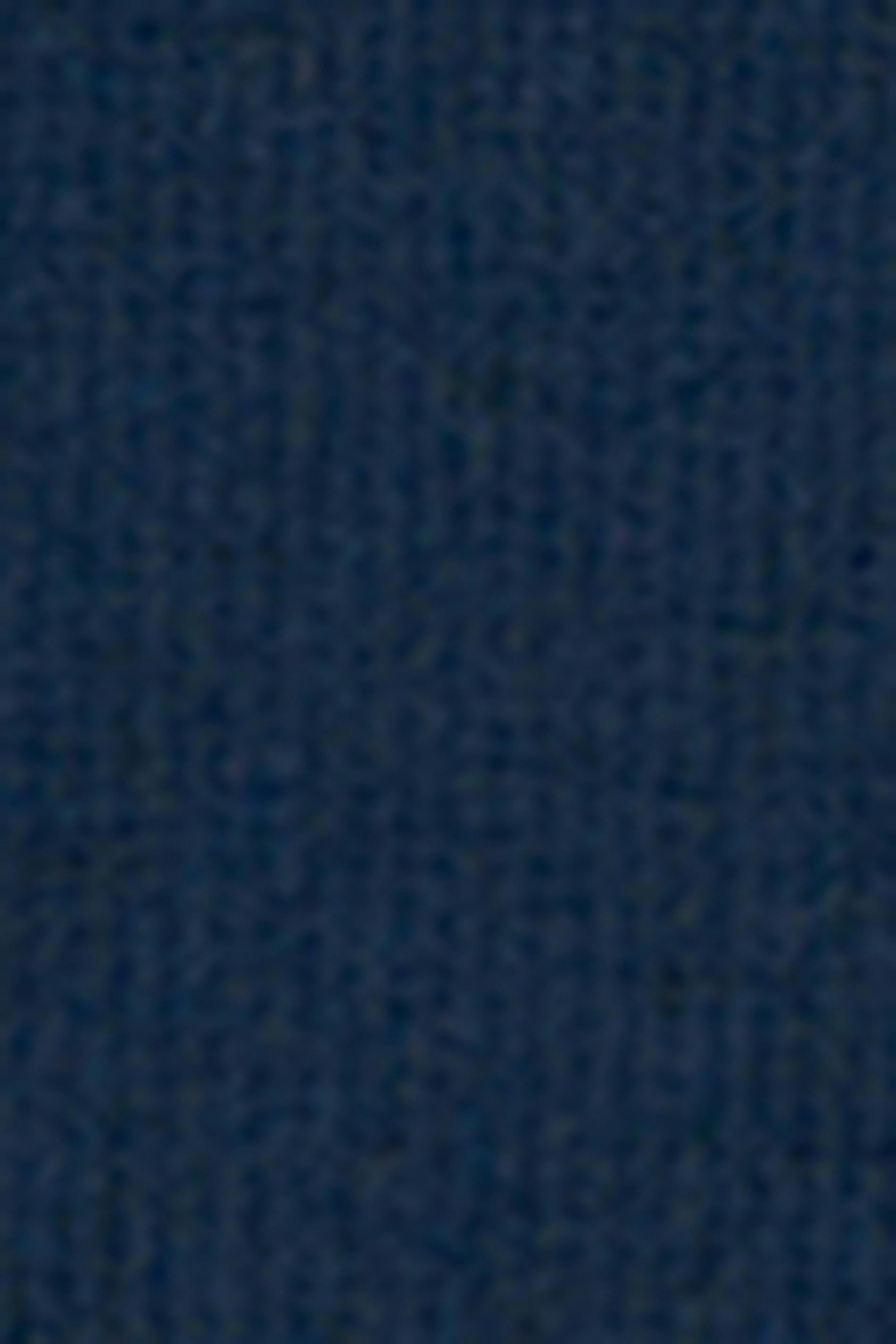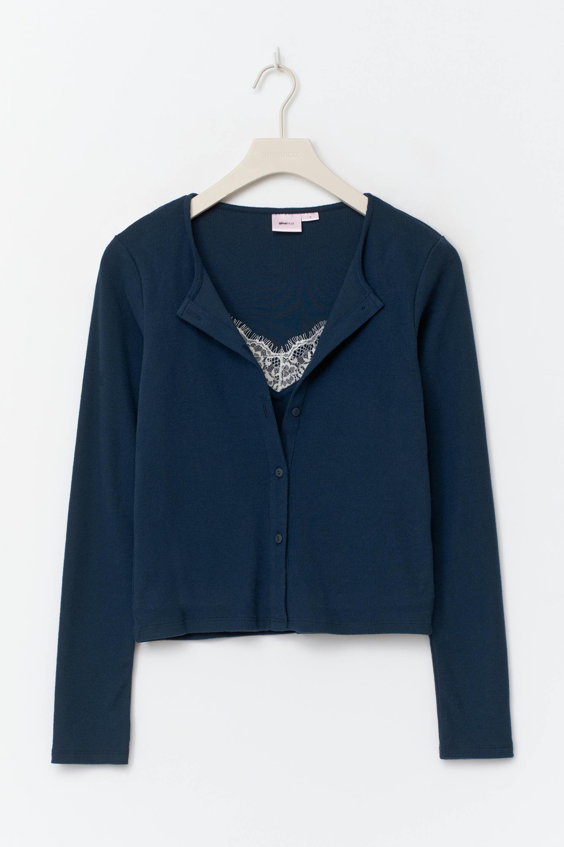 Cardigan med linne. Cardigan är marinblå och har spetsdetalj vid uringningen. Den har knäppning framtill, ärmar och normal storlek.