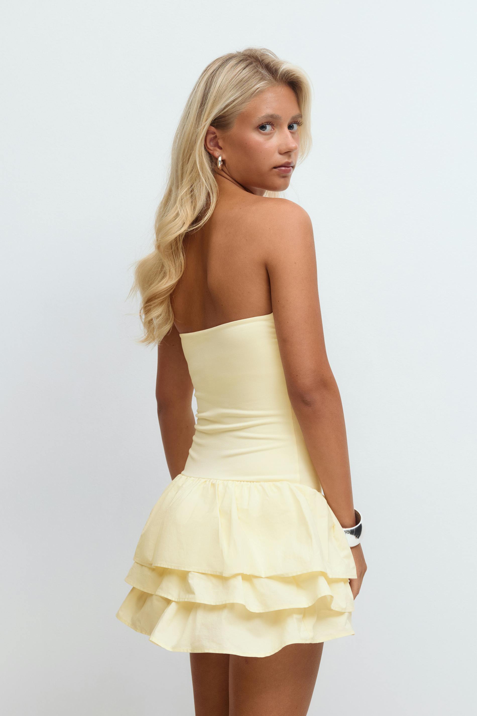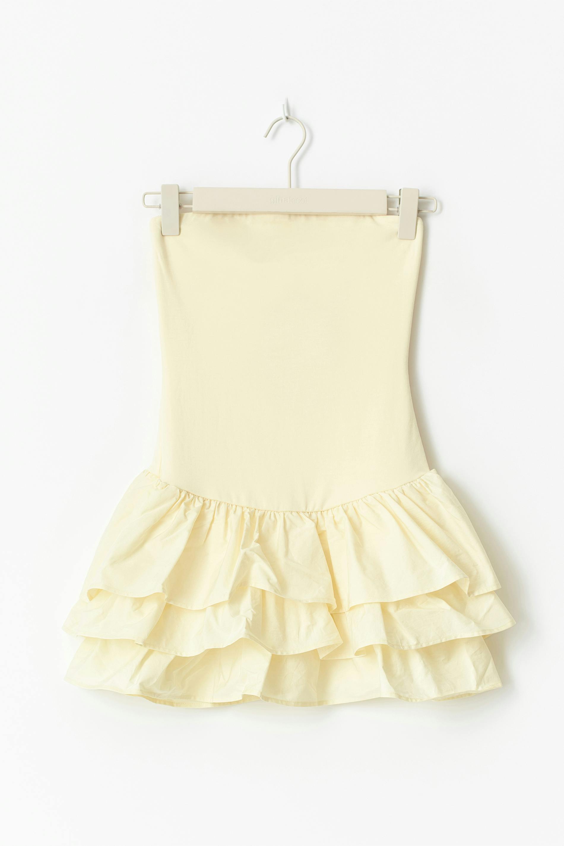 Strapless mini dress with frills at the bottom. The dress is light yellow and has a normal fit.