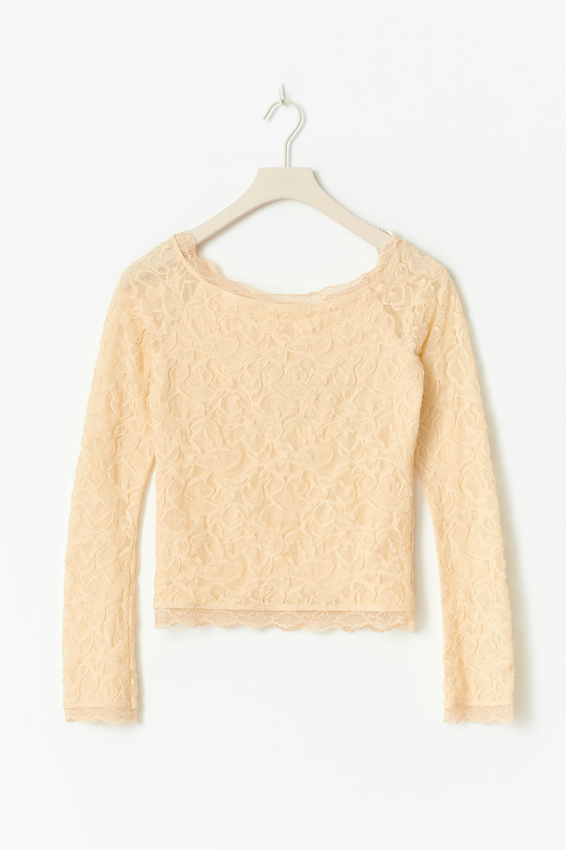 Off shoulder topp i spets med långa ärmar. Toppen är ljusgul och har en normal passform.