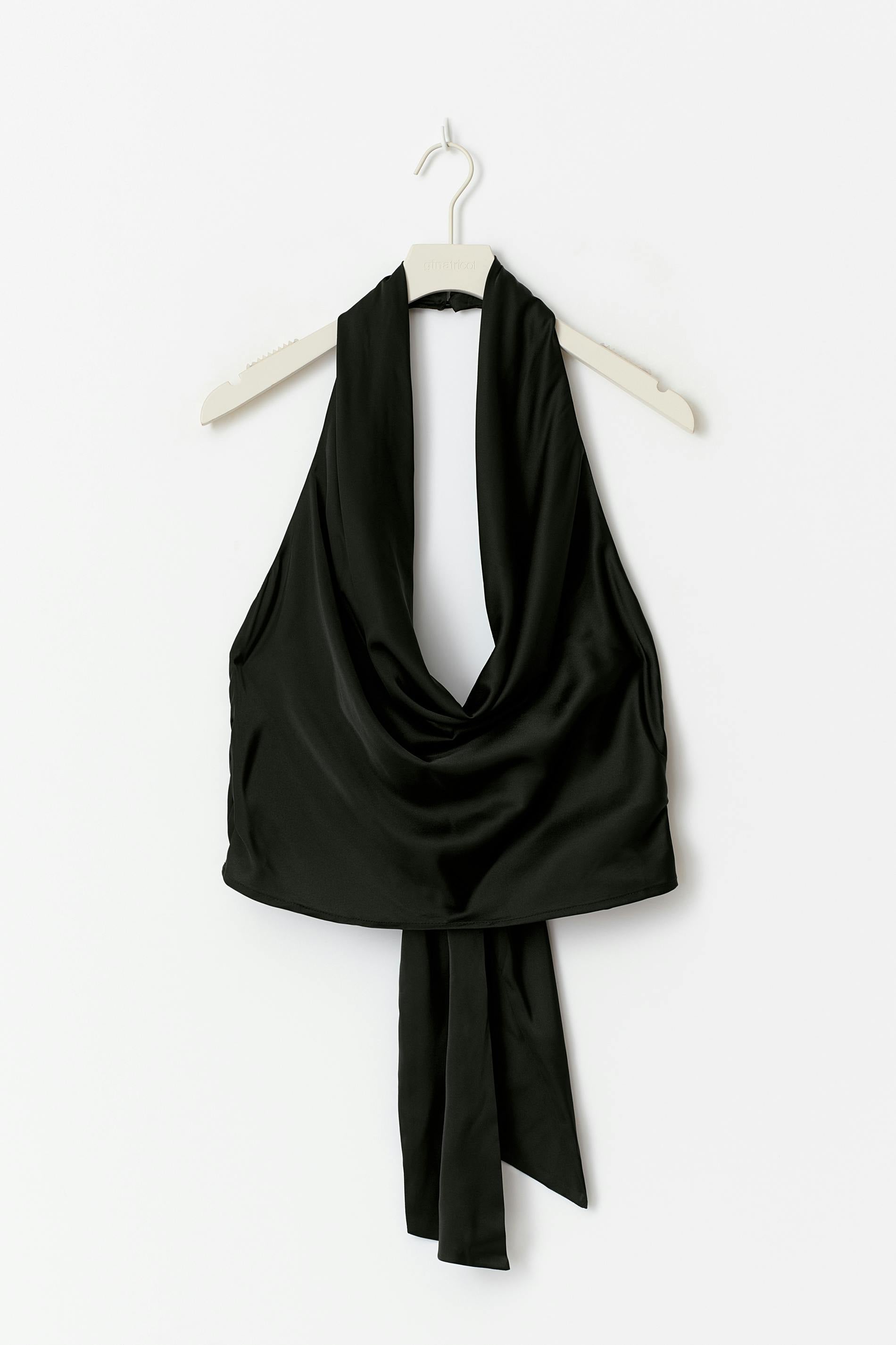 Halternecktopp med en knytning i ryggen. Toppen är svart och har en djupringad. Den har en normal passform.