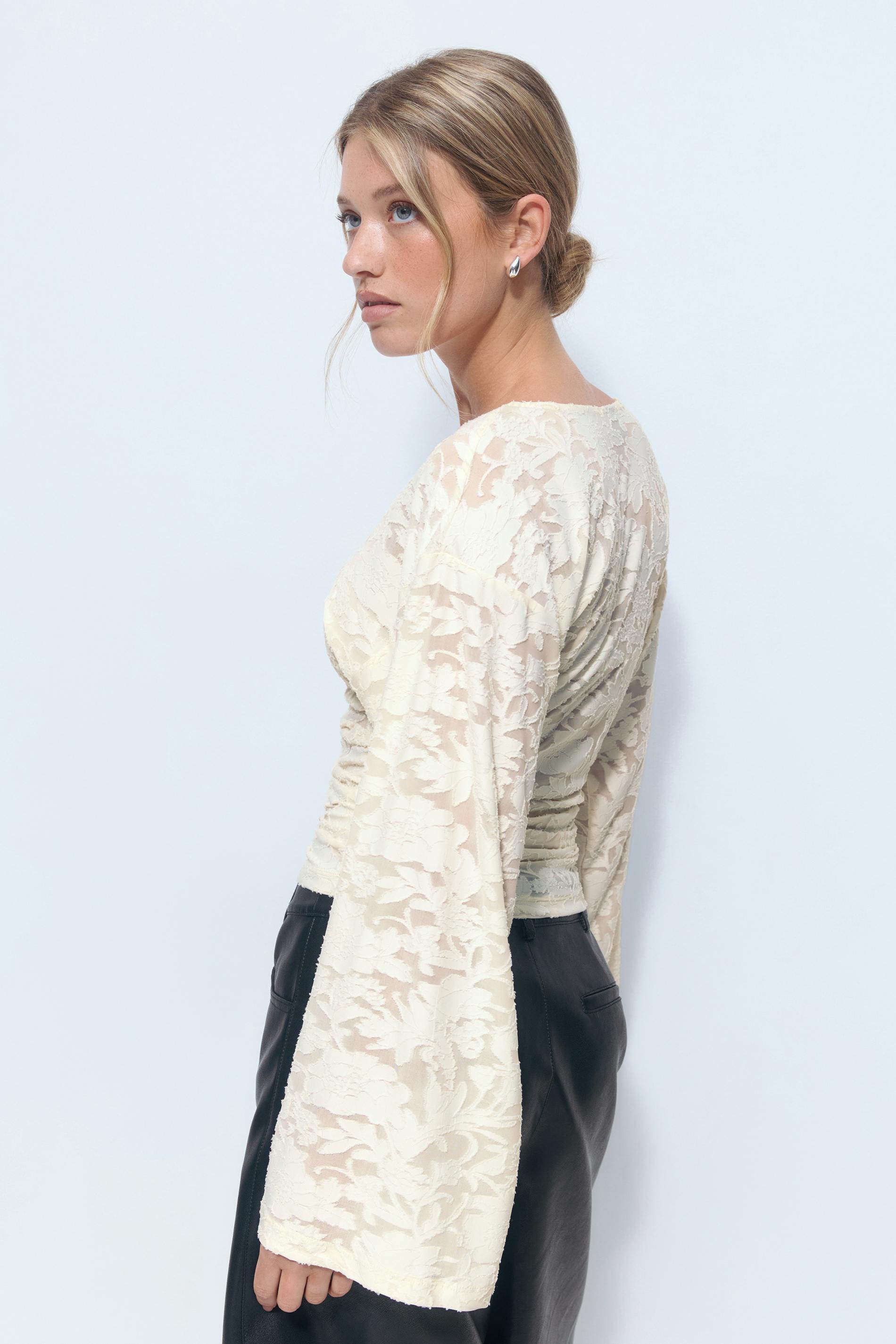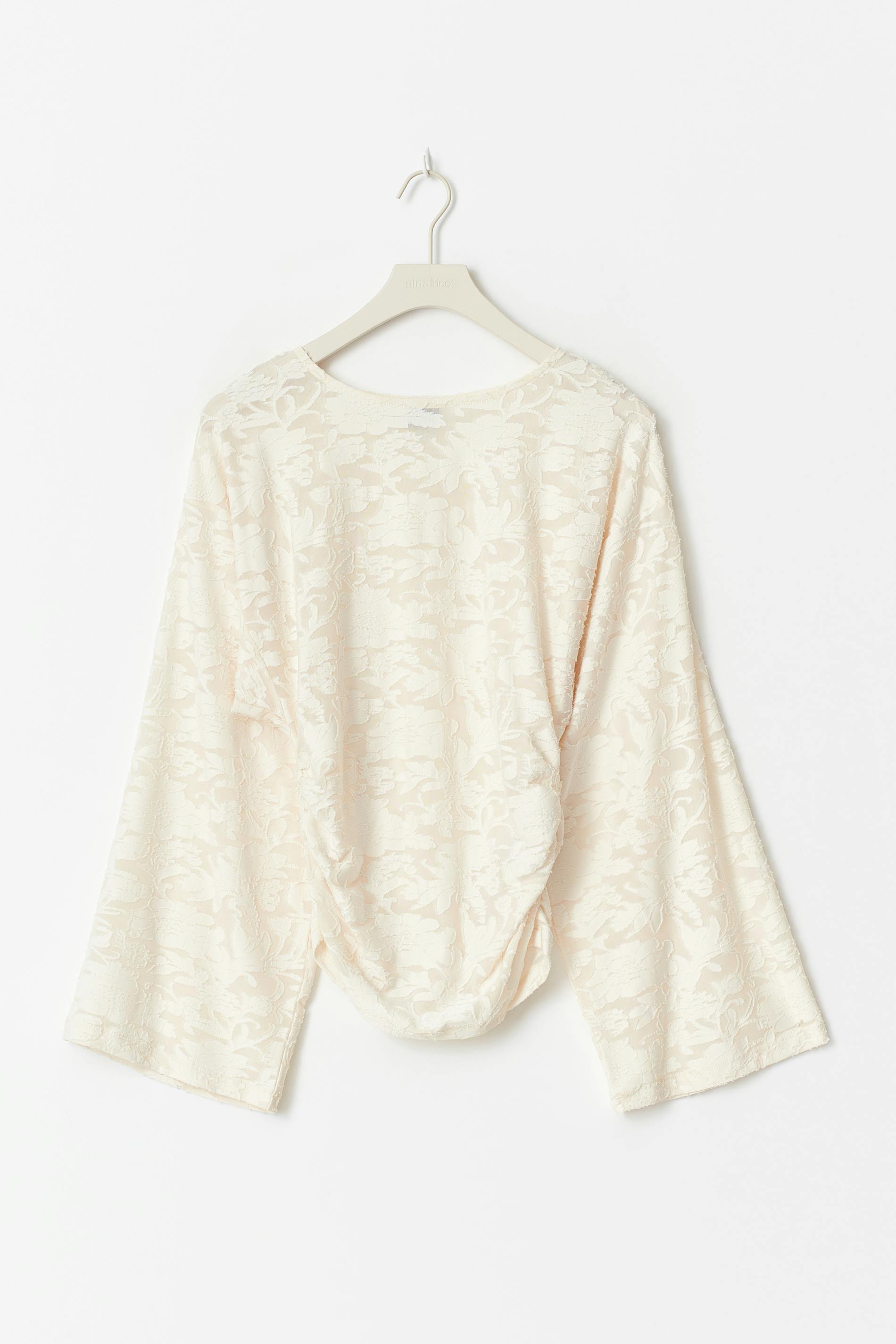 Spetstopp med vida långa ärmar. Toppen är naturvit och har en rund halsringning. Den har en rynkning vid midjan.