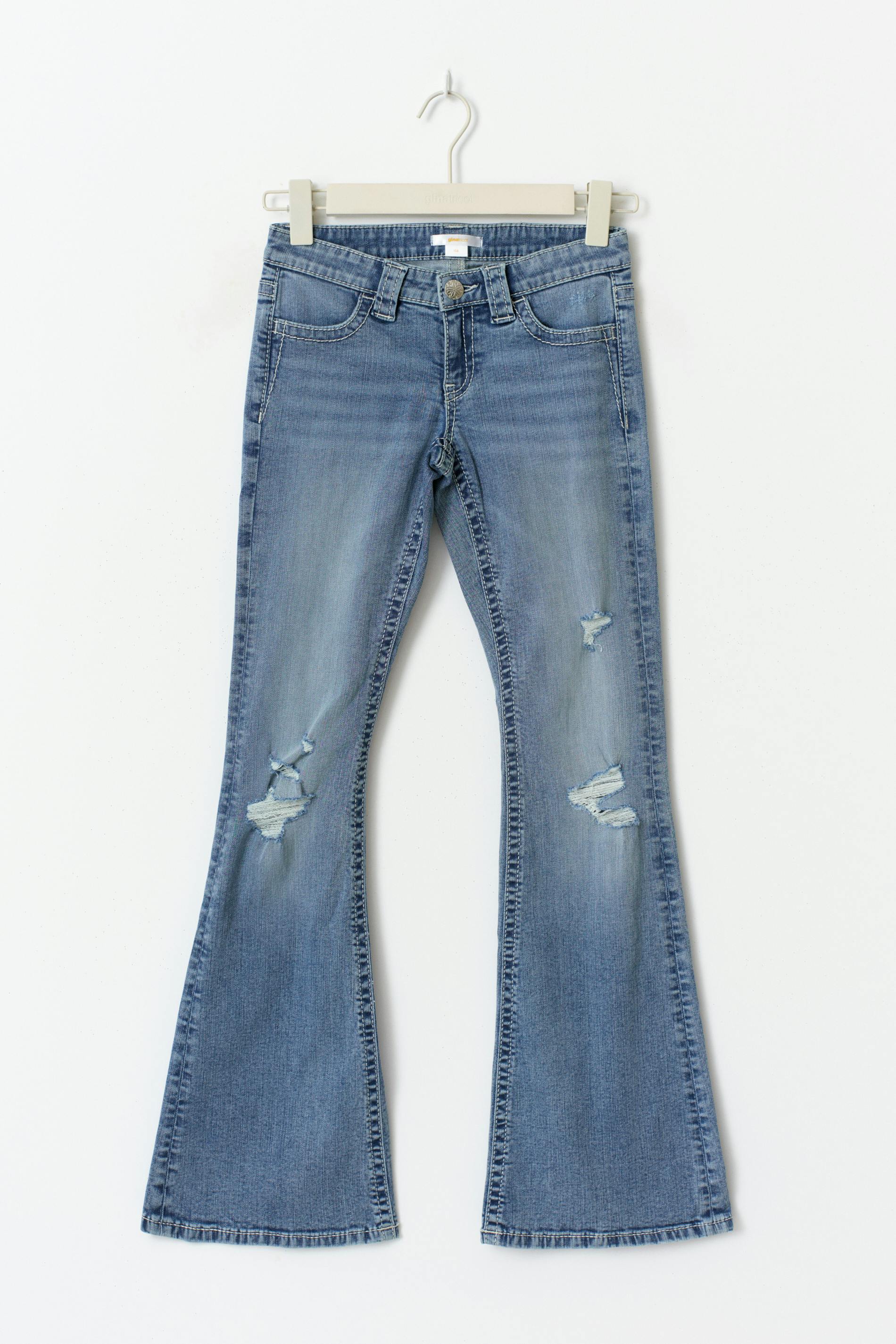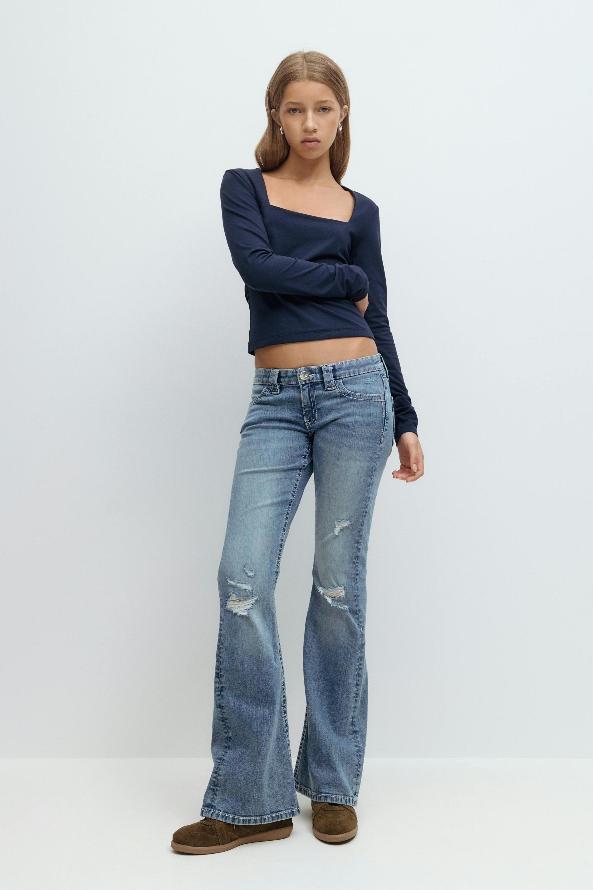 Flare jeans with rips. The jeans are blue and have low waist. They have embroidered back pockets with sequins, flared legs, low stretch, front pockets and zip fly.