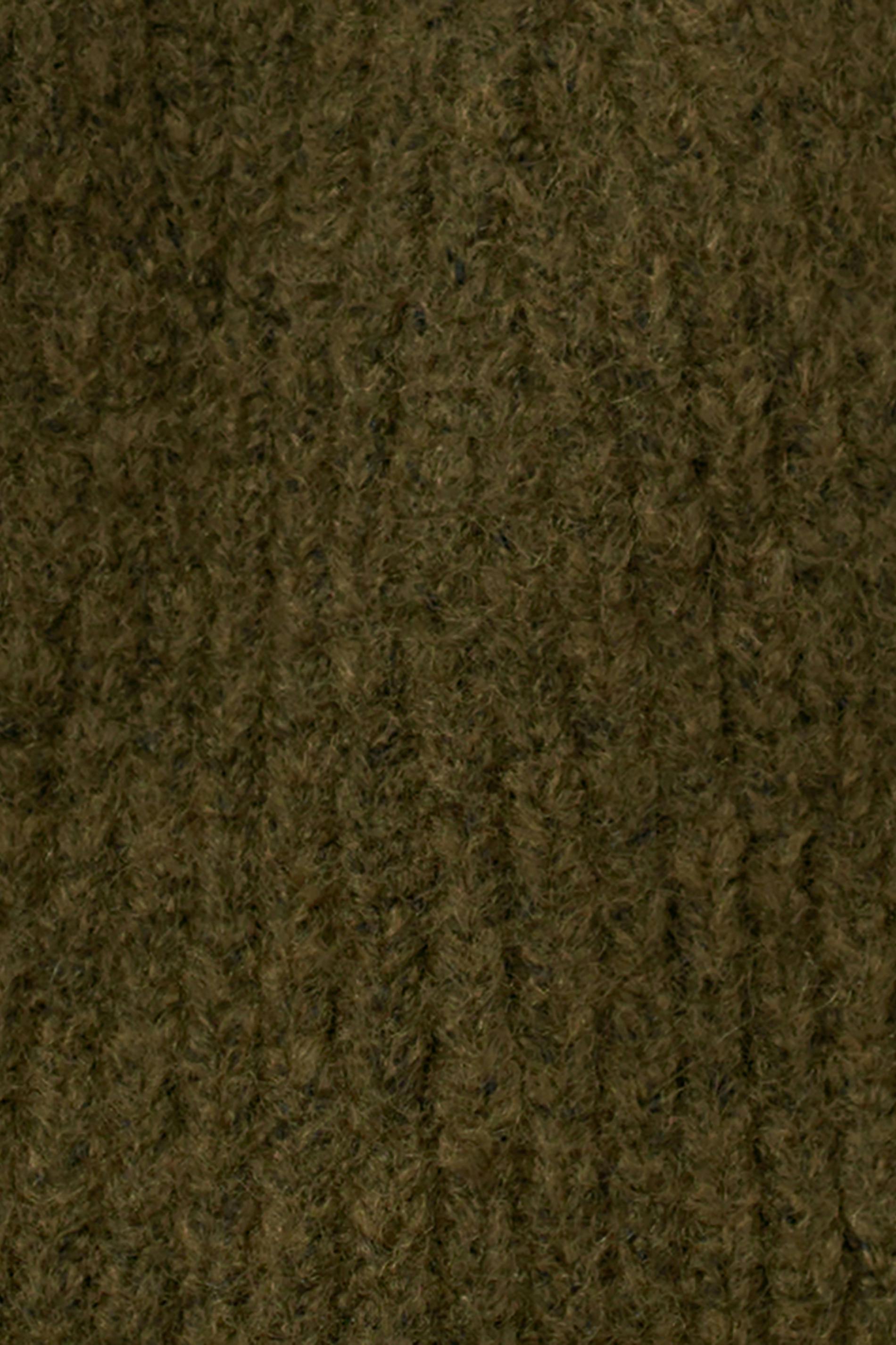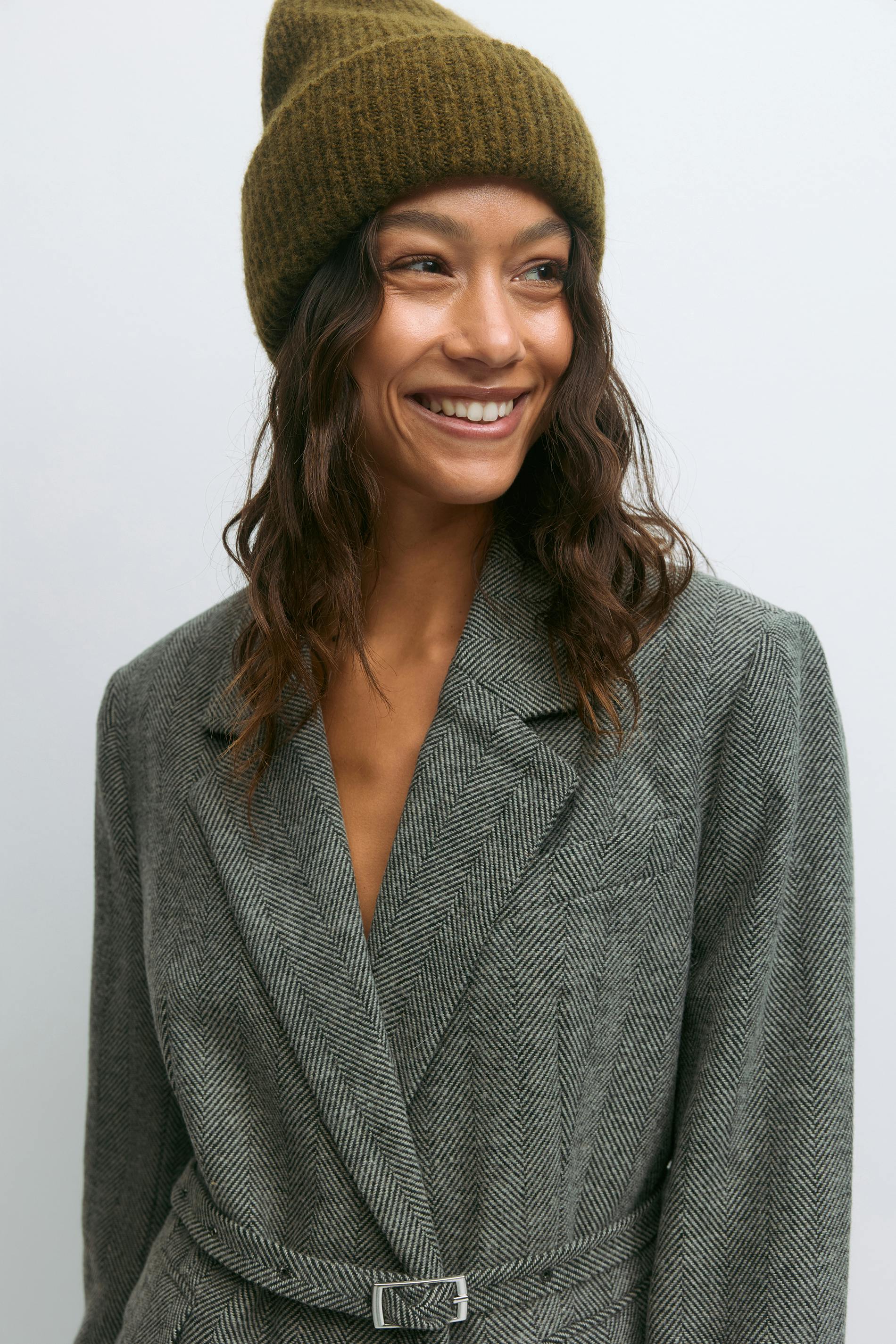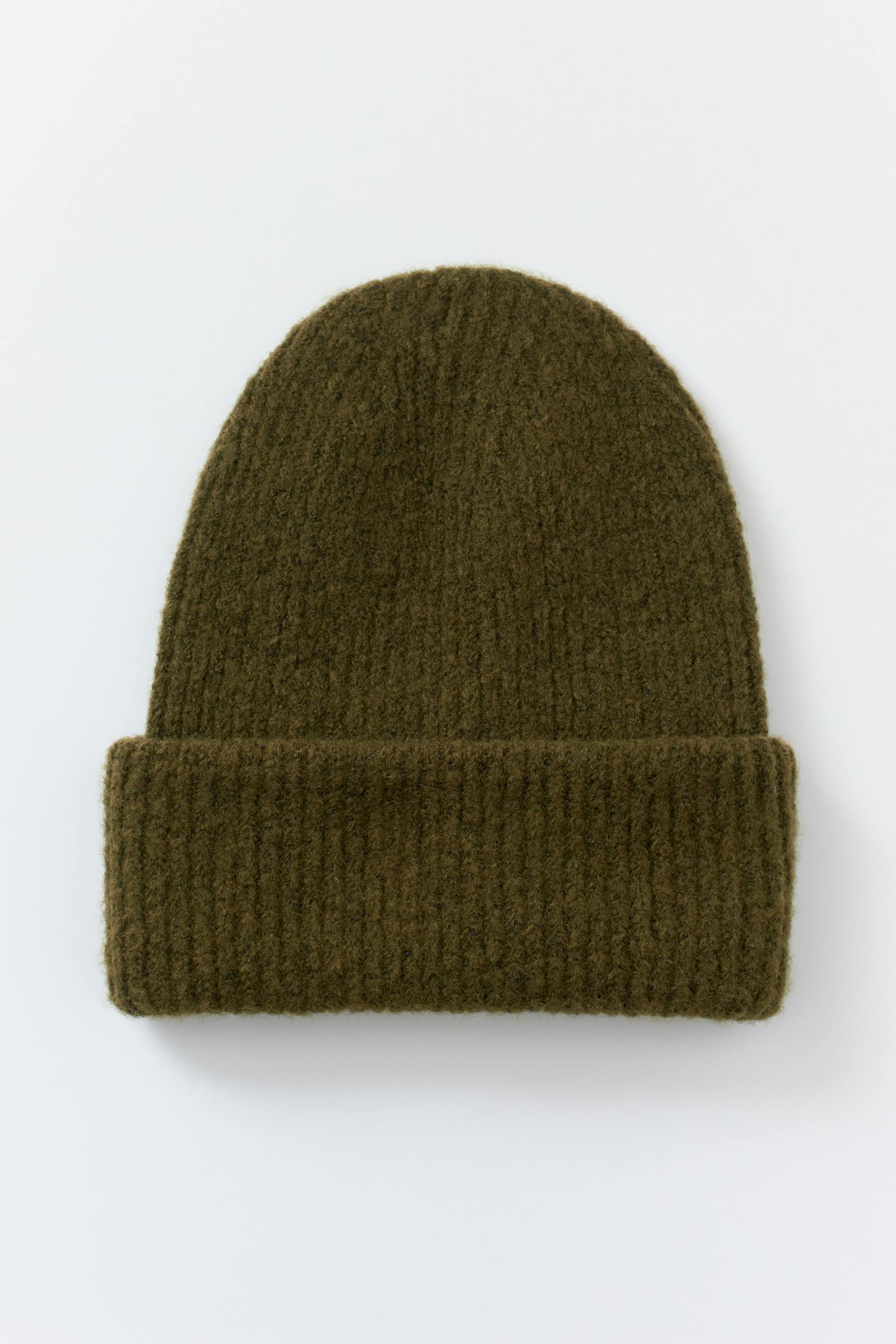 Ribbstickad mössa med bred, uppvikt kant. Mössan är grön och har figurnära passform.
