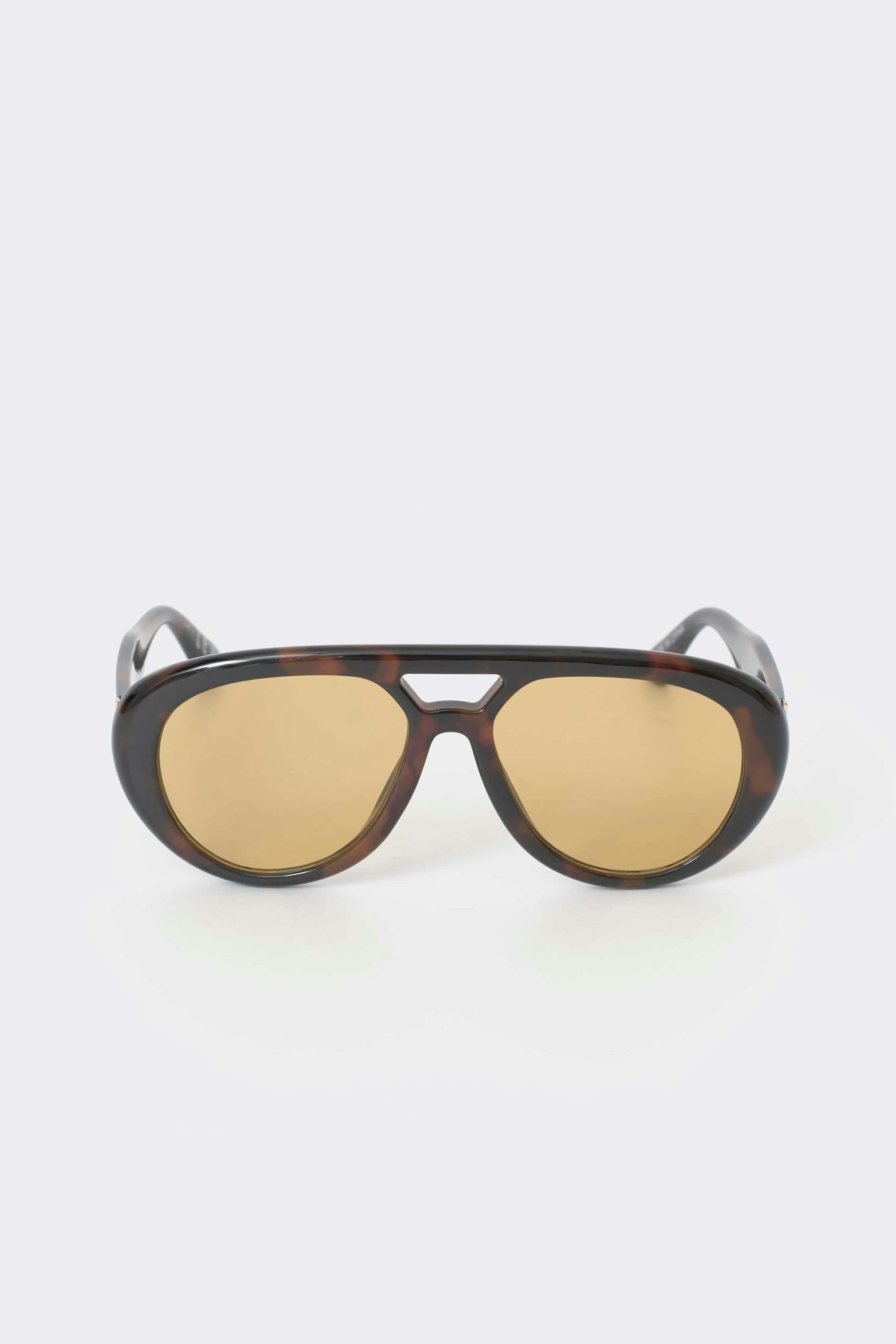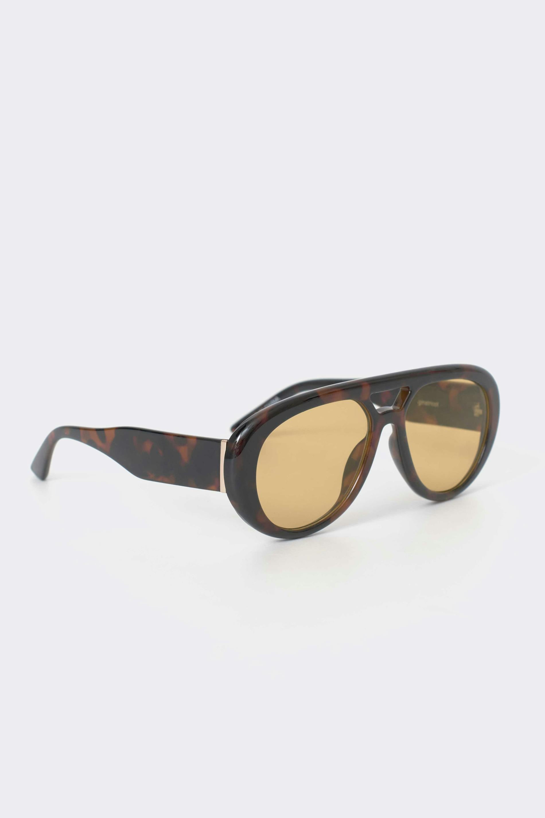 Sköldpaddsmönstrade pilot-solglasögon med gulddetaljer i sidorna. Solglasögonen är beigea och stora och har breda plastbågar. De har tonade glas med UV400-skydd.