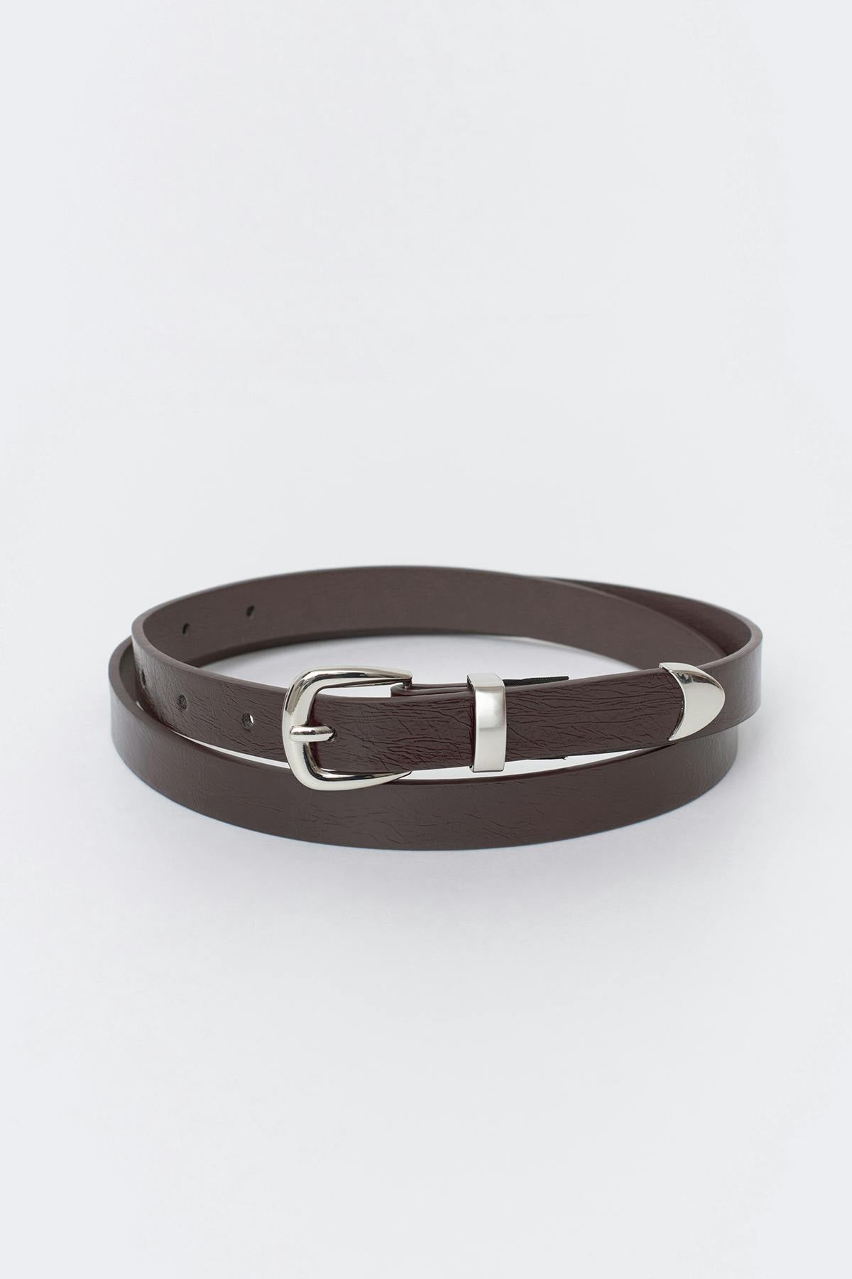 Smalt bälte i läderimitation med ett silverfärgat metallspänne. Bältet är brunt och har silverdetaljer i metall.