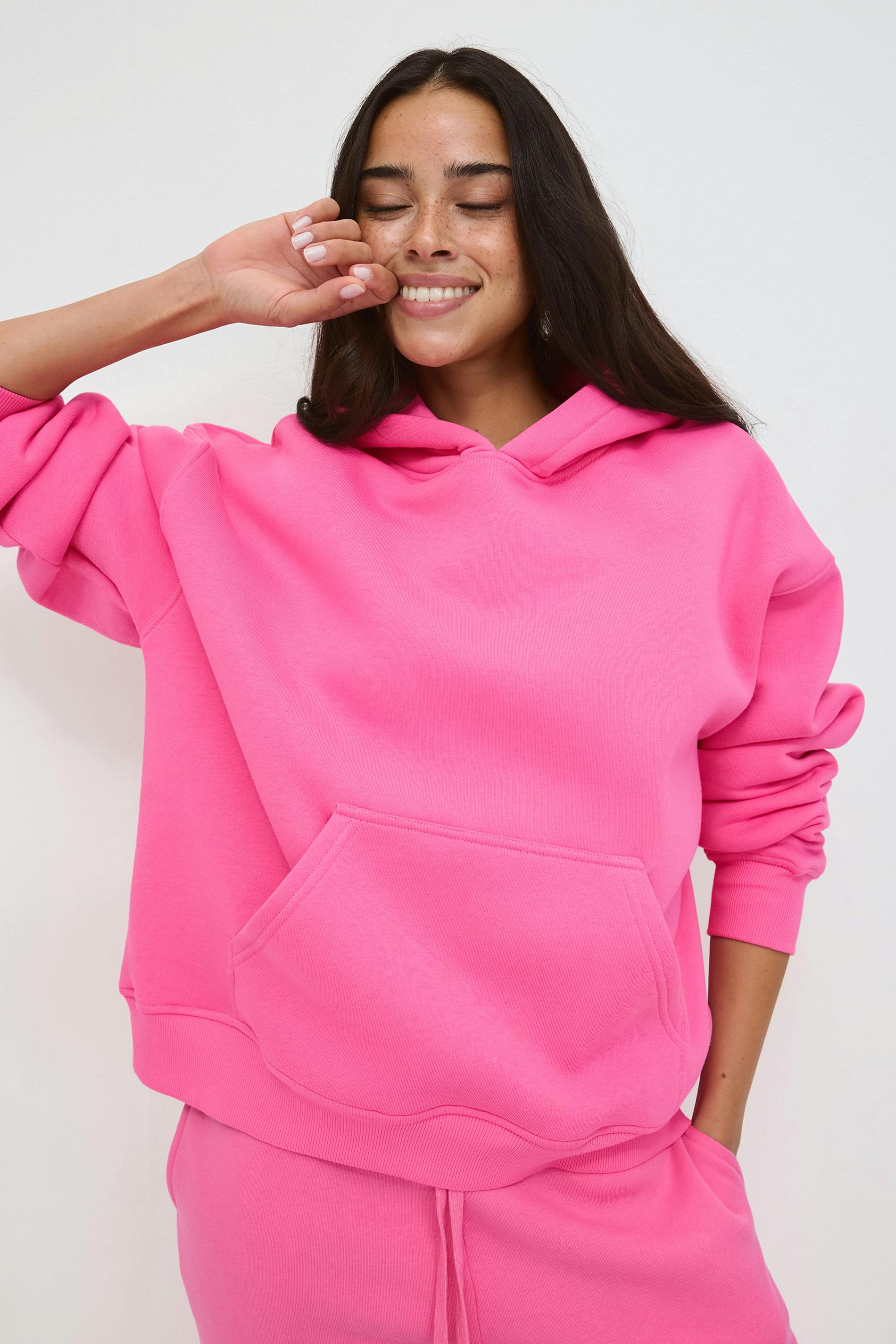 Avslappnad hoodie med mjuk borstad insida. Nedhasade axlar, fodrad huva med dragsko och ficka framtill. I färgen rosa. Easy to wear everyday.