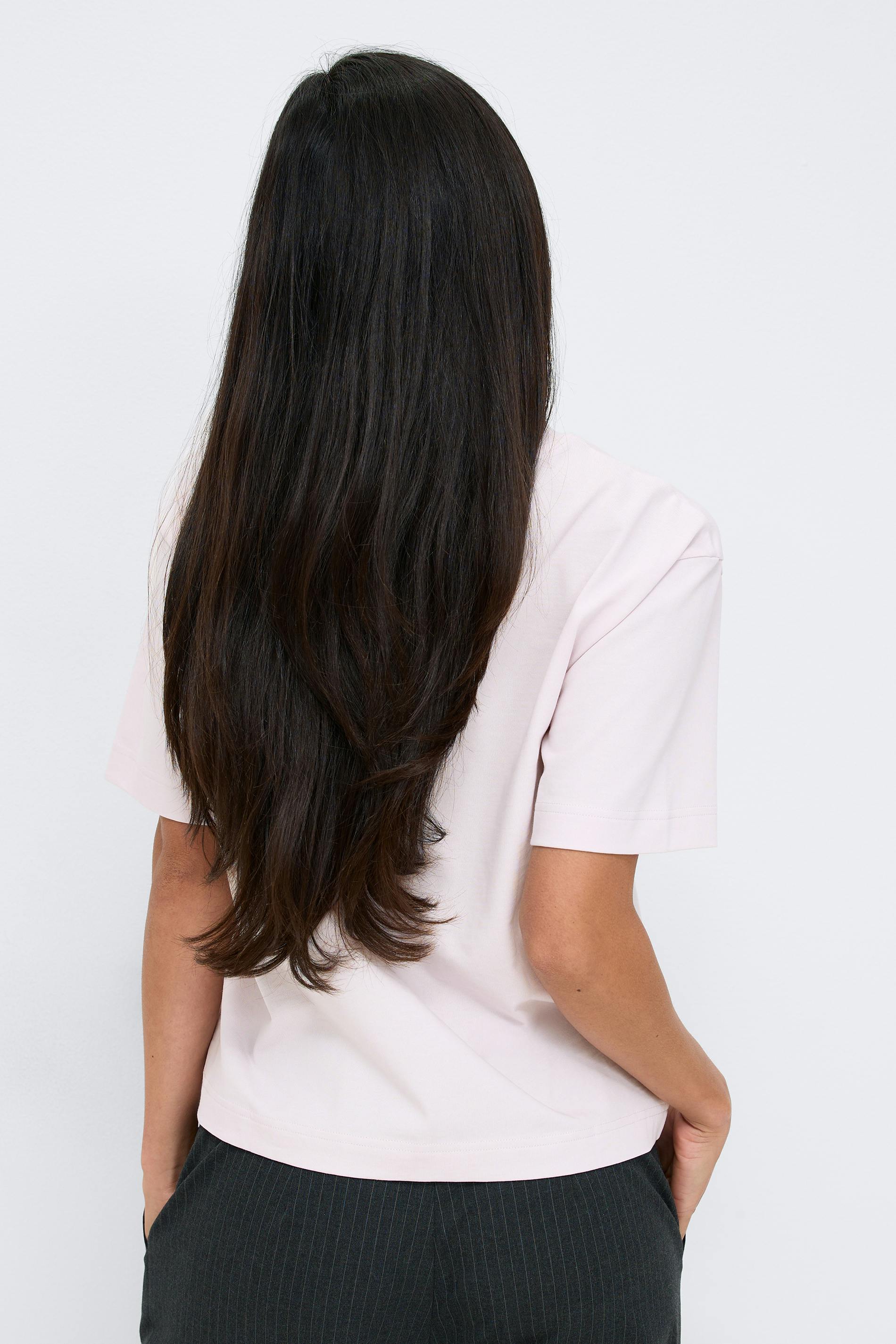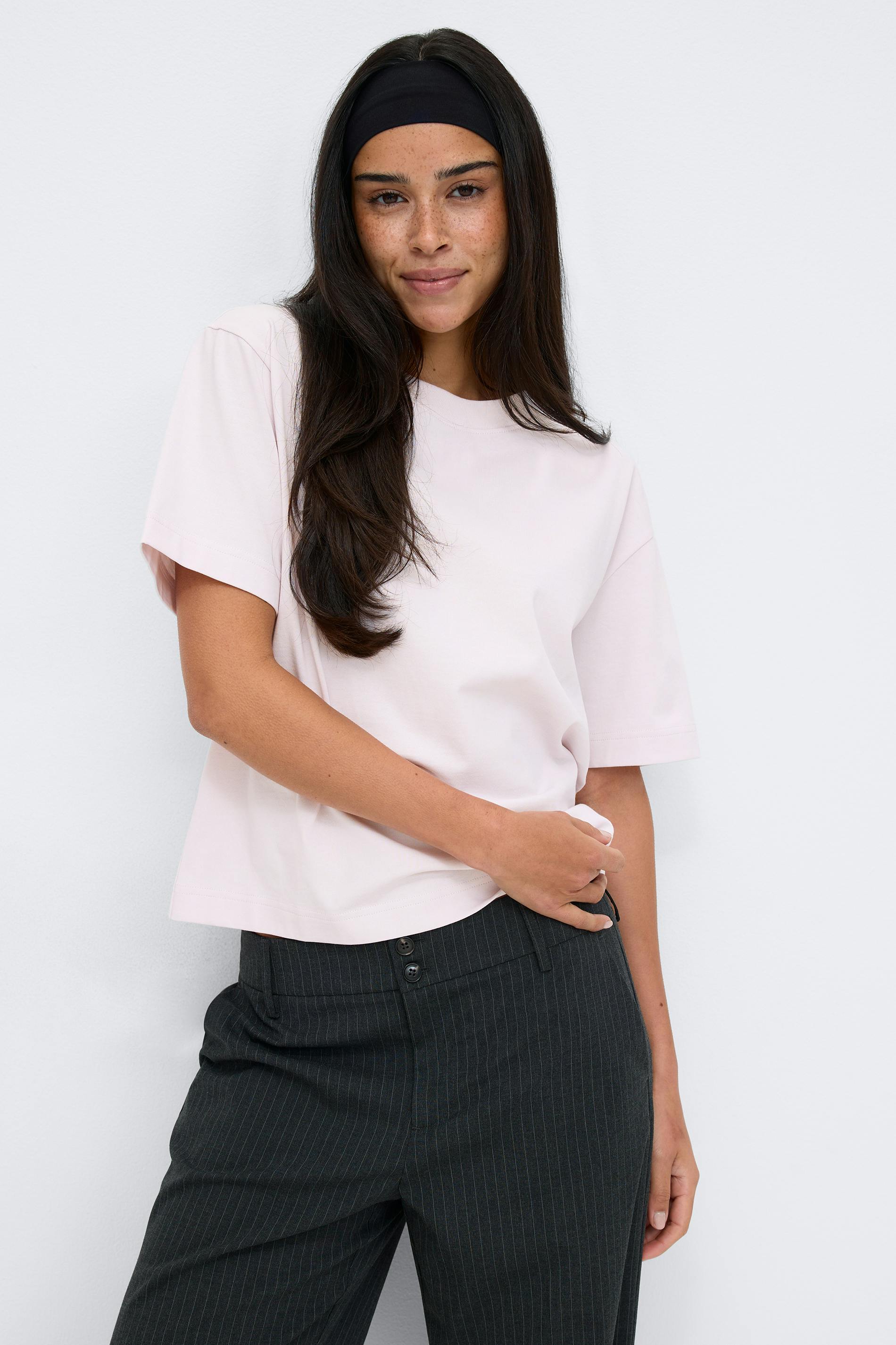 Kortärmad t-shirt med rund halsringning. T-shirten är rosa och har normal passform. Den har tjock bomullskvalitet och normallängd.