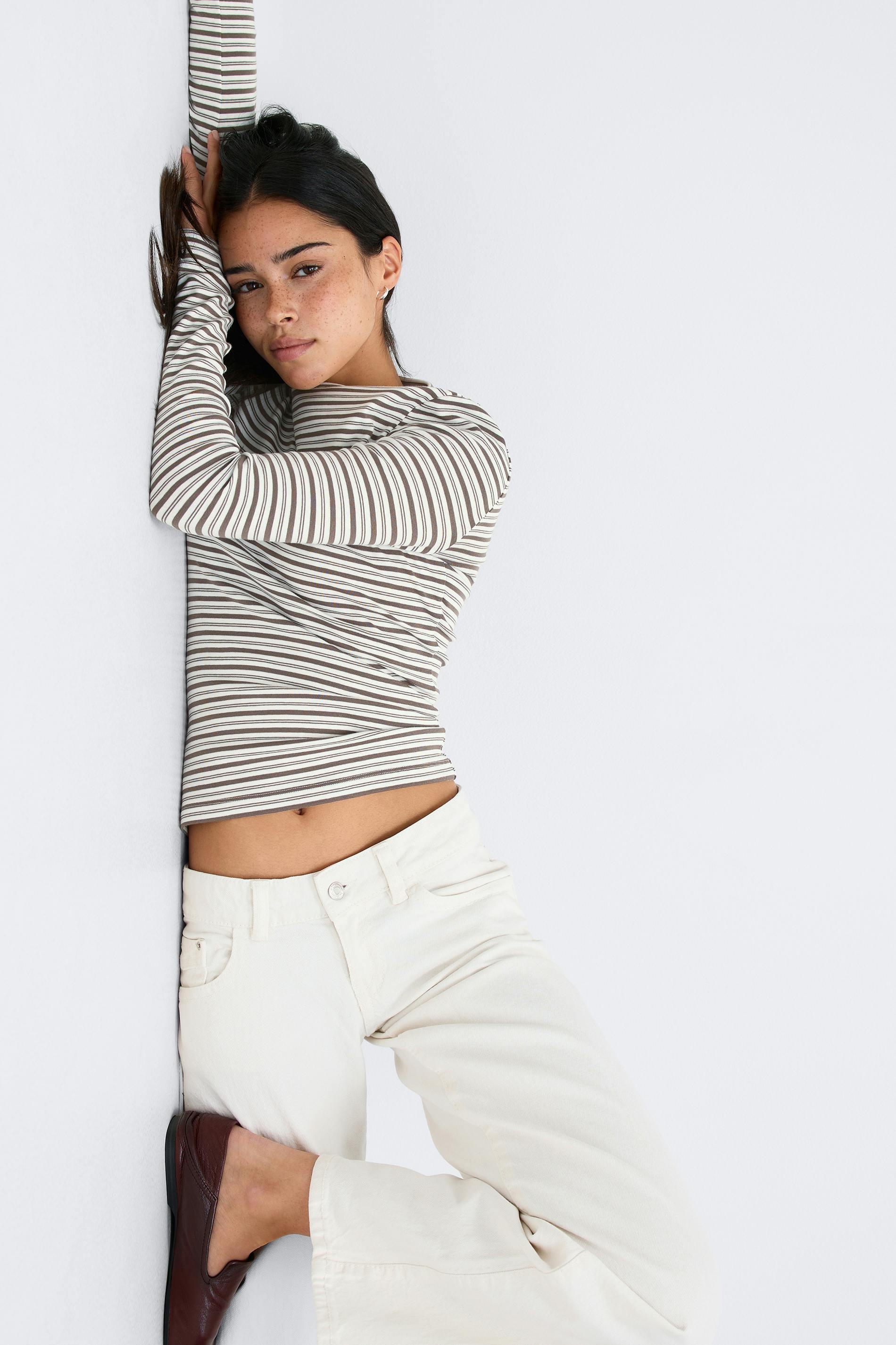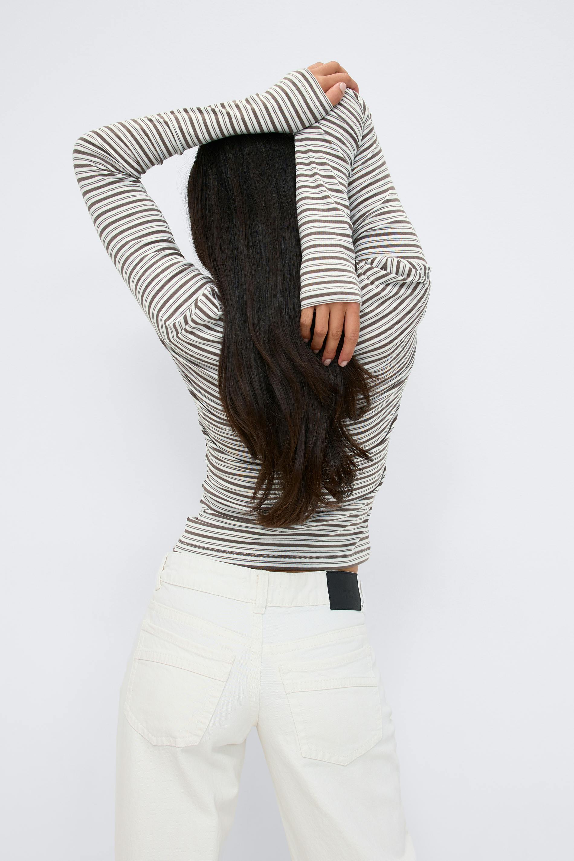 Randig långärmad topp i bomull med ribbad kvalitet. Toppen är beige och har figurnära passform. Den har rund halsringning och normallängd.