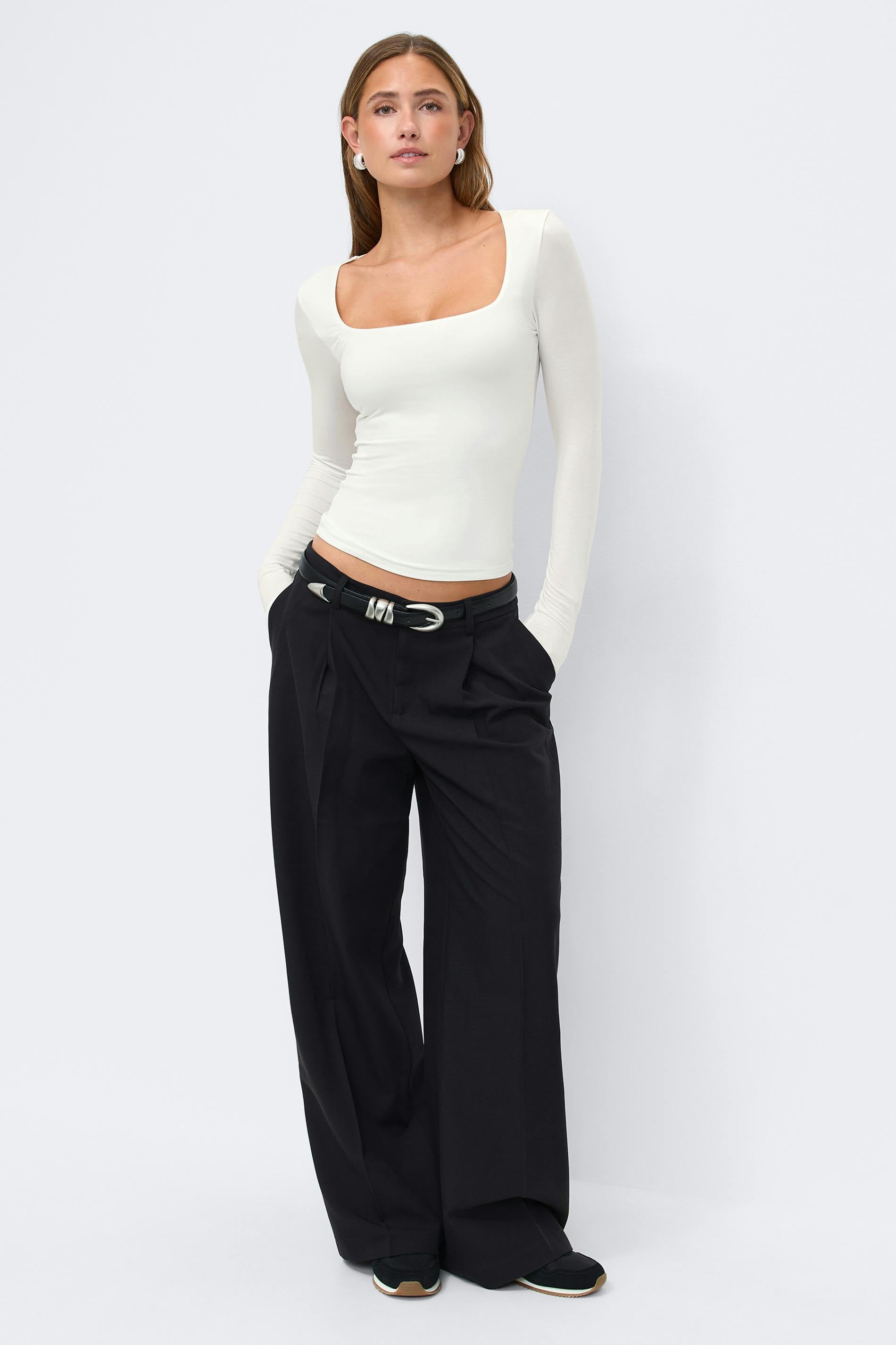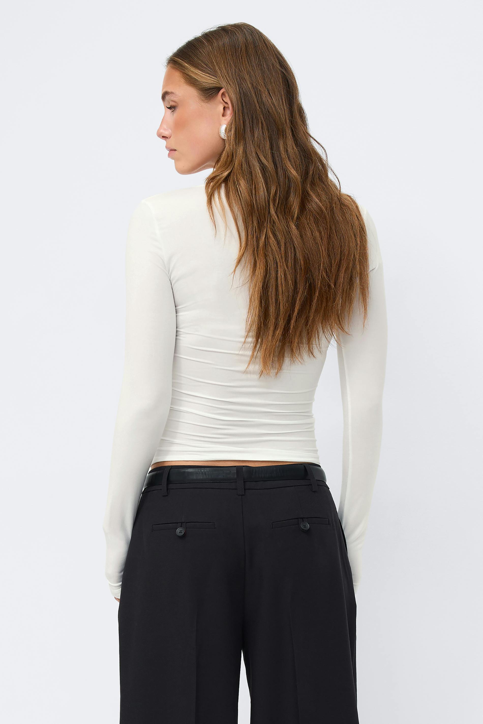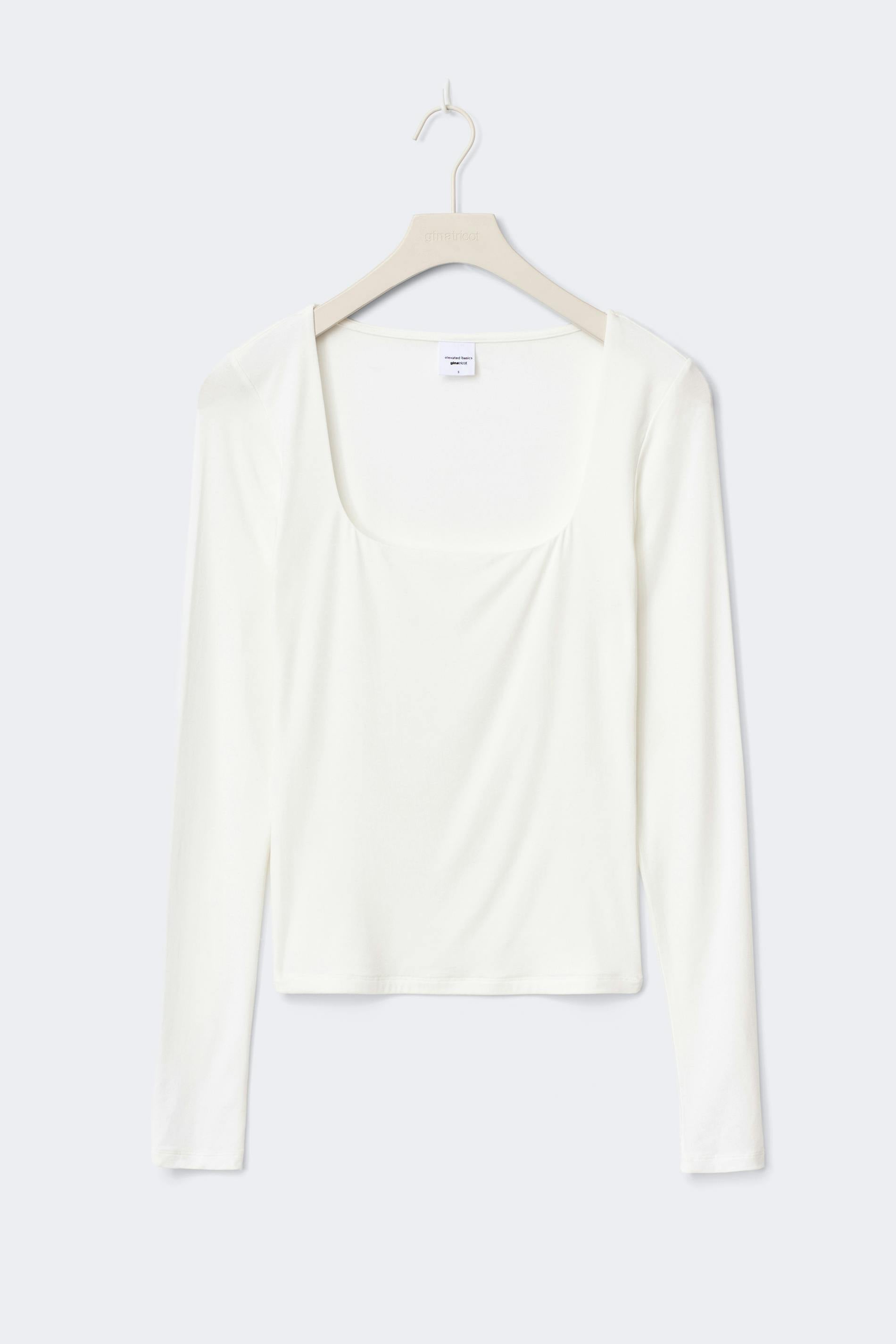 Slim-fit topp med långa ärmar. Toppen är vit och har åtsittande passform. Den har djup, fyrkantig urringning och ett stretchigt, mjukt material.