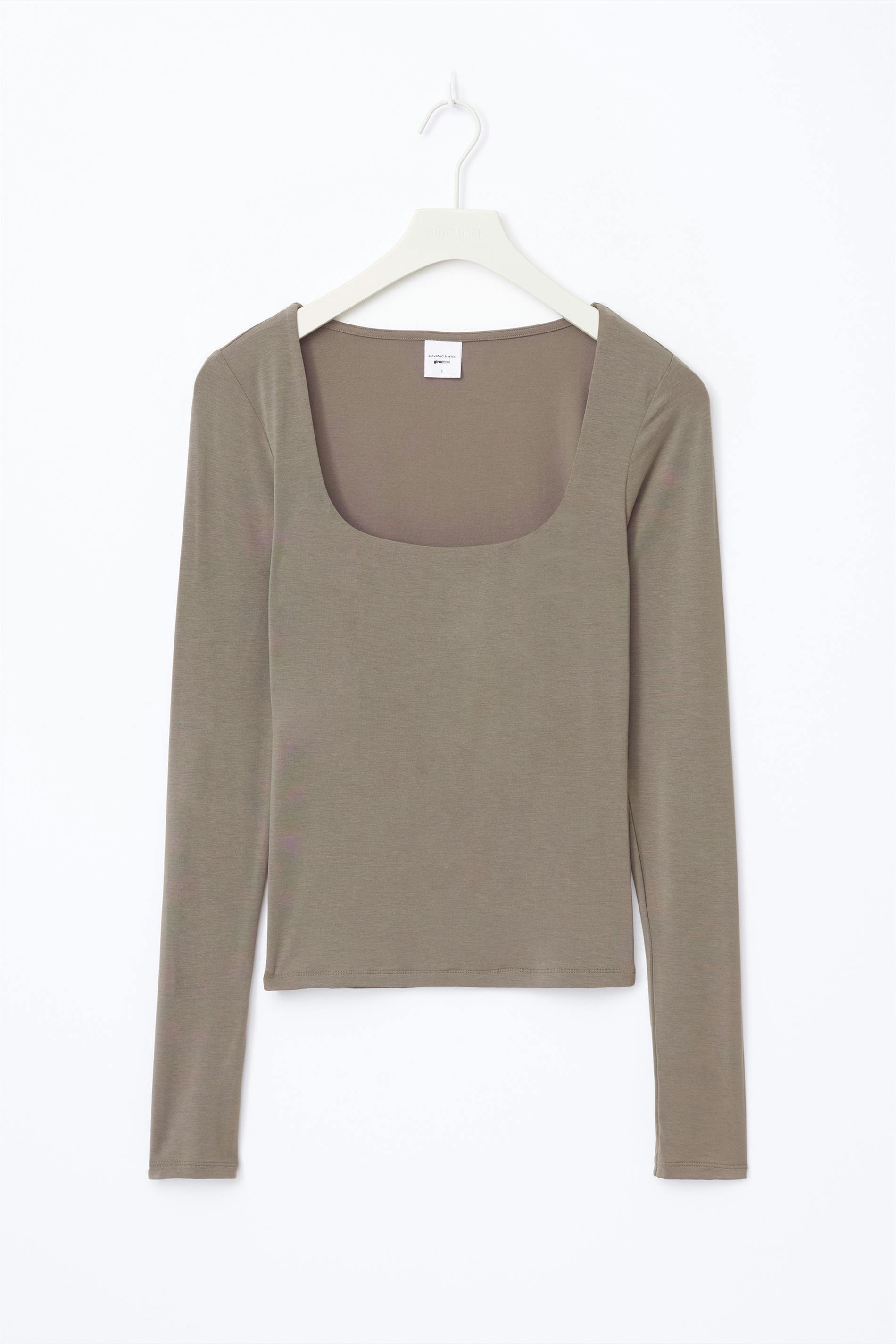 Slim-fit topp med långa ärmar. Toppen är beige och har åtsittande passform. Den har djup, fyrkantig urringning och ett stretchigt, mjukt material.