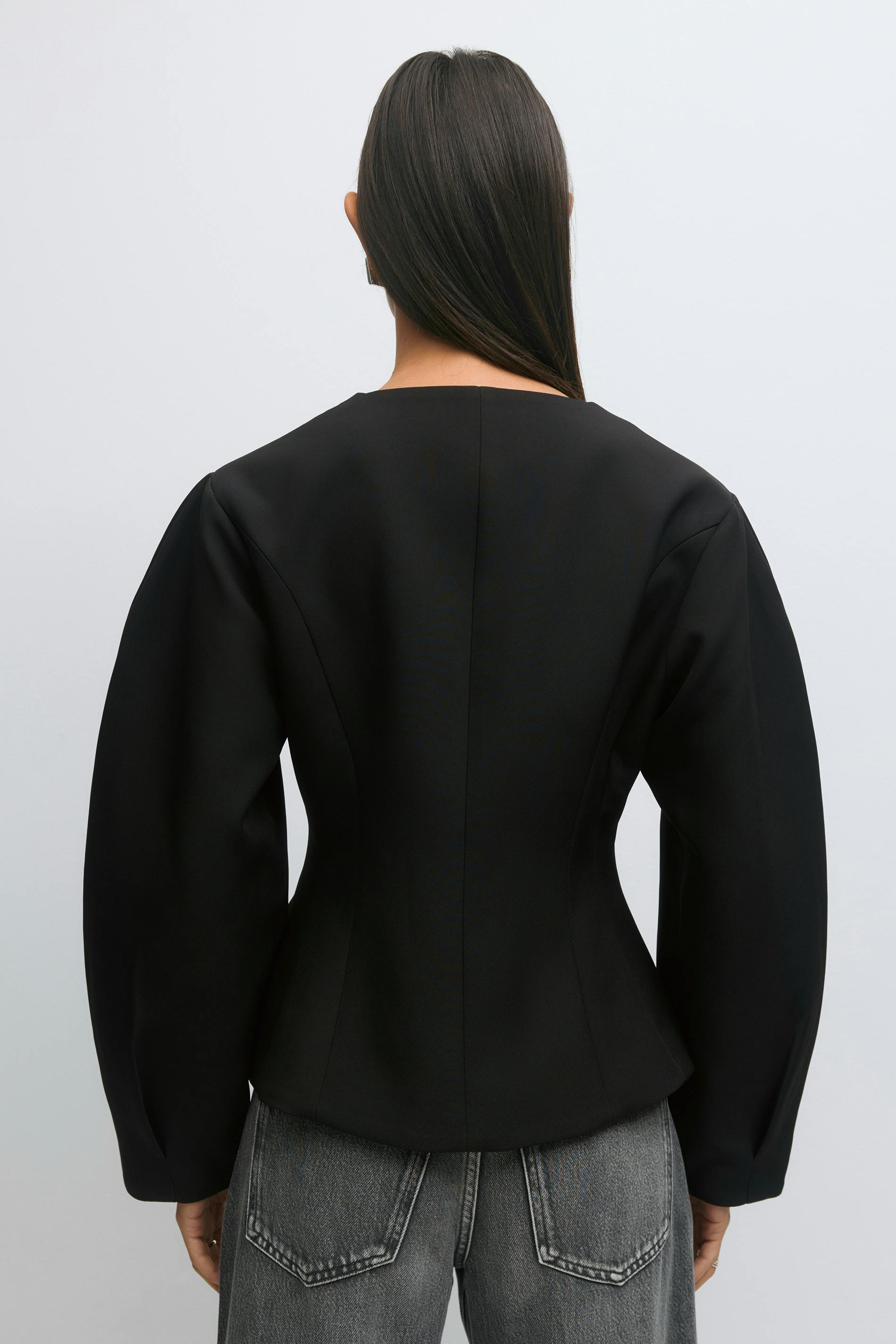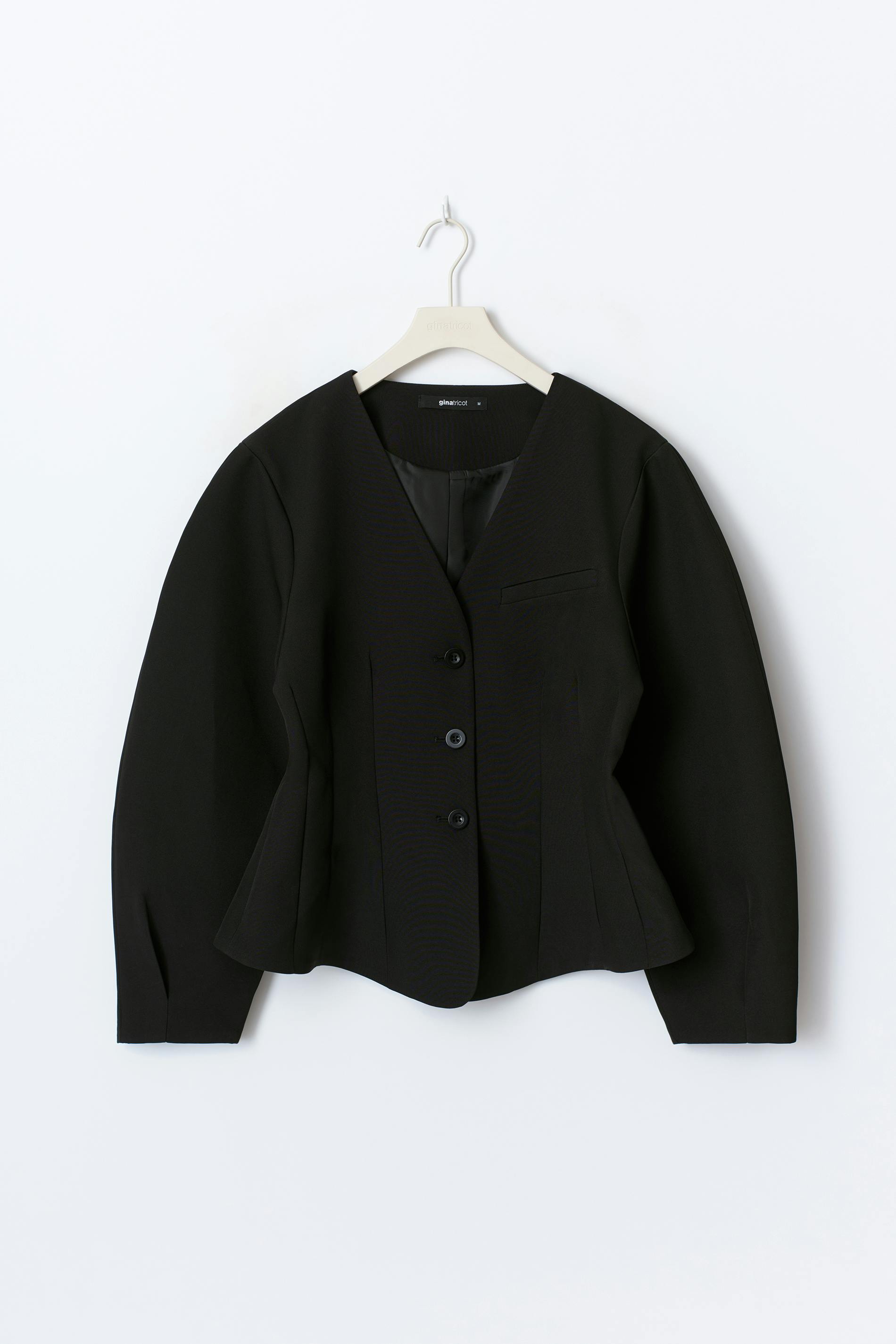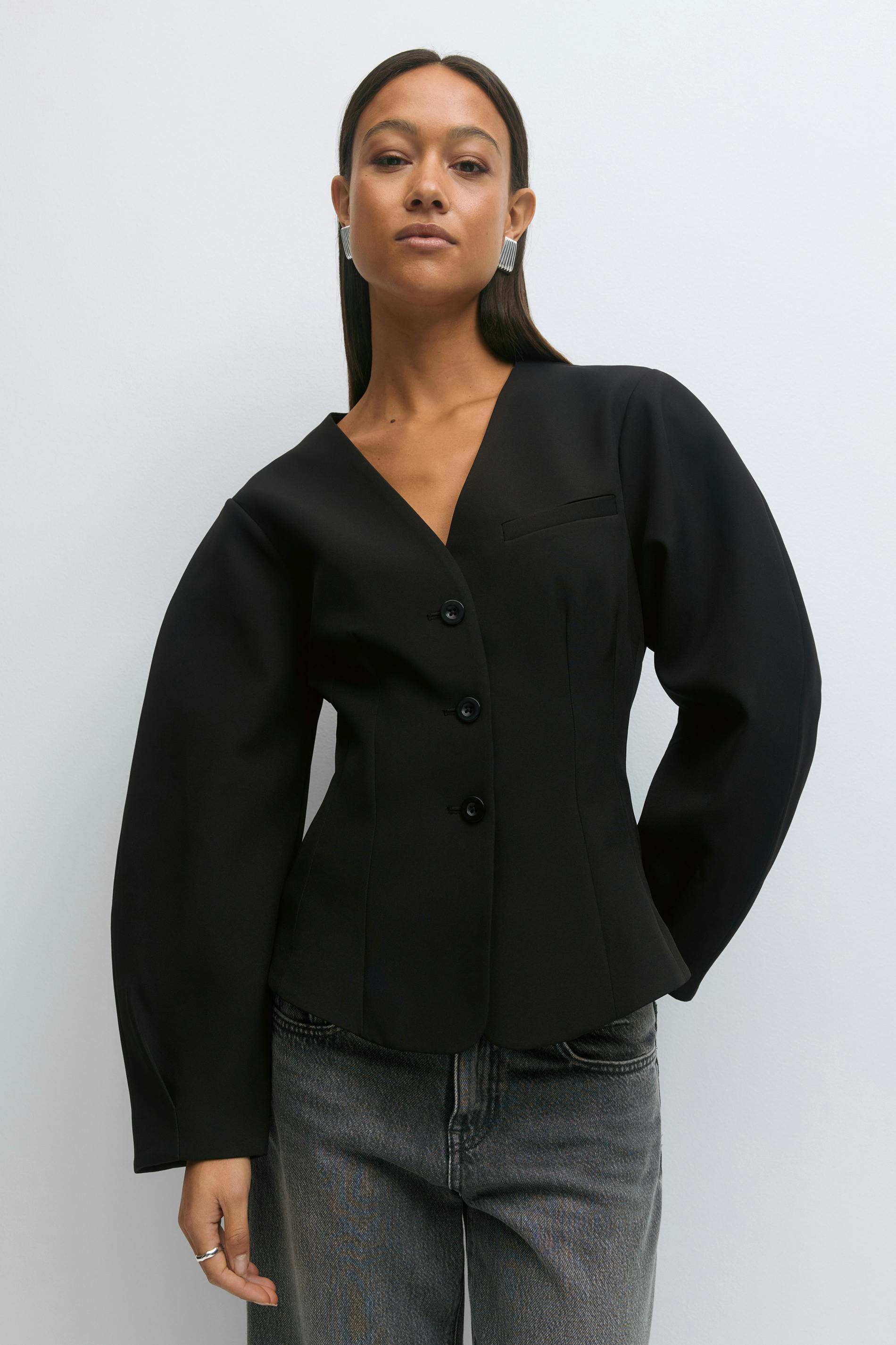 Figursydd blazer med en v-ringning. Blazern är svart och har en normallängd. Den har knappar framtill och långa armar.