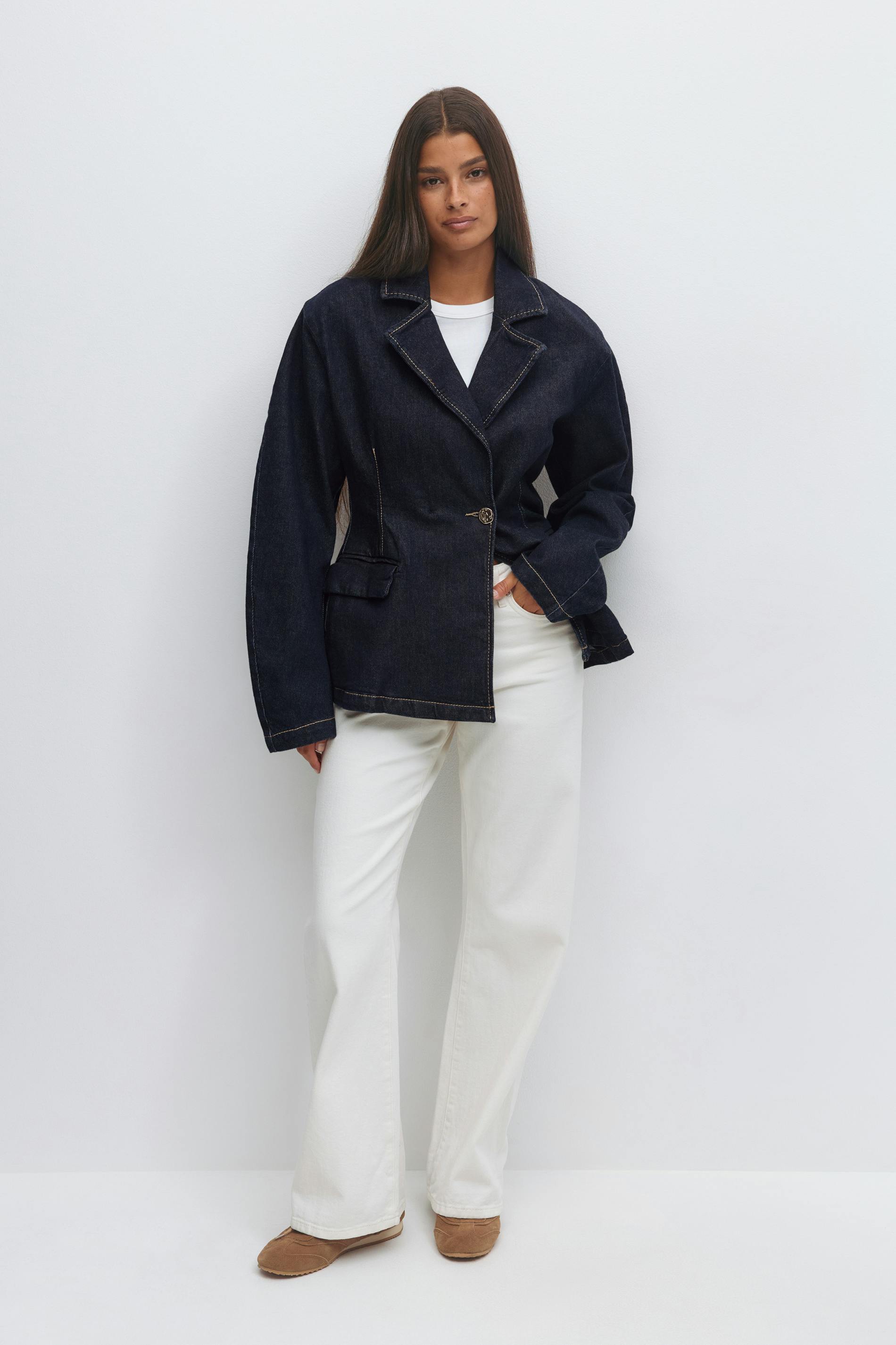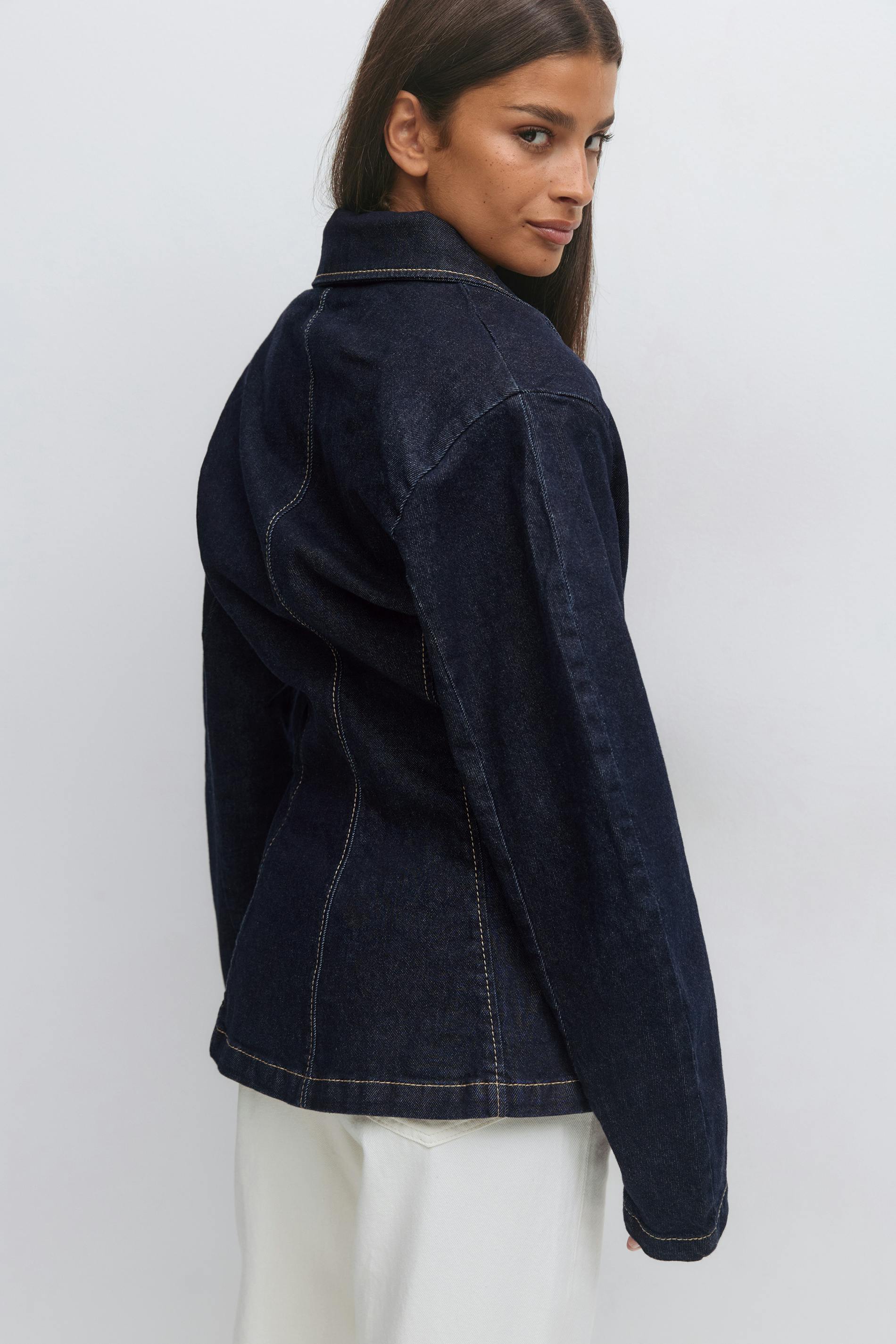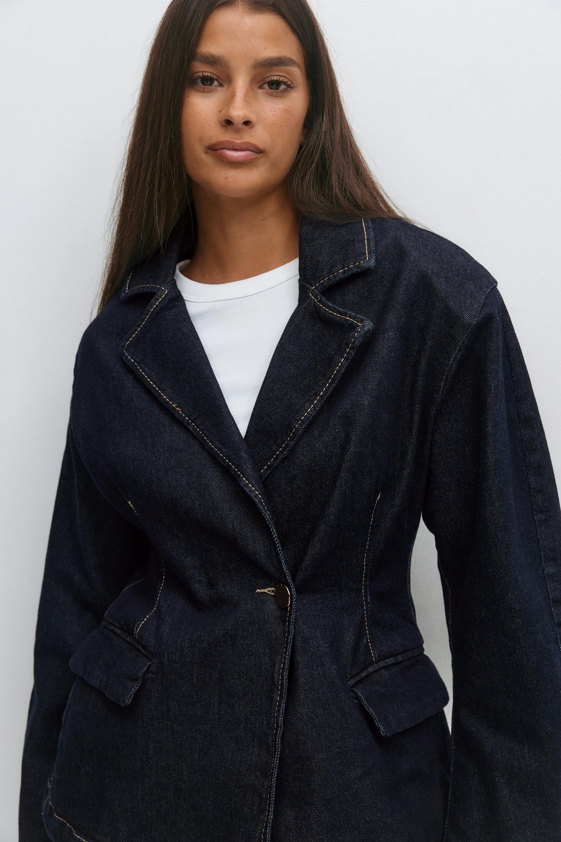 Figursydd kavaj i jeanstyg med axelvaddar. Jackan är mörkblå och har krage med slag. Den har knäppning framtill, långa ärmar och normal passform. Utan stretch.