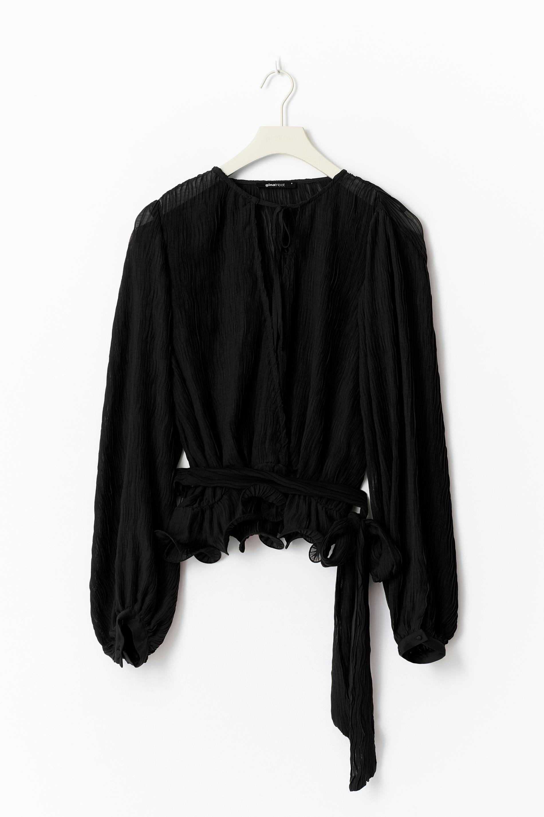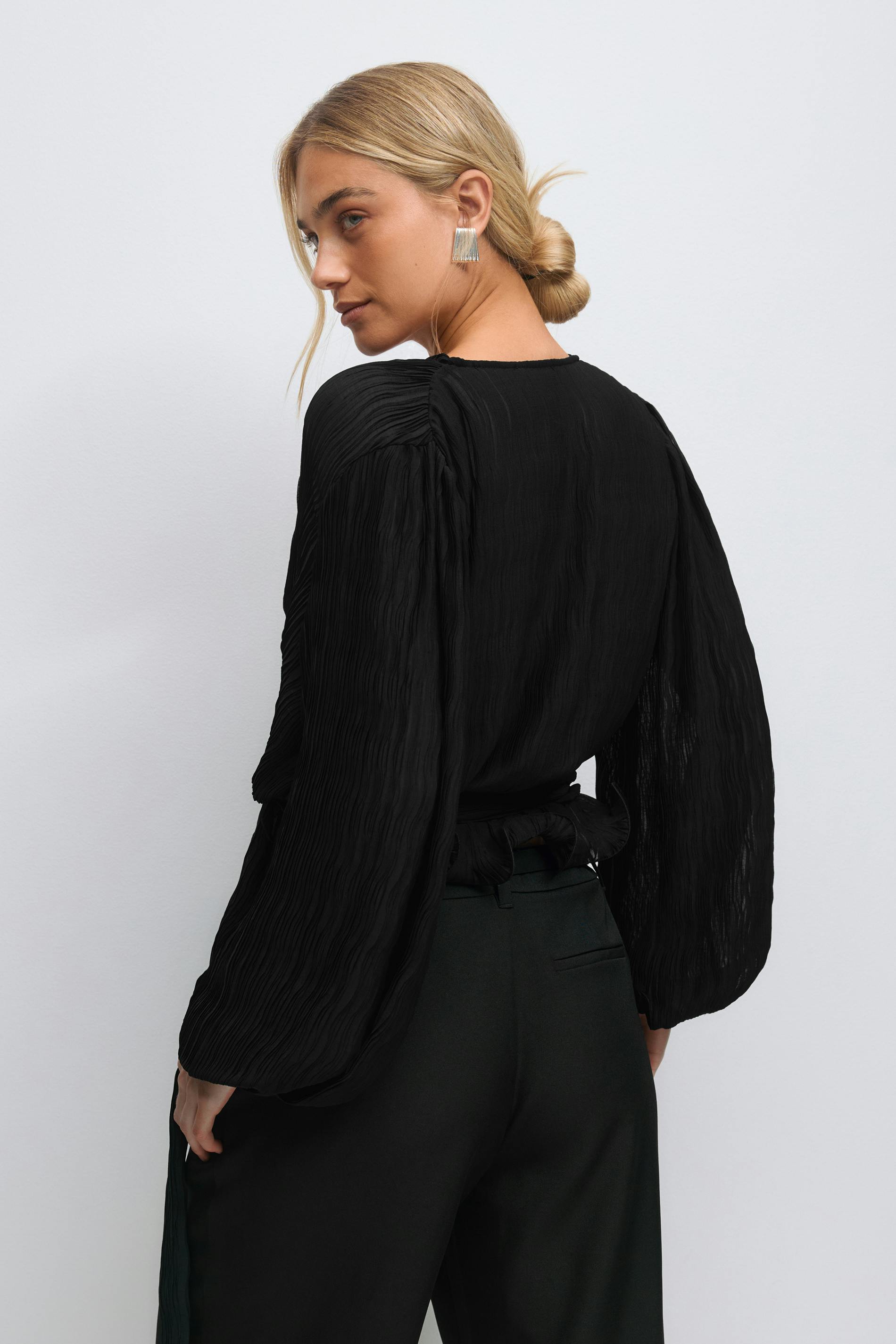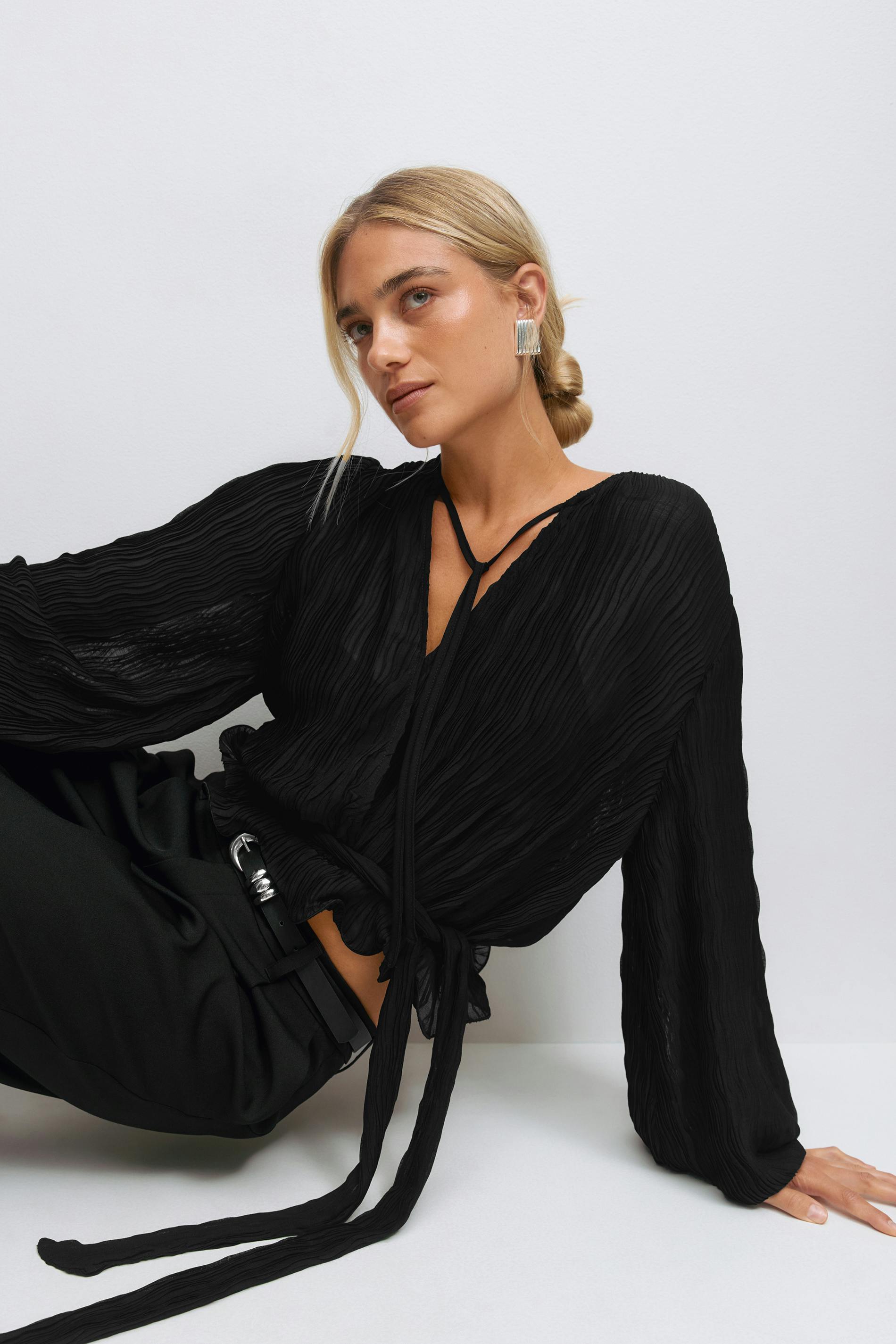 Långärmad blus med en v-ringning. Blusen är svart och har ett elastiskt midjeband. Den har en normal passform och en knytdetalj vid halsringningen.