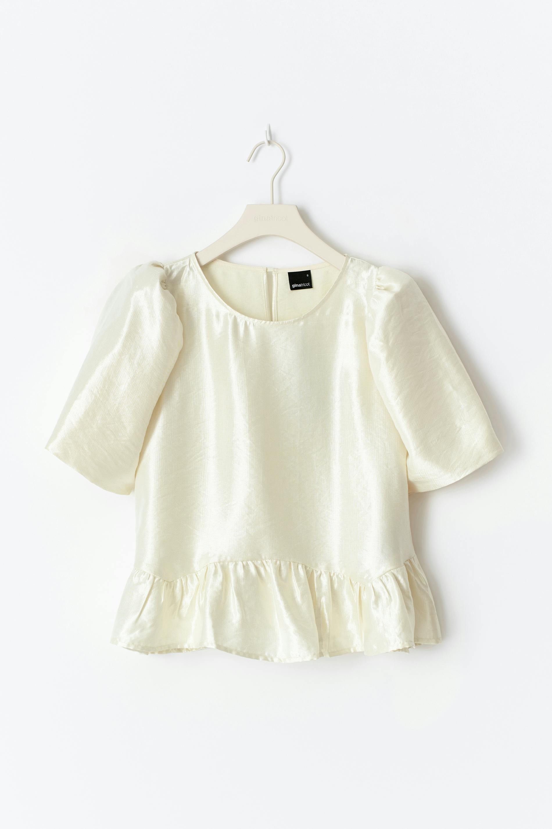Blus med en peplum-design. Blusen är krämfärgad och har en rundhals. Den har ett knäppe baktill, en volang nedtill, en kort ärm, en puffärm, sömdetaljer och en normal passform.