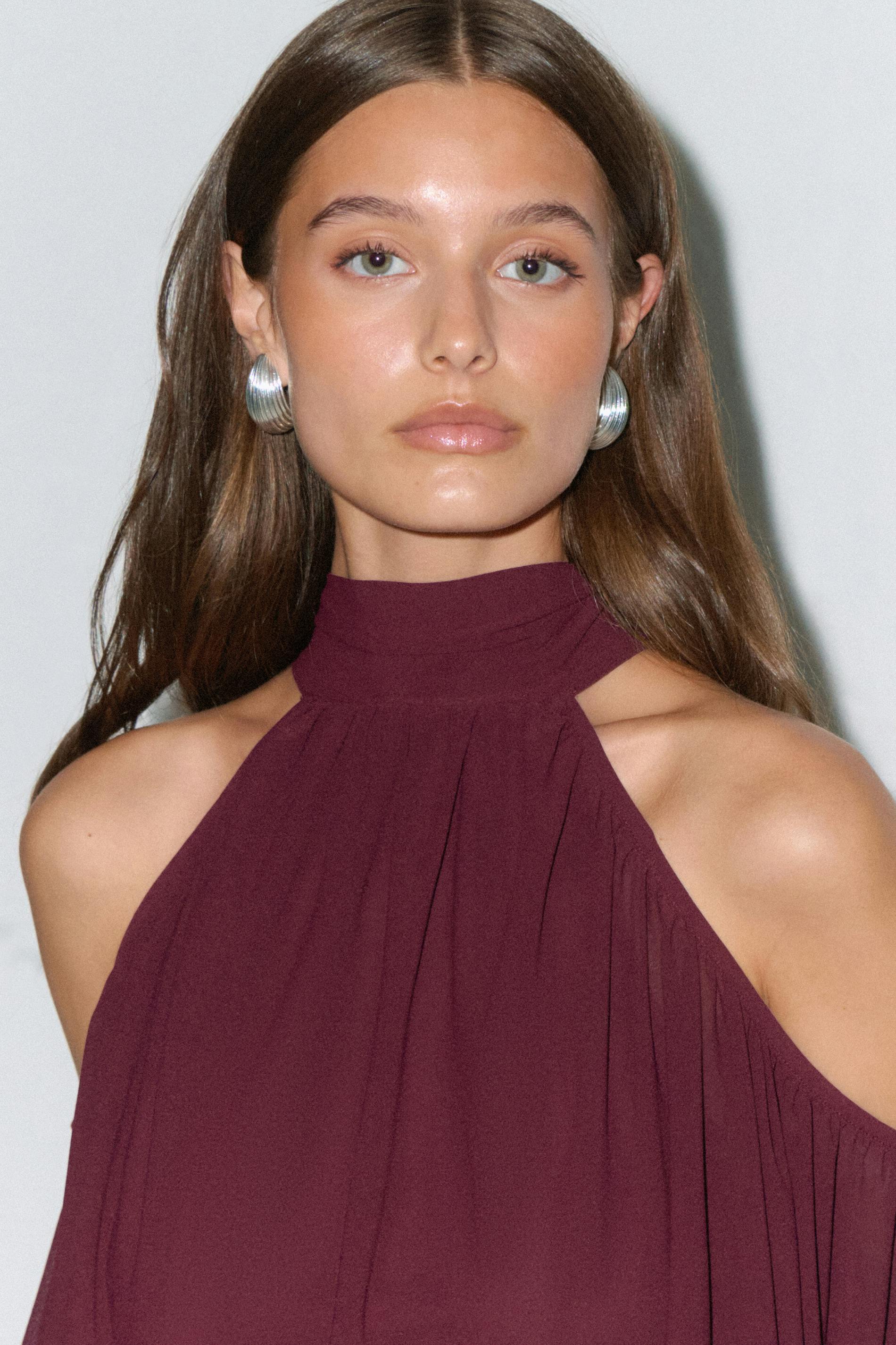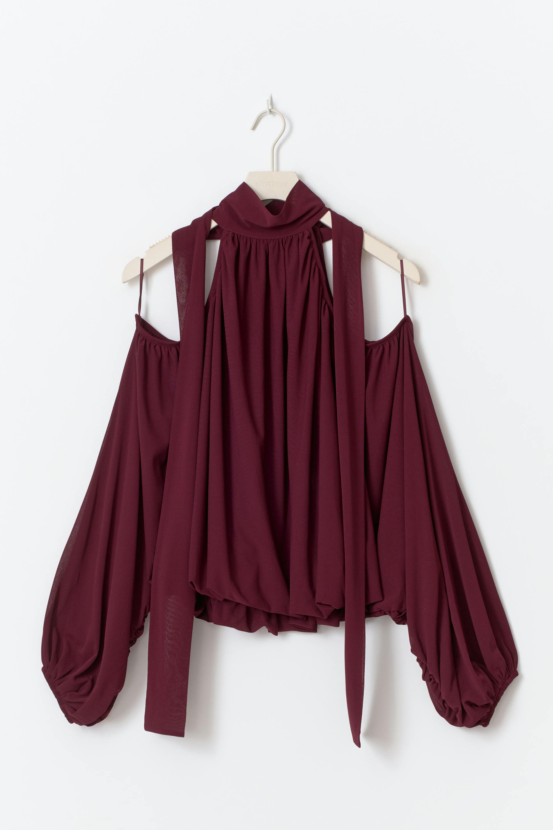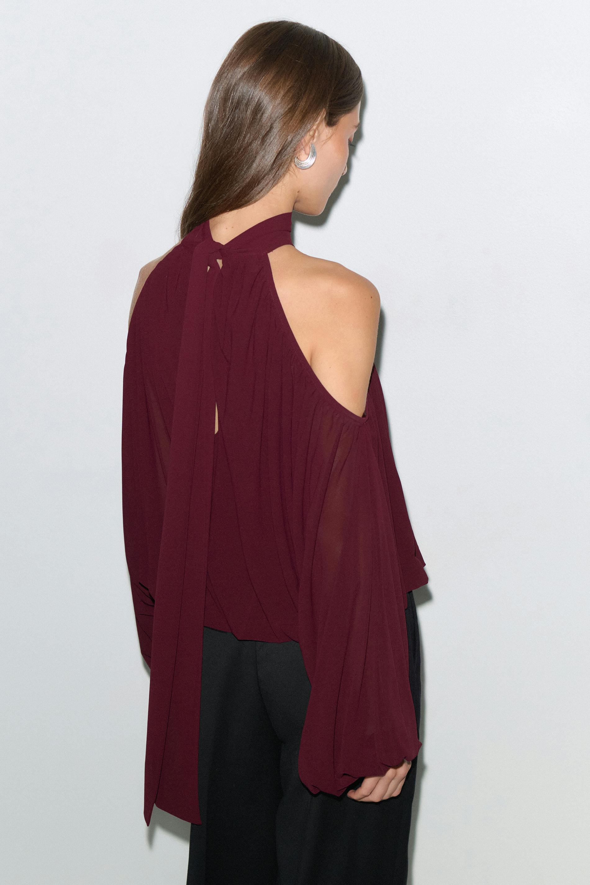 Blus med en halterneckdesign. Blusen är vinröd och har en lång fladdermusärm med cut out på axlarna. Den har knytband i nacken och en lös passform.