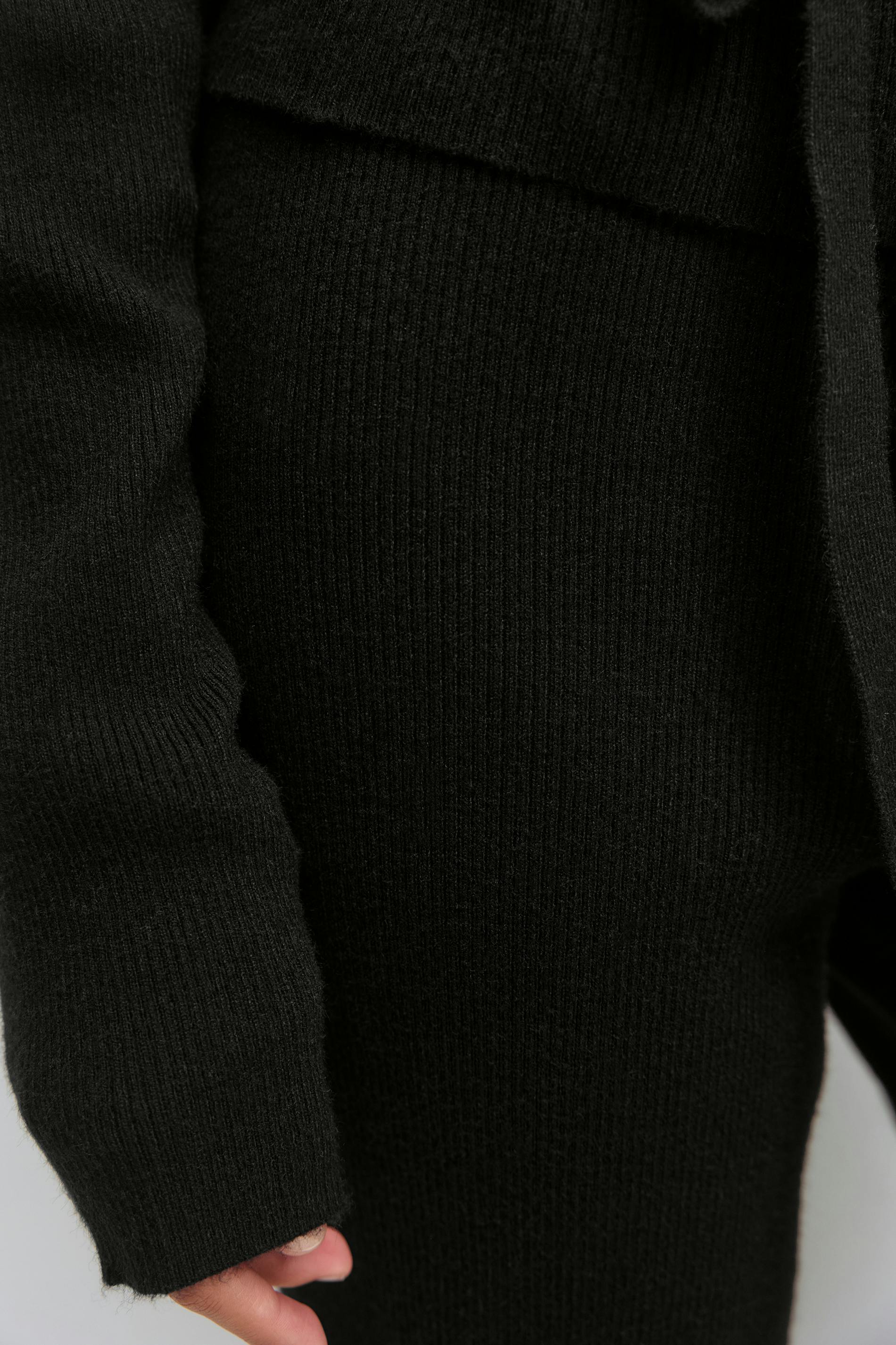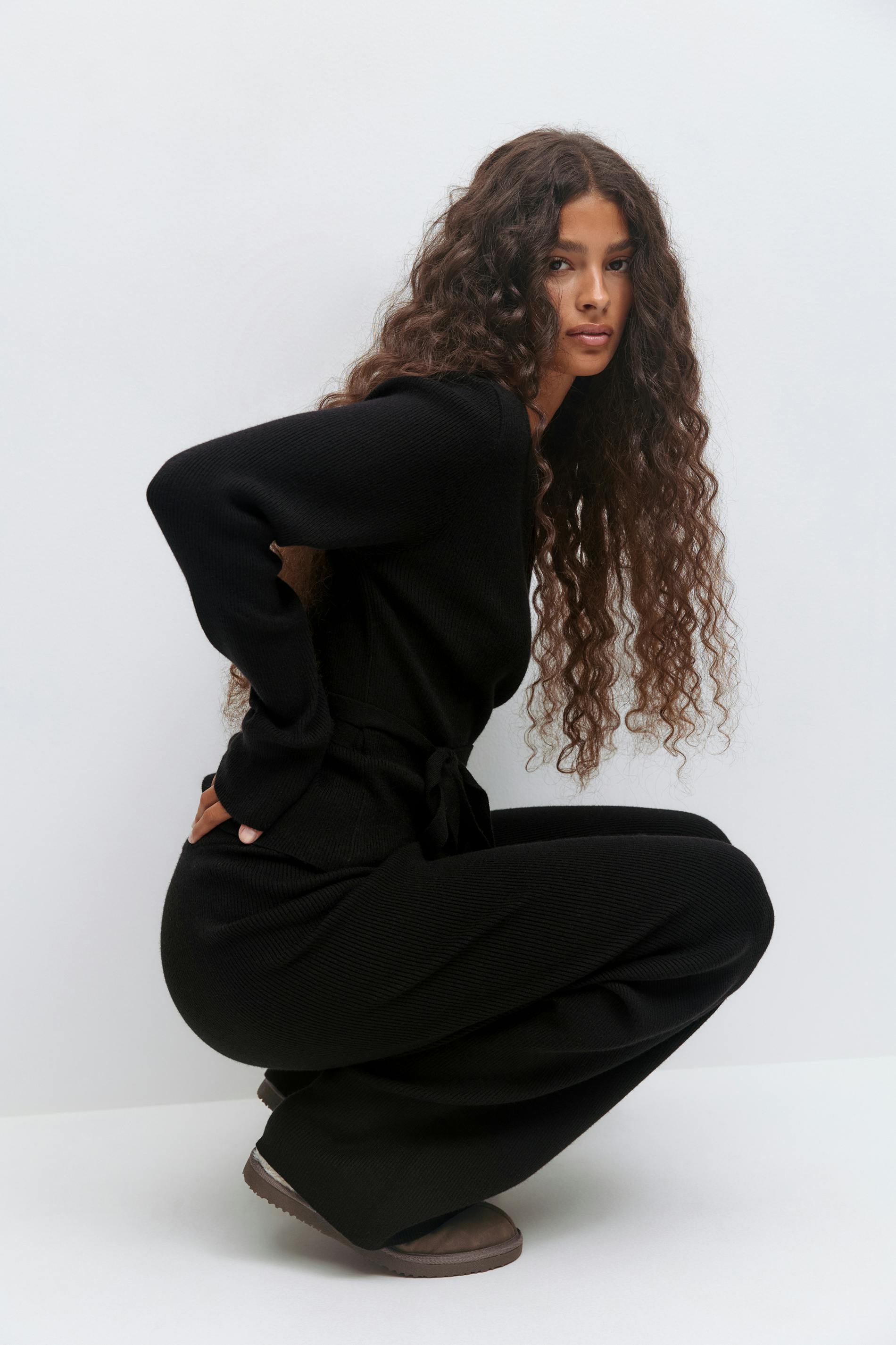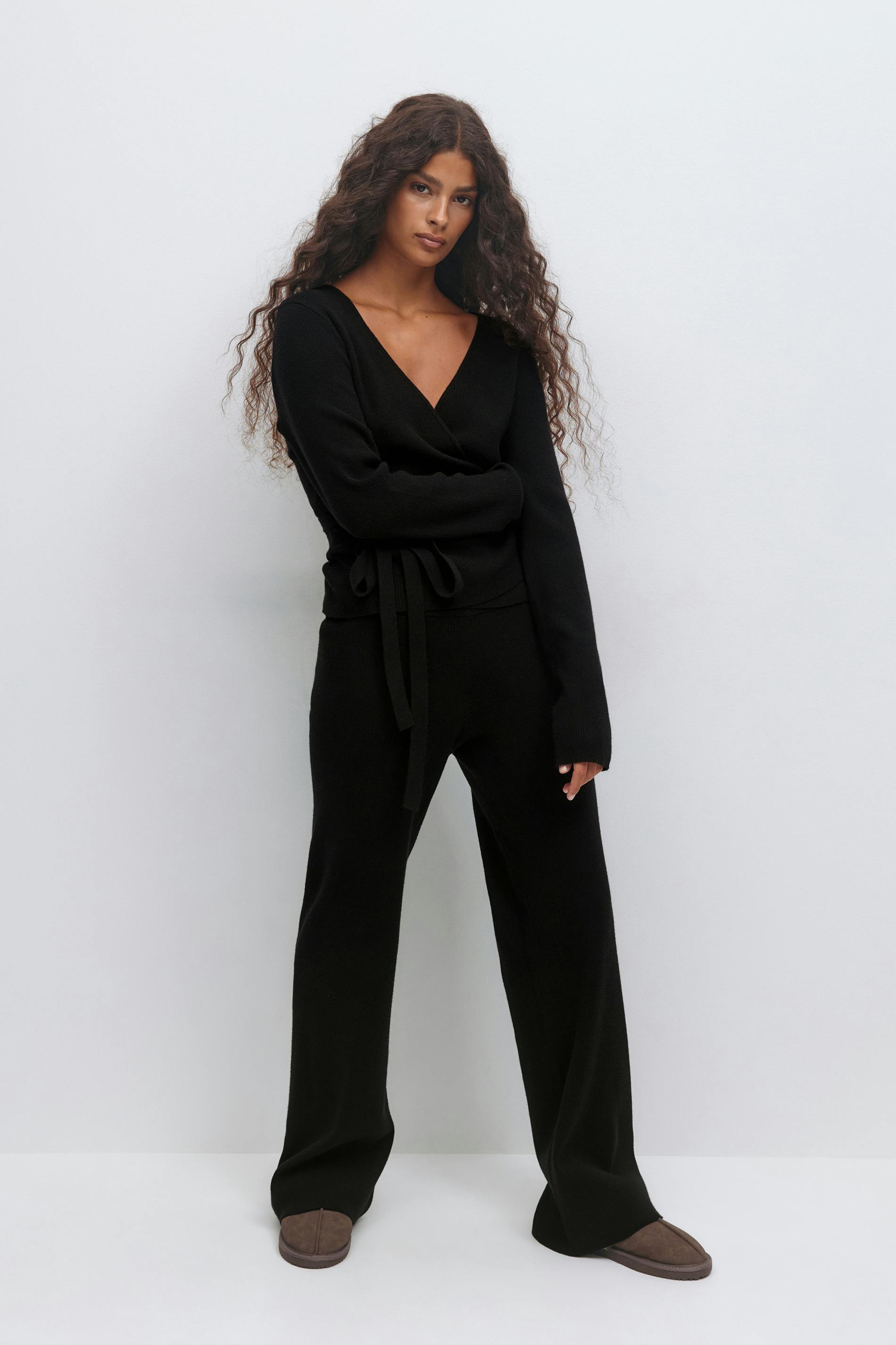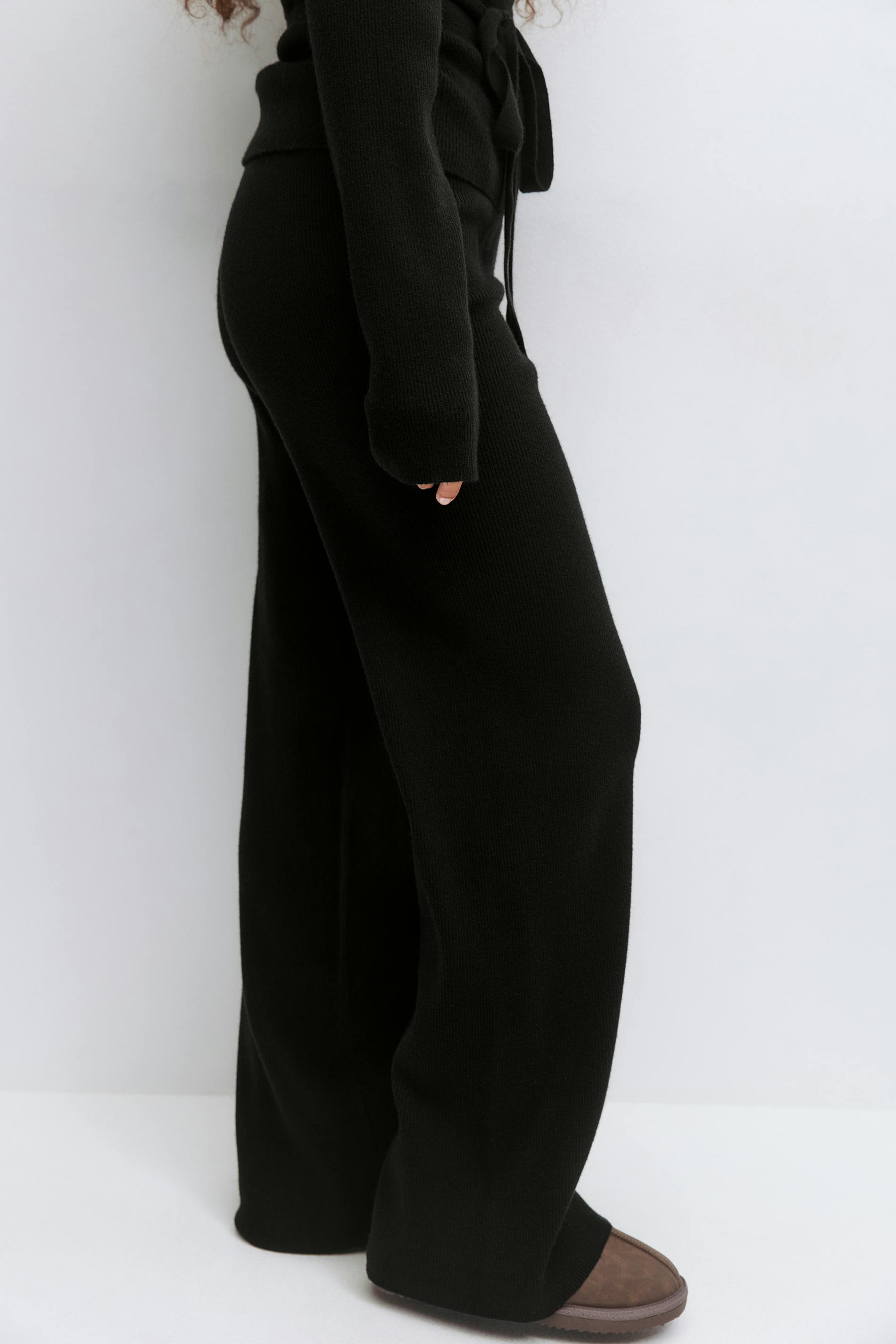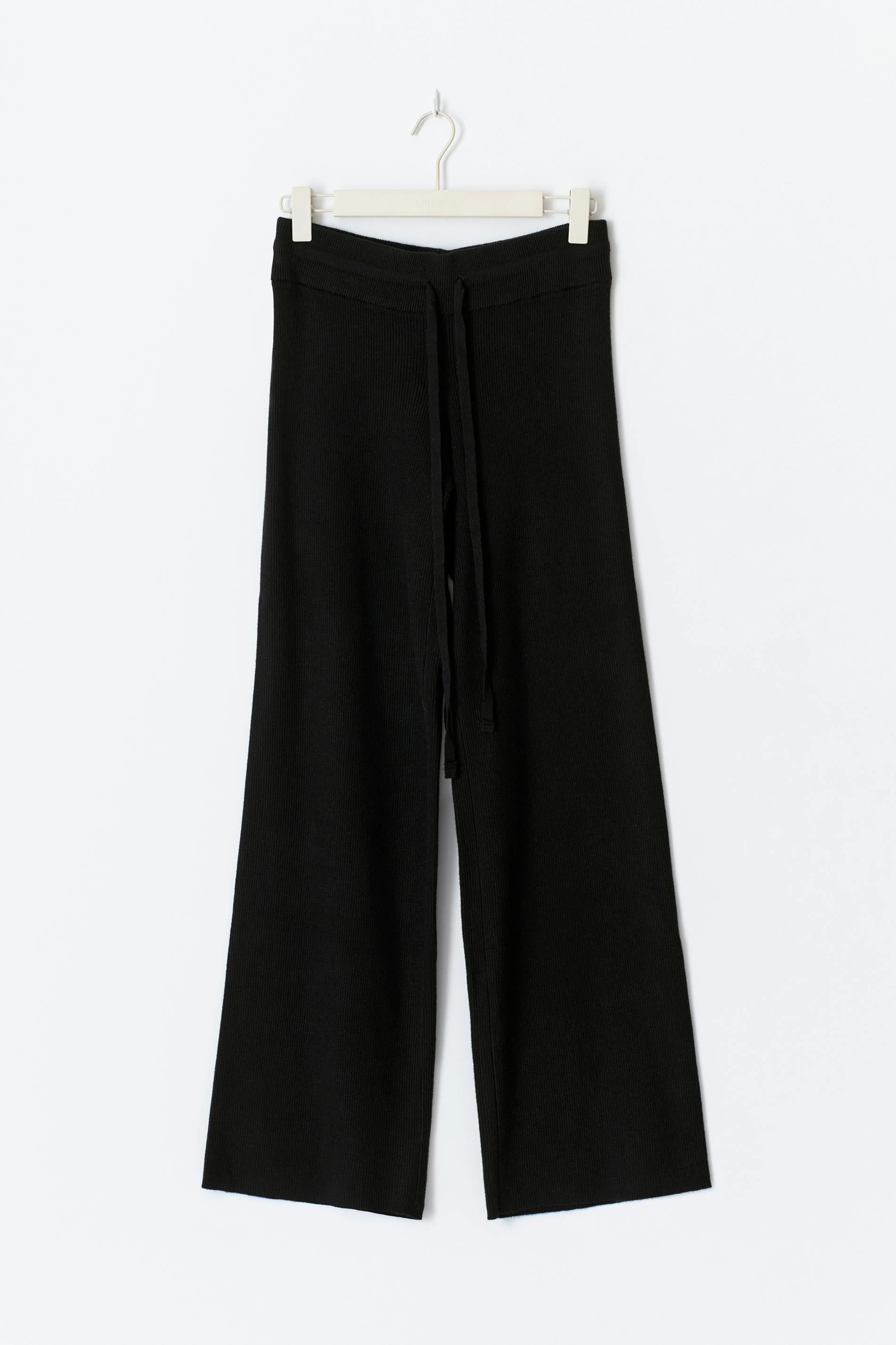 Stickade byxor med en ribbad kvalitet. Byxorna är svarta och har en normalhög midja. De har en normallängd, raka ben, en knytning i midjan och en ribbad linning.