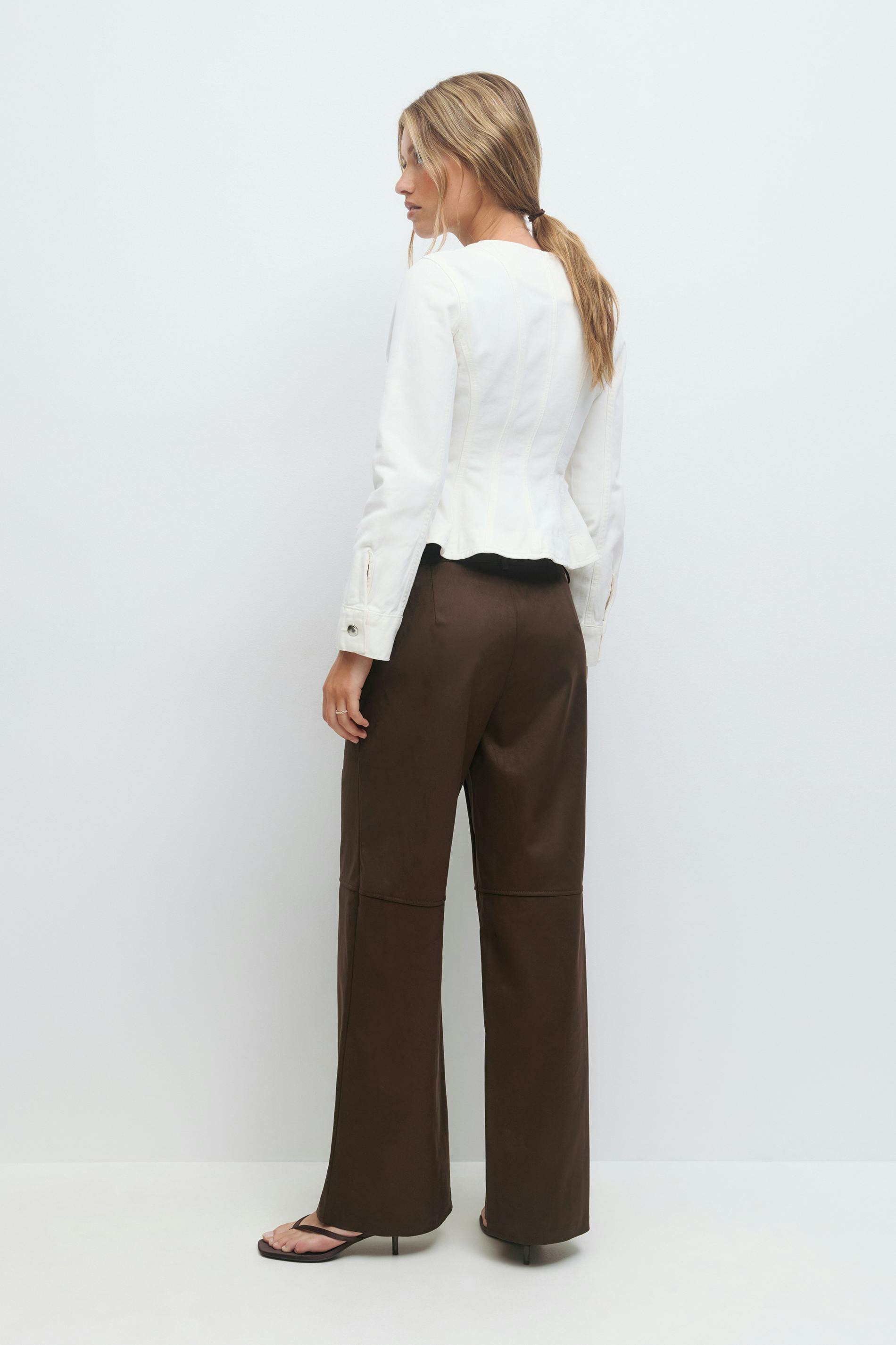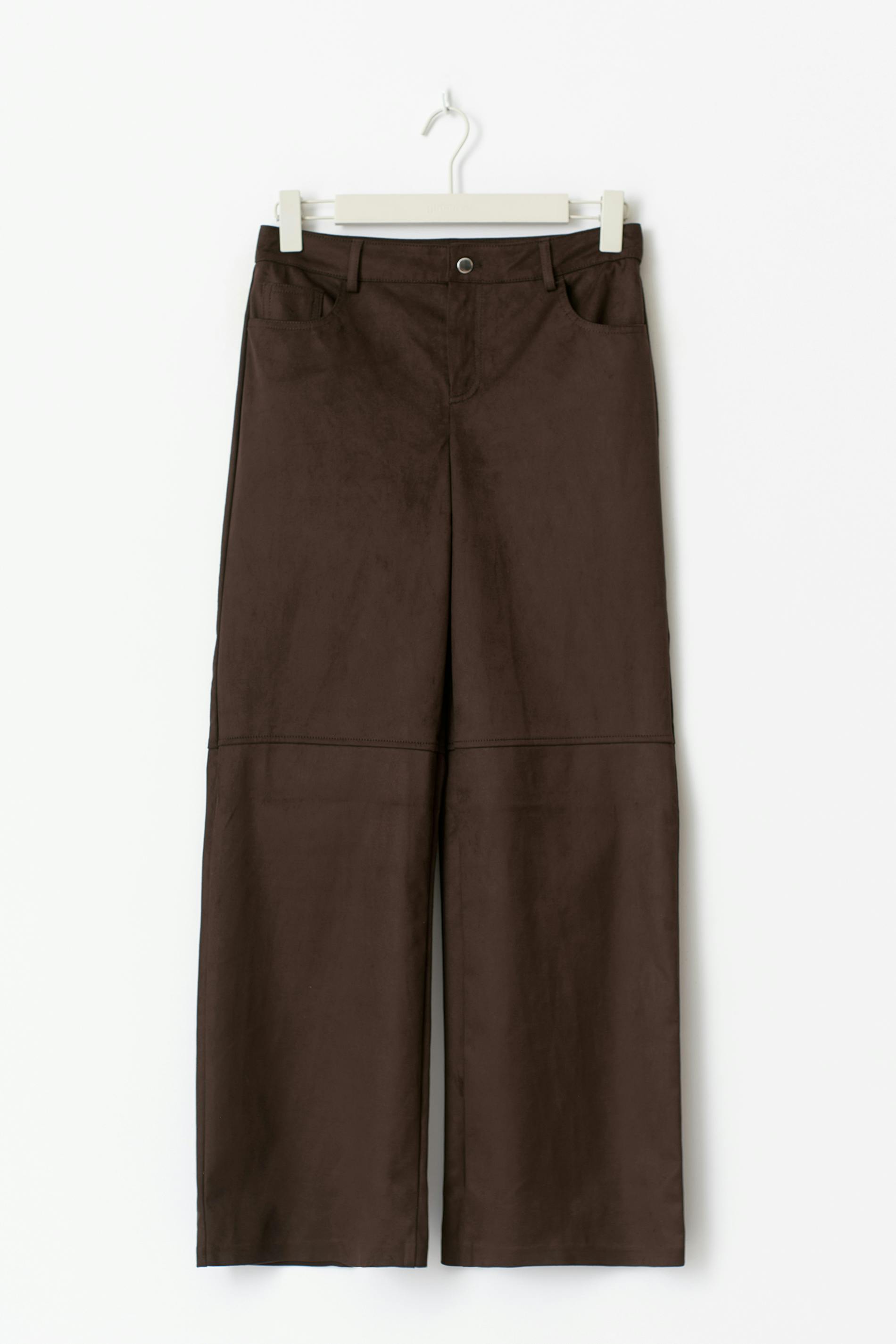 Raka byxor i mockaimitation med en dekorativ söm vid knäna. Byxan är mörkbrun och har en medelhög midja. Den har fickor fram och en dragkedjegylf.
