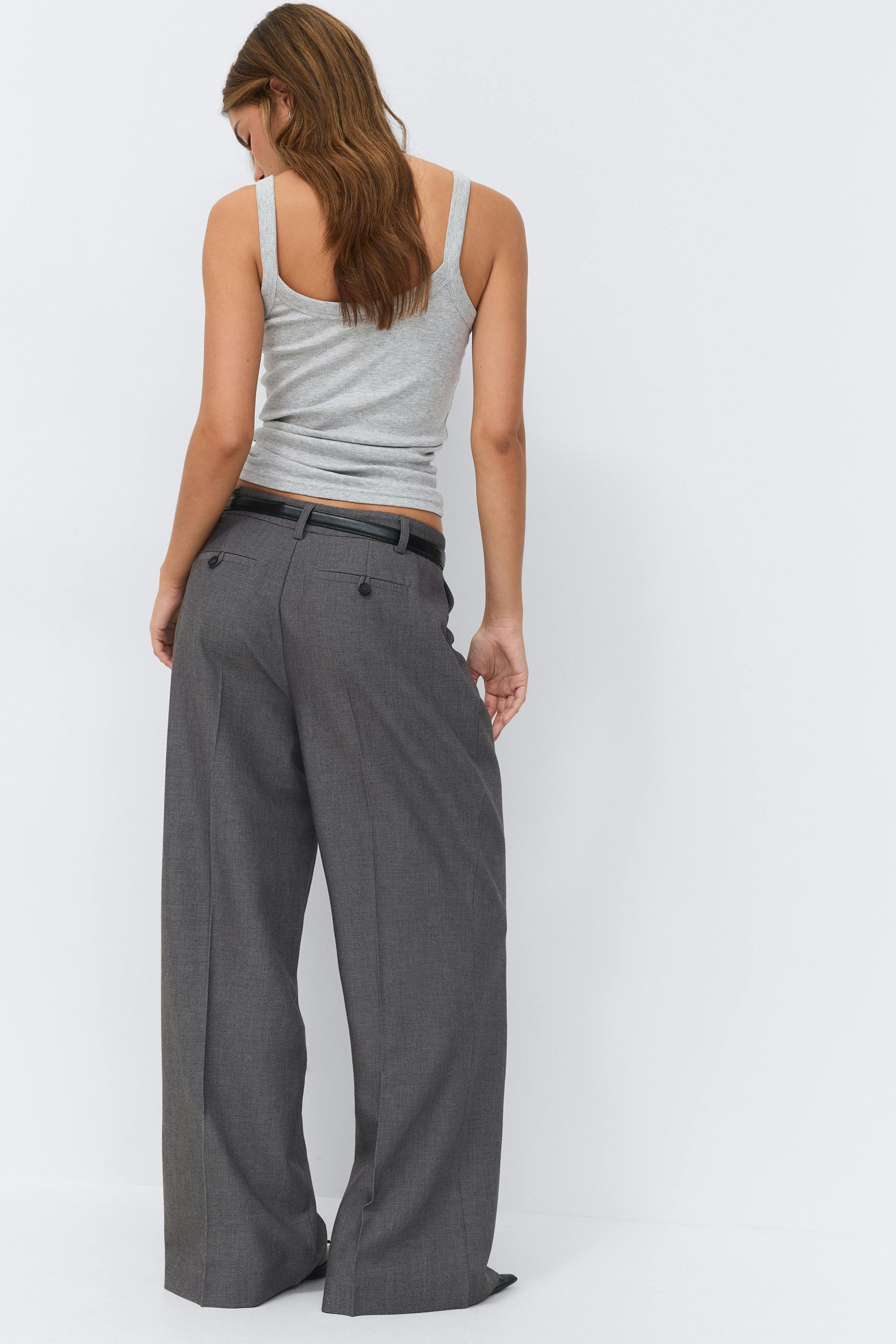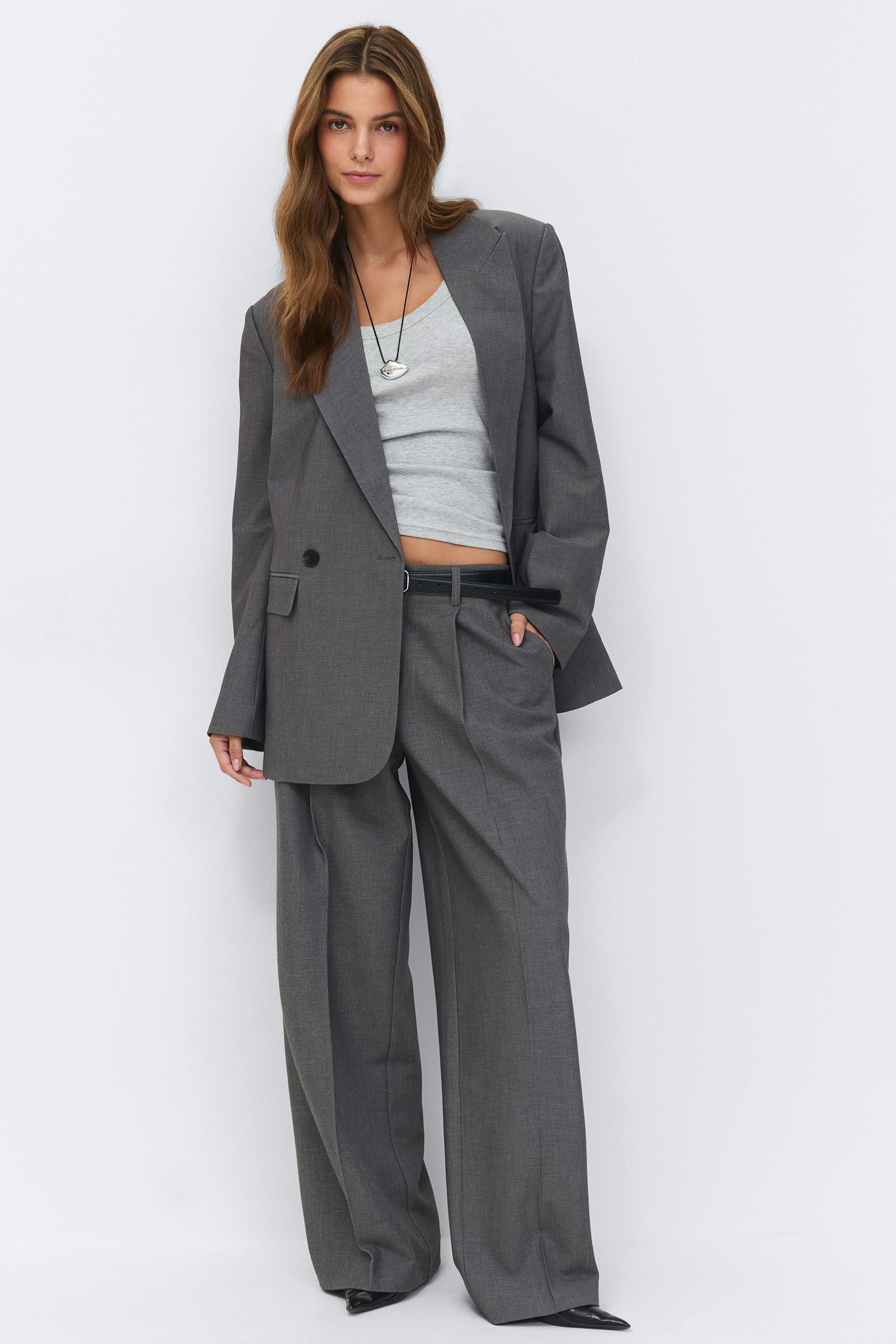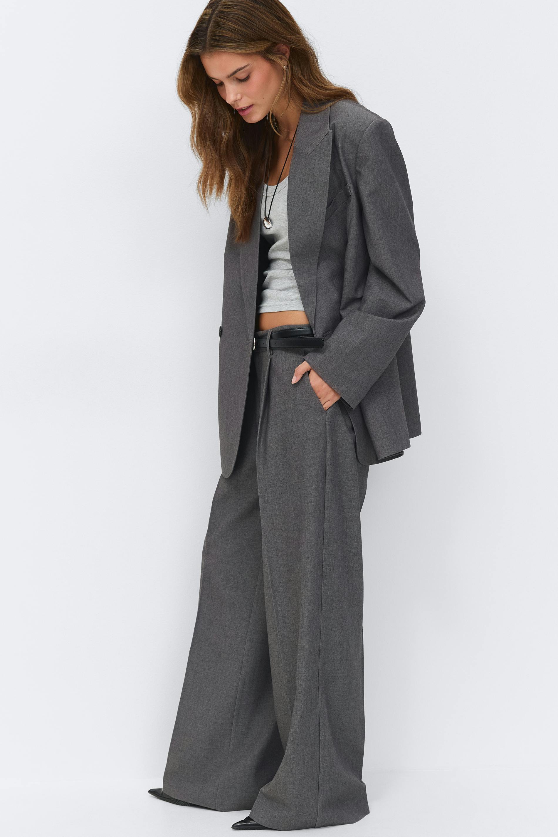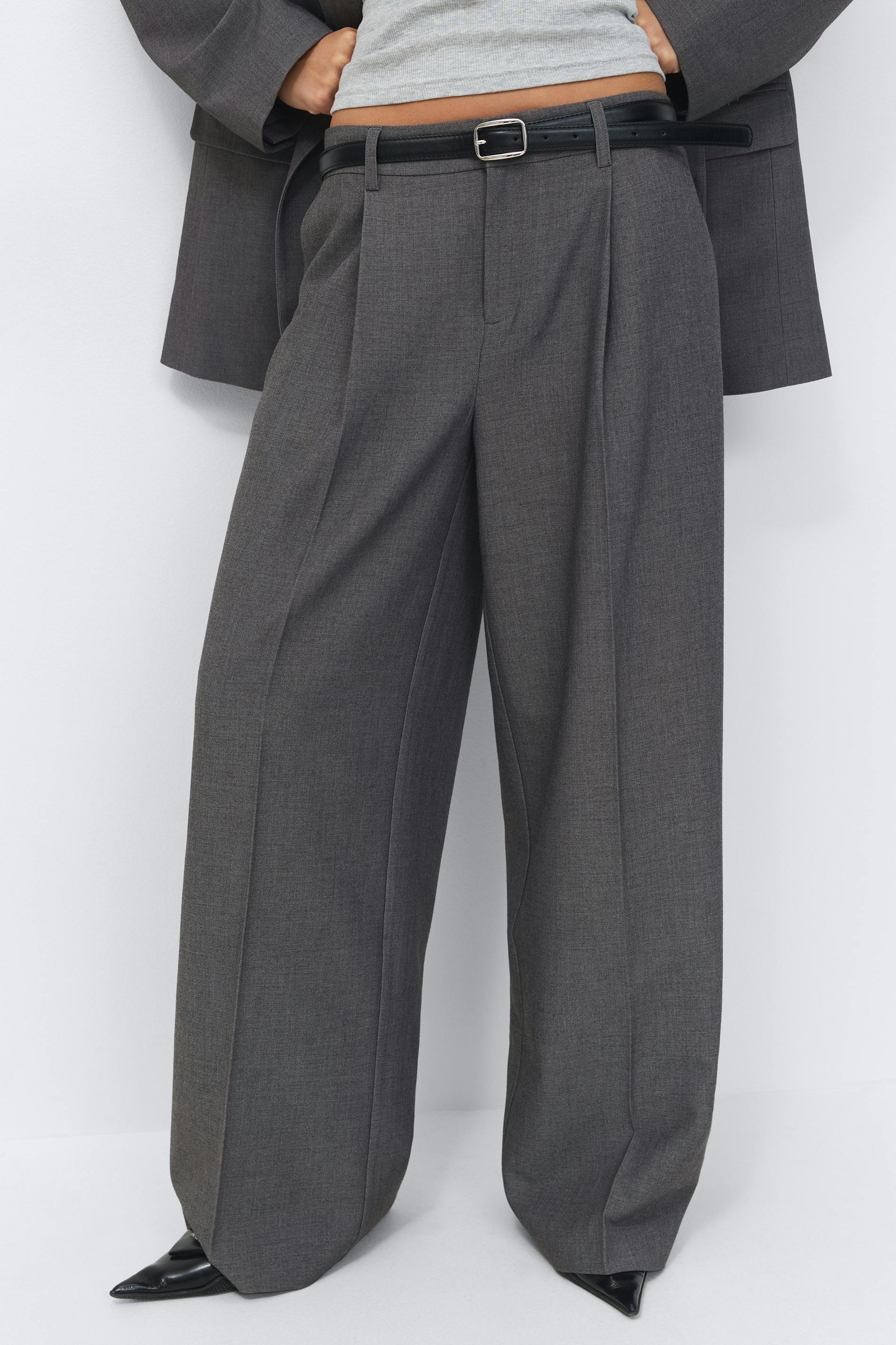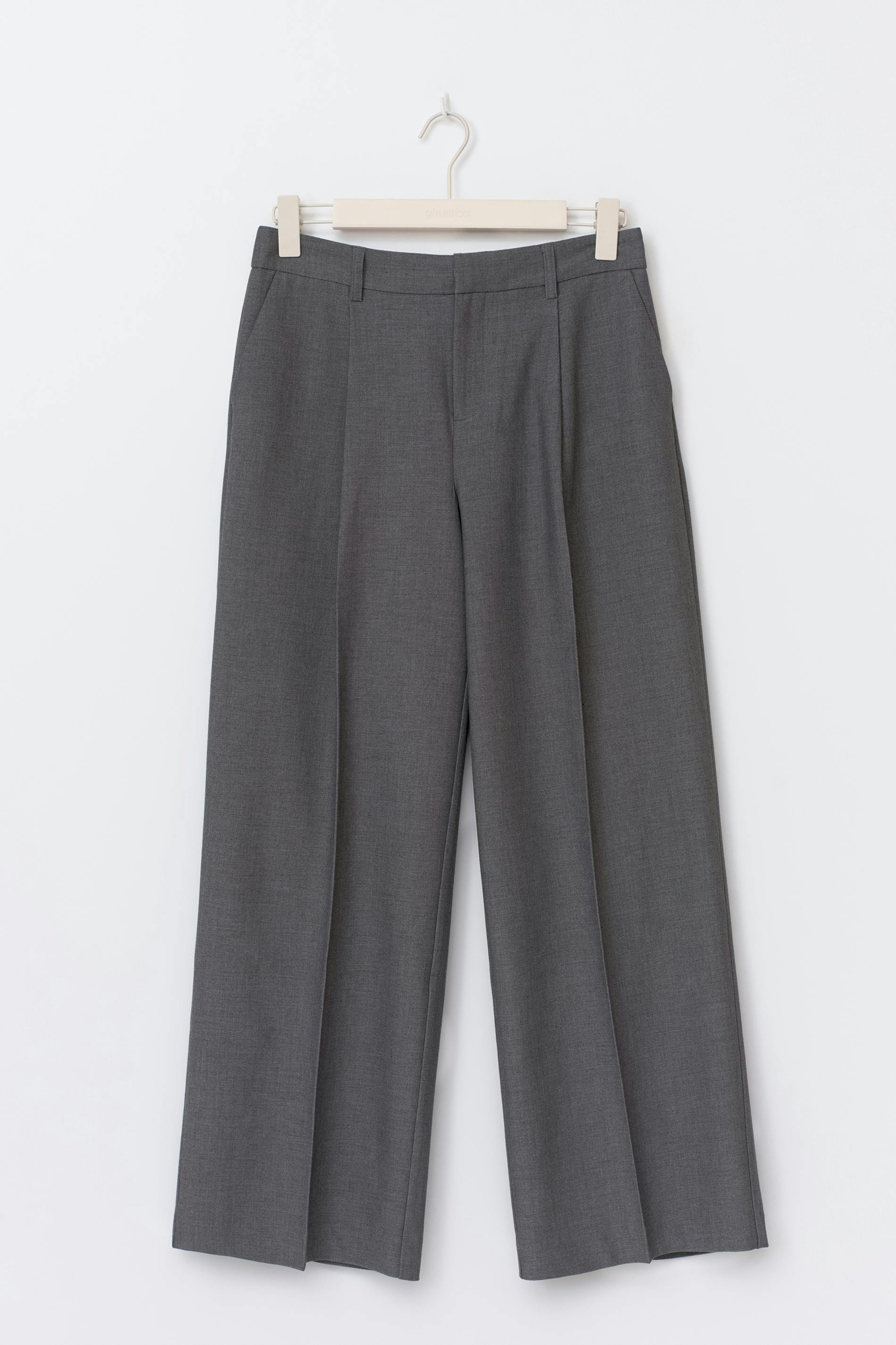 Lågmidjade kostymbyxor med vida ben. Byxorna är gråa och har fickor i sidorna. De har veck fram och bak, en dragkedjegylf, bälteshälla och bakfickor med knapp.