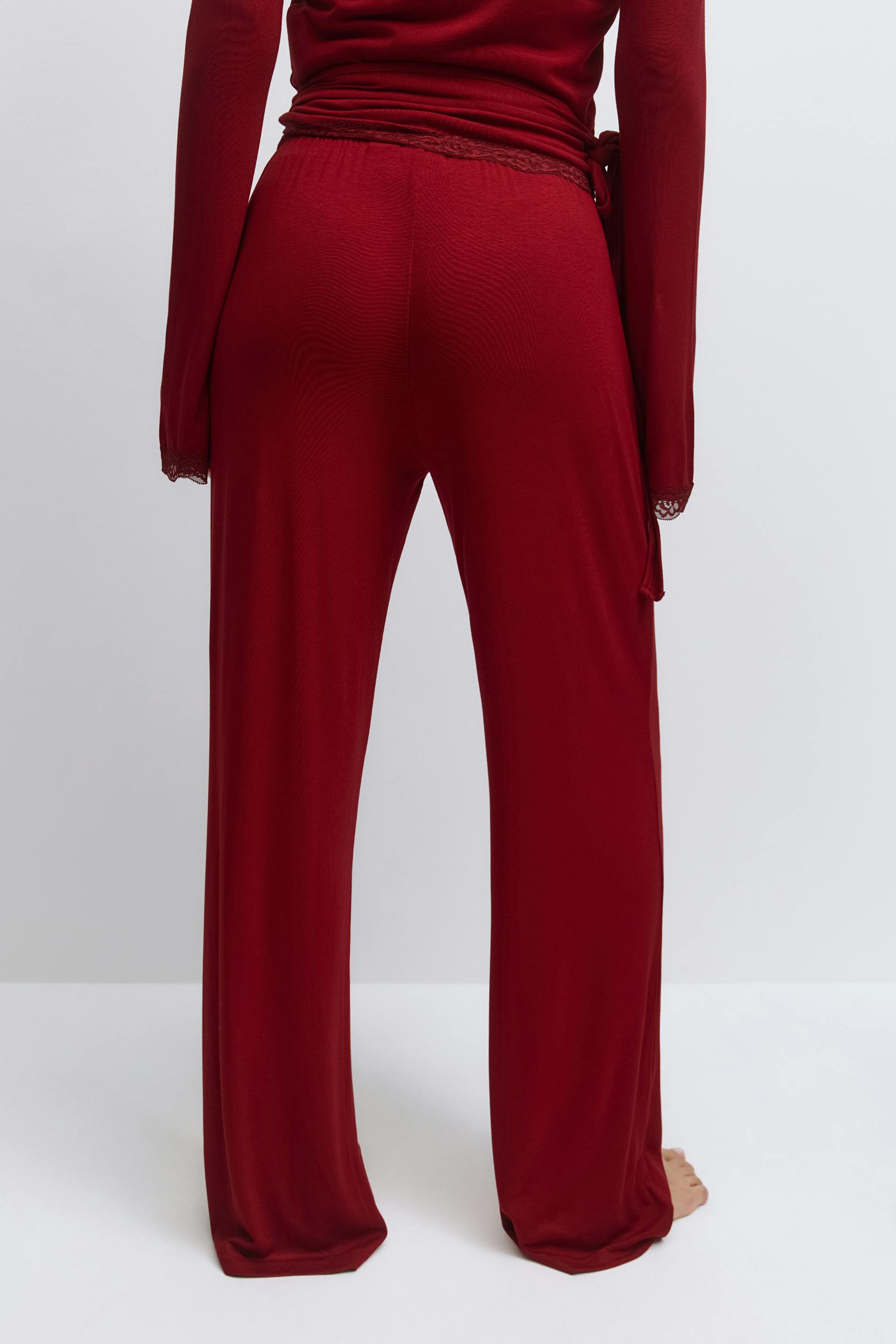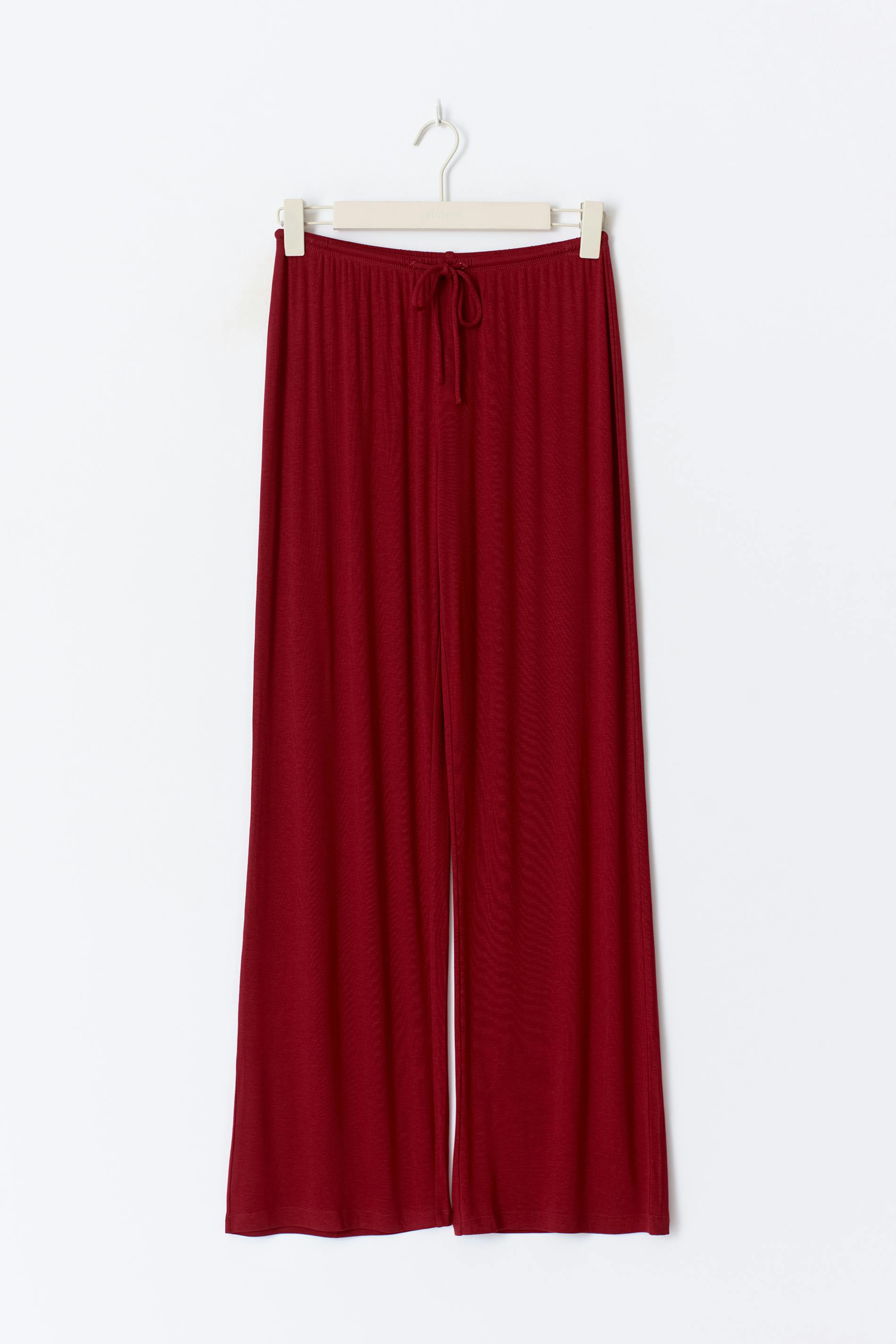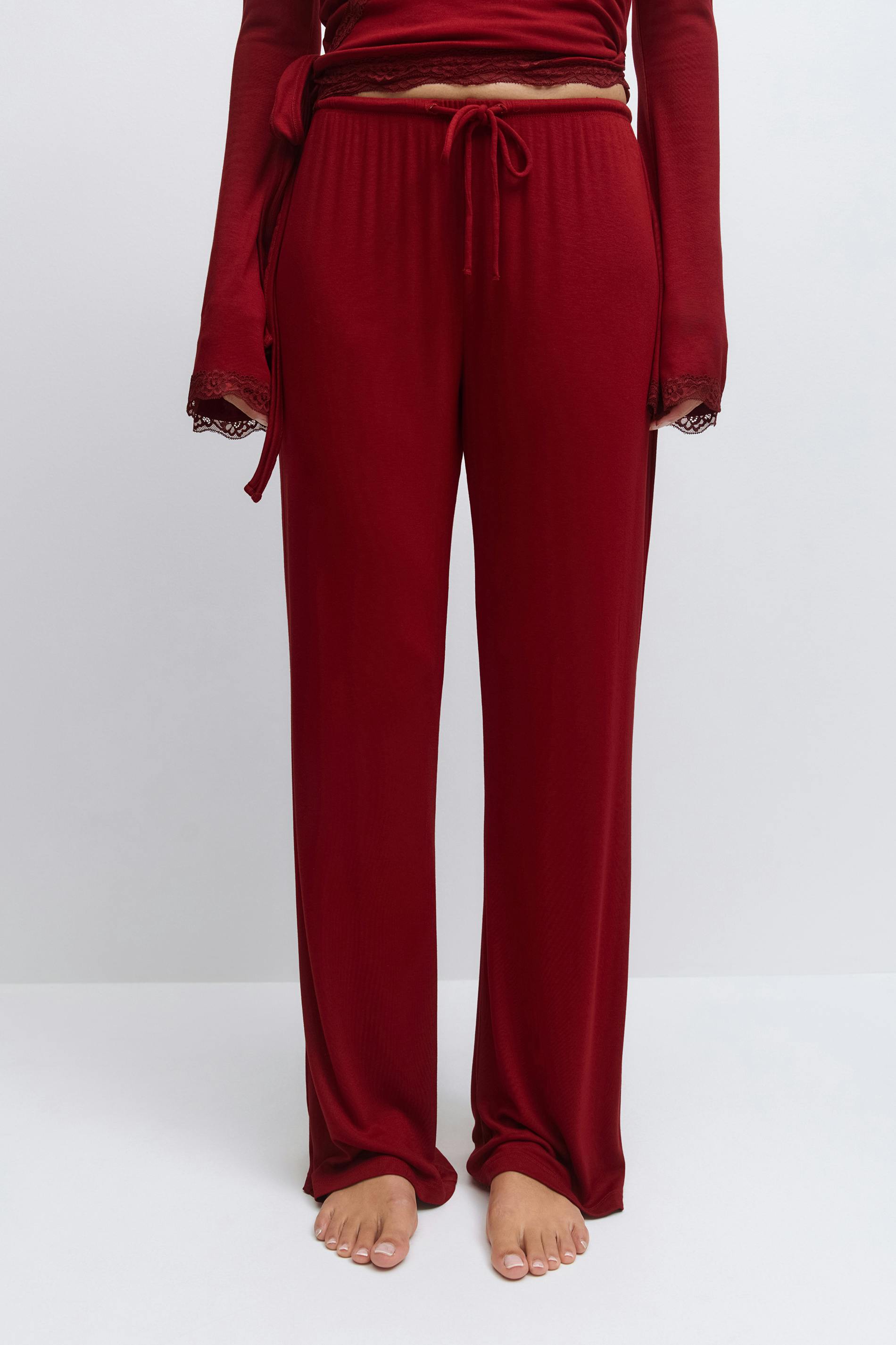 Mjuka pyjamasbyxor med oversize fit. Pyjamasbyxorna är röda och har knytning fram. De har medelhög midja med resår och raka ben med fullängd.