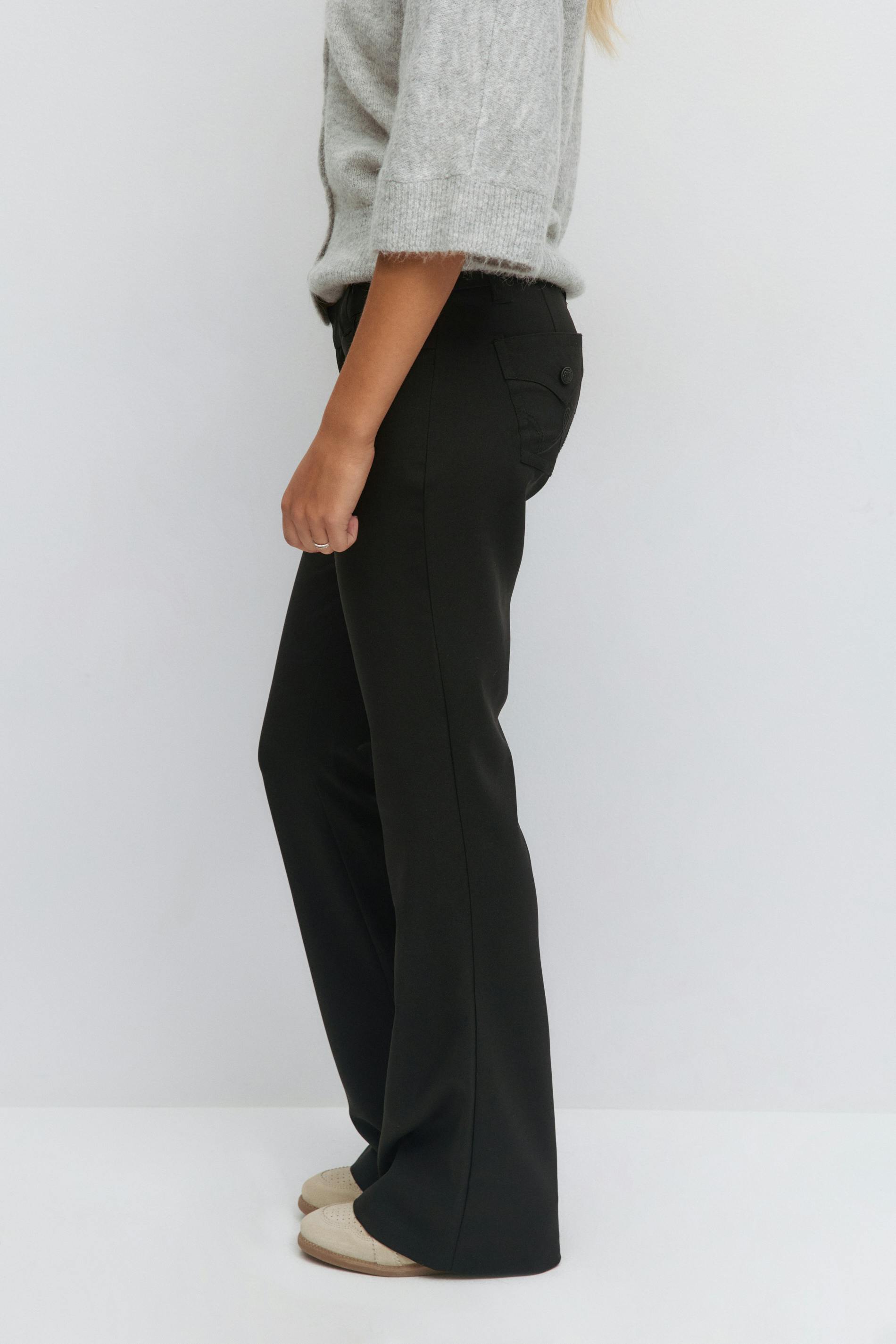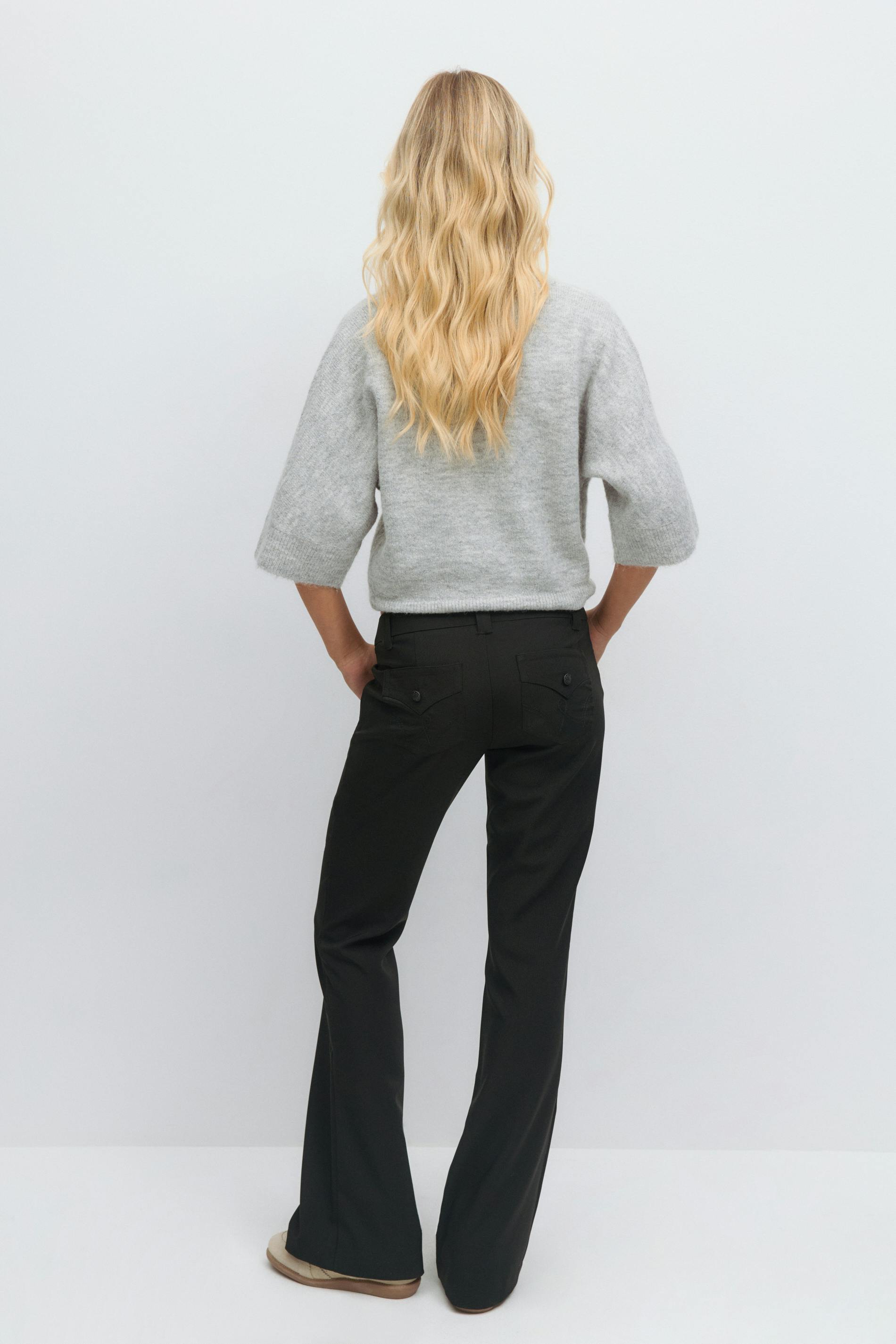Lågmidjade kostymbyxor med utsvängda ben. Byxorna är svarta och har figurnära passform. De har fickor i sidorna, dragkedjegylf, bälteshällor och bakfickor med knapp och lock.