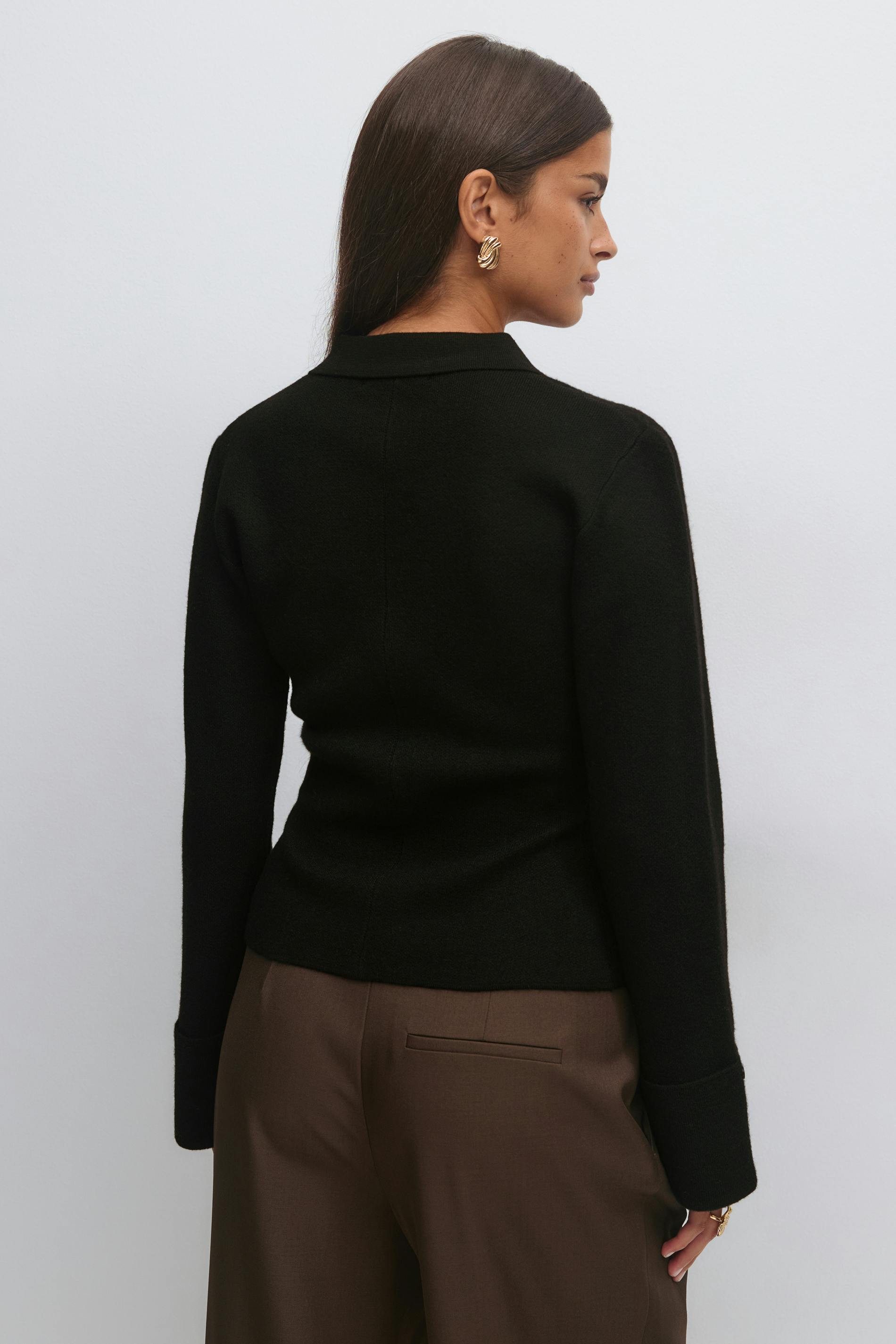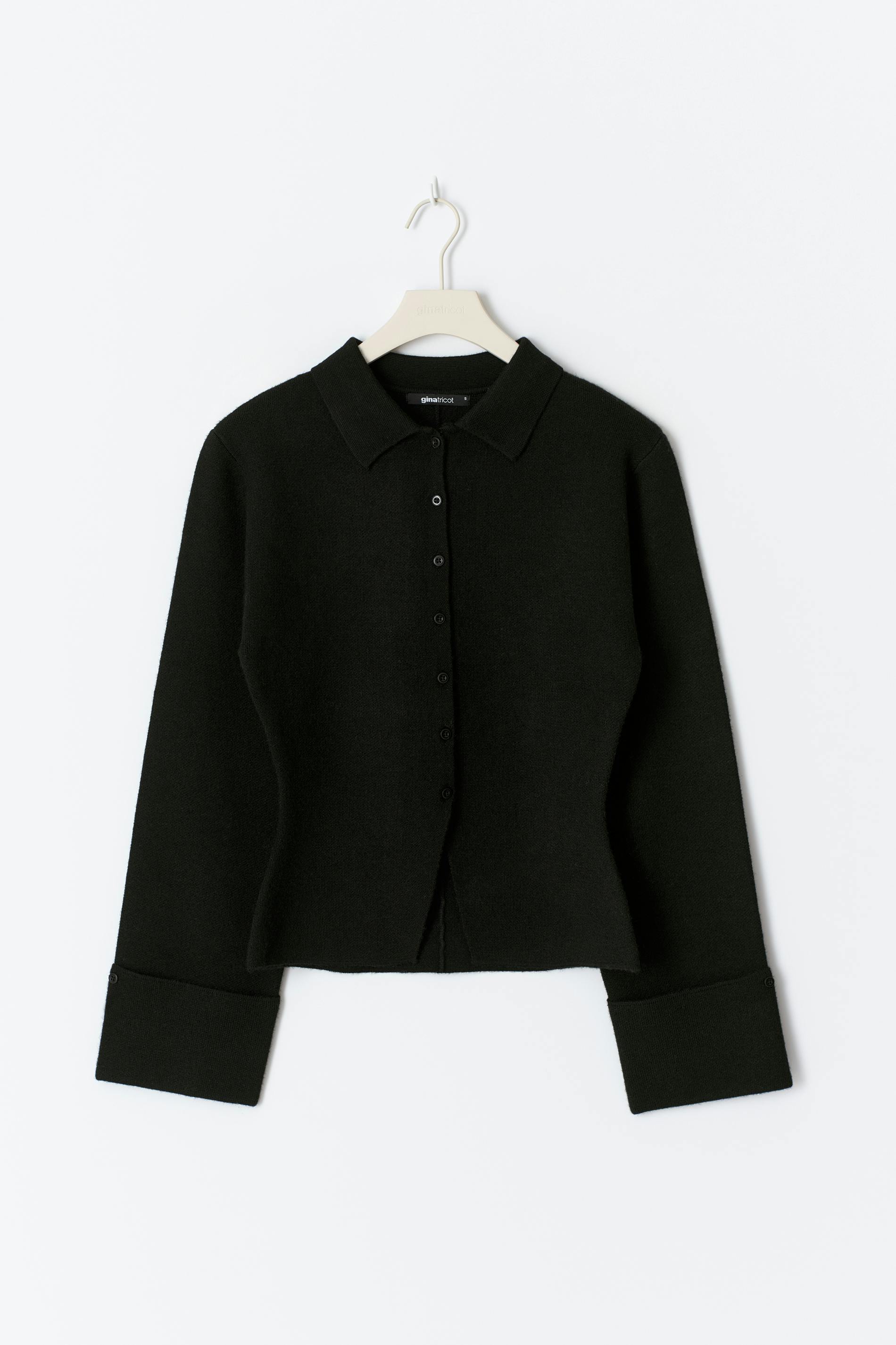 Figursydd kofta med krage. Koftan är svart och har knappar framtill. Den har intagen midja, långa ärmar och uppvikt ärmslut.