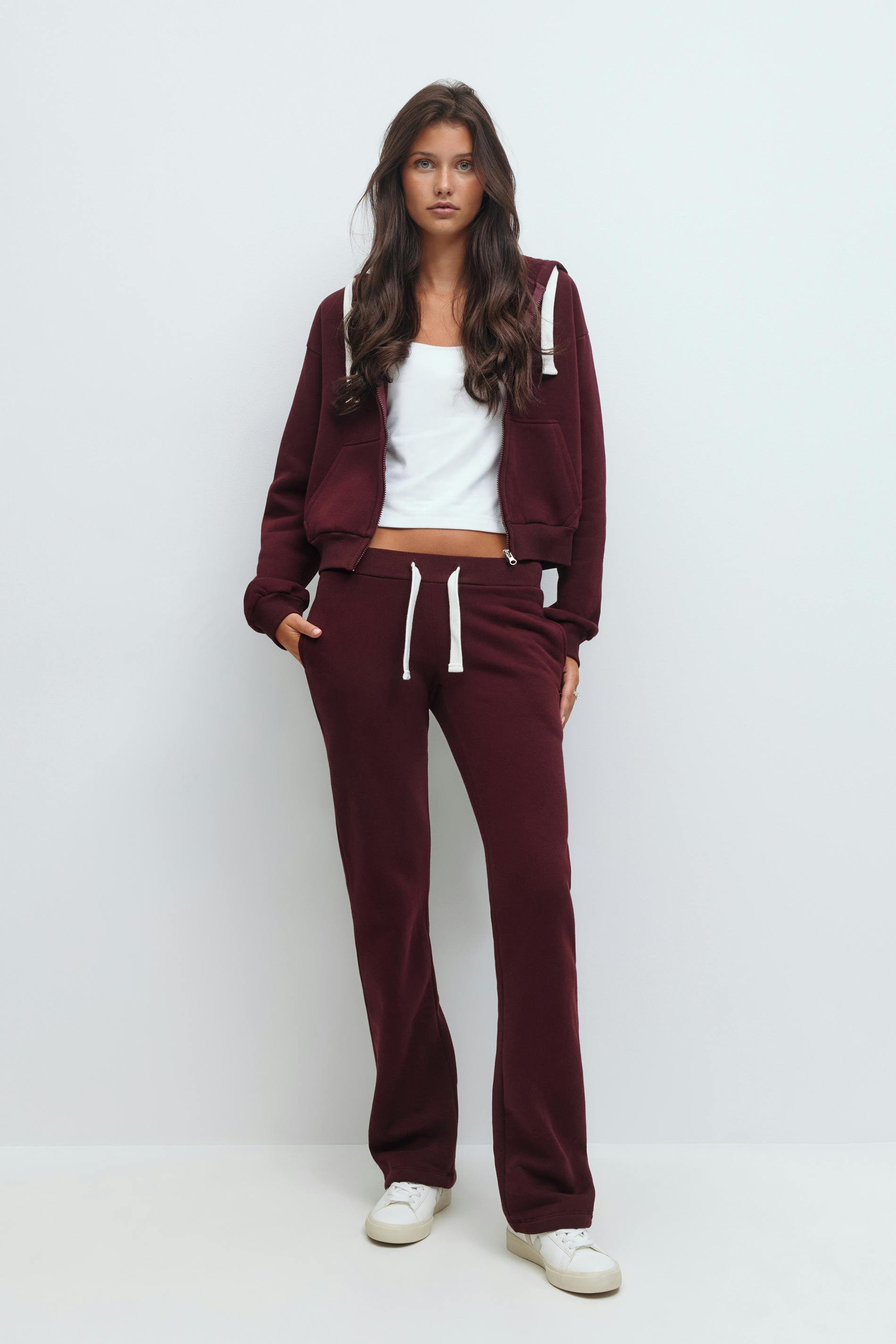 Lågmidjade mjukisbyxor med bakfickor. Byxorna är vinröda och har justerbara knytband framtill. De har vida ben, fickor i sidorna, resår i midjan och normal passform.