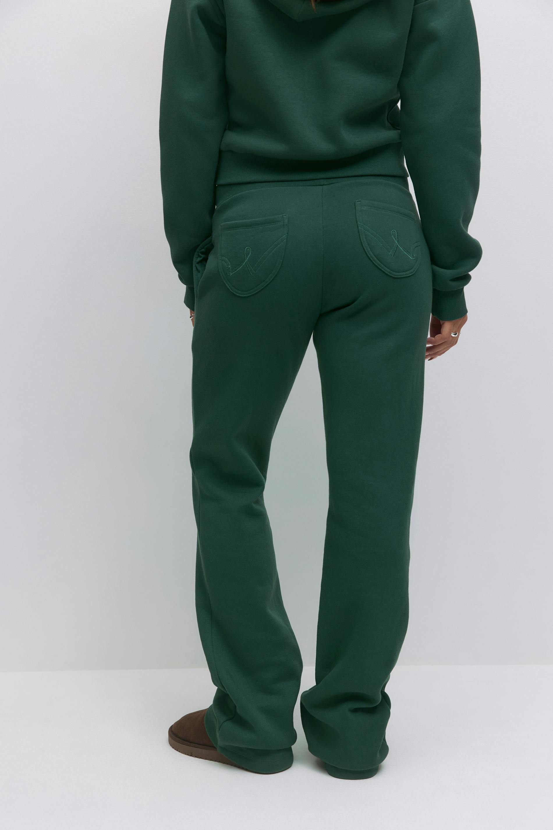 Lågmidjade mjukisbyxor med bakfickor. Byxorna är gröna och har justerbara knytband framtill. De har vida ben, fickor i sidorna, resår i midjan och normal passform.