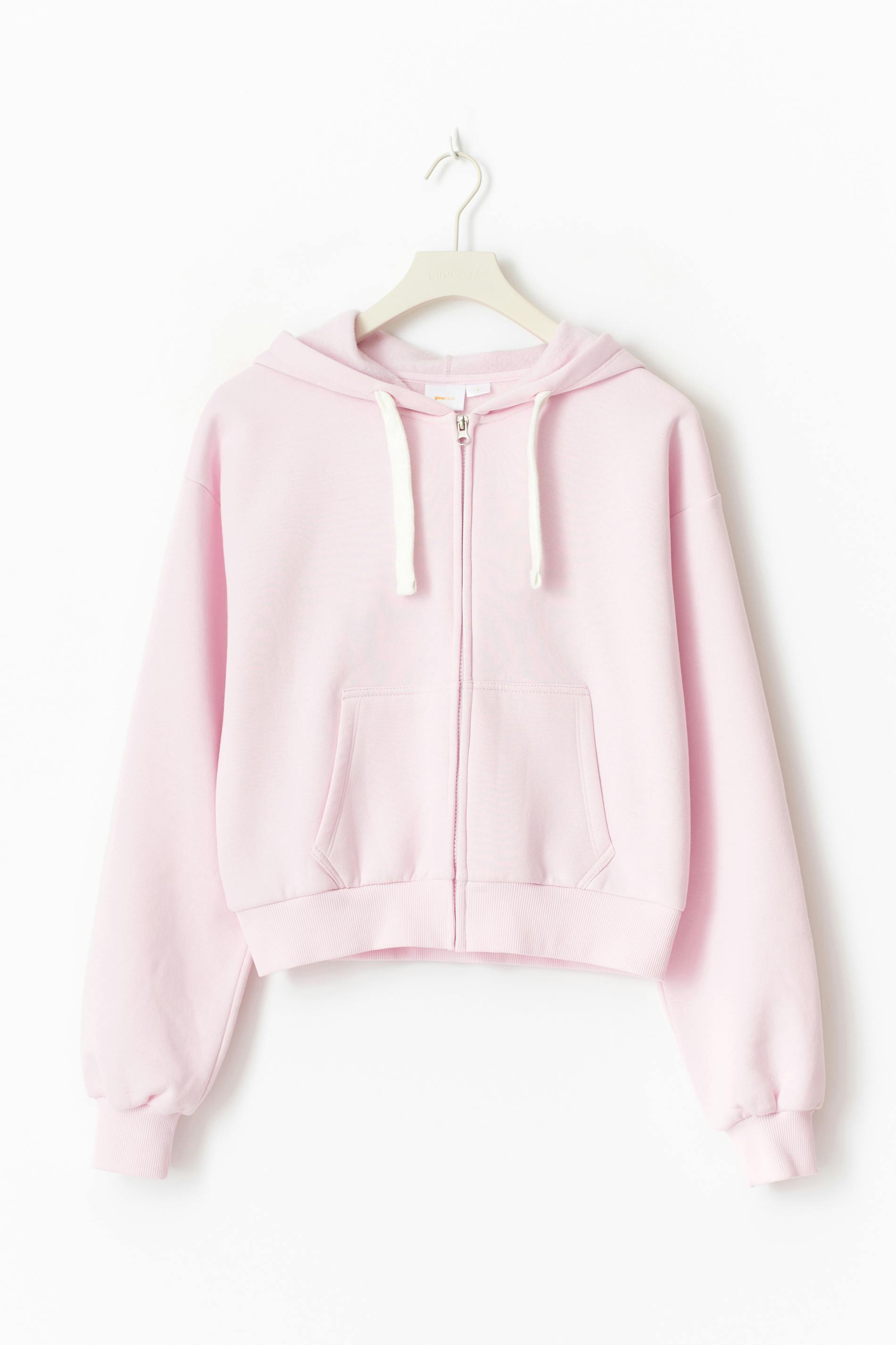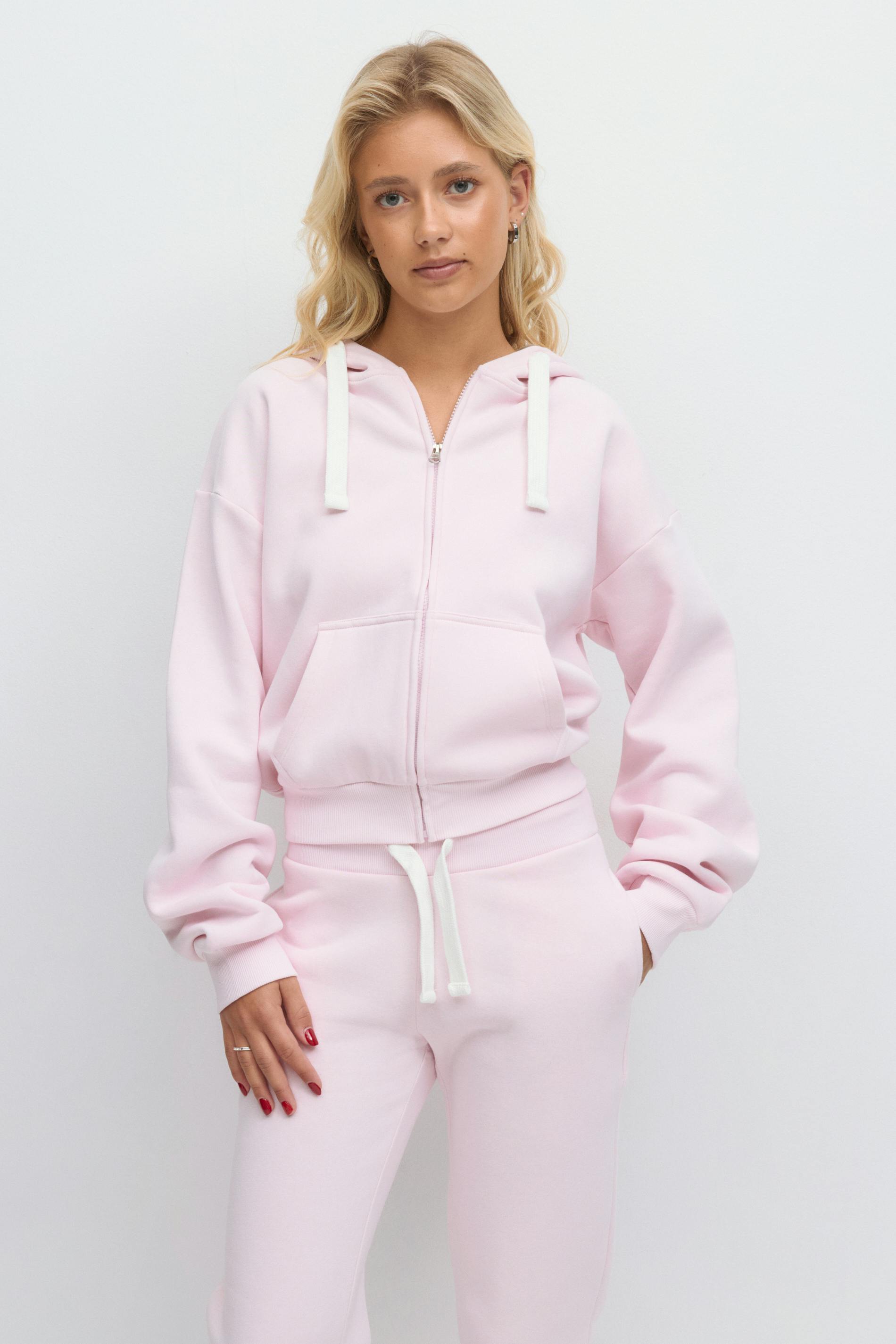Huvtröja med dragkedja fram. Tröjan är rosa och har huva med dragsko. Den har fickor framtill, ribbad mudd vid ärmslut och i nederkant, mjukt tyg och generös passform.