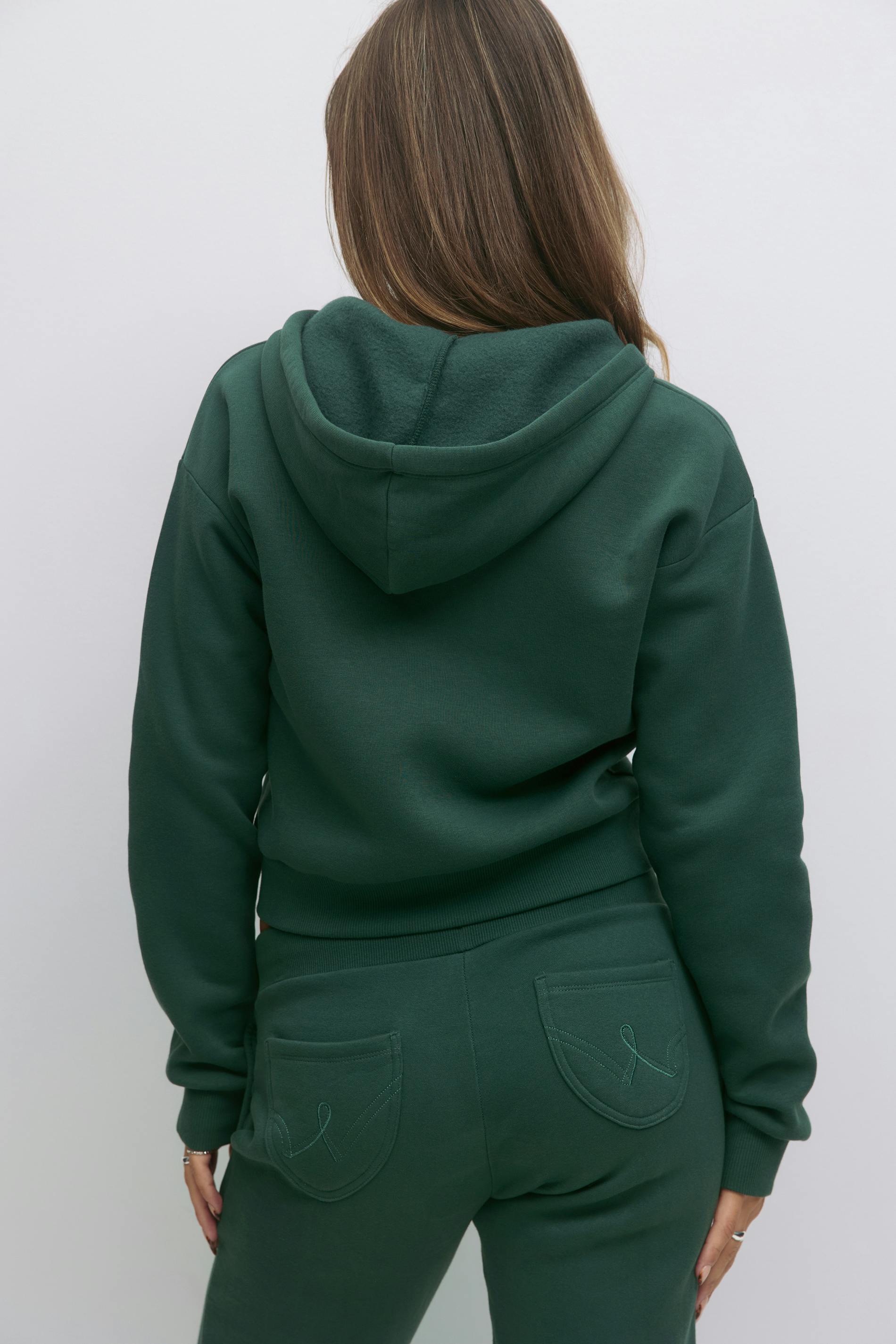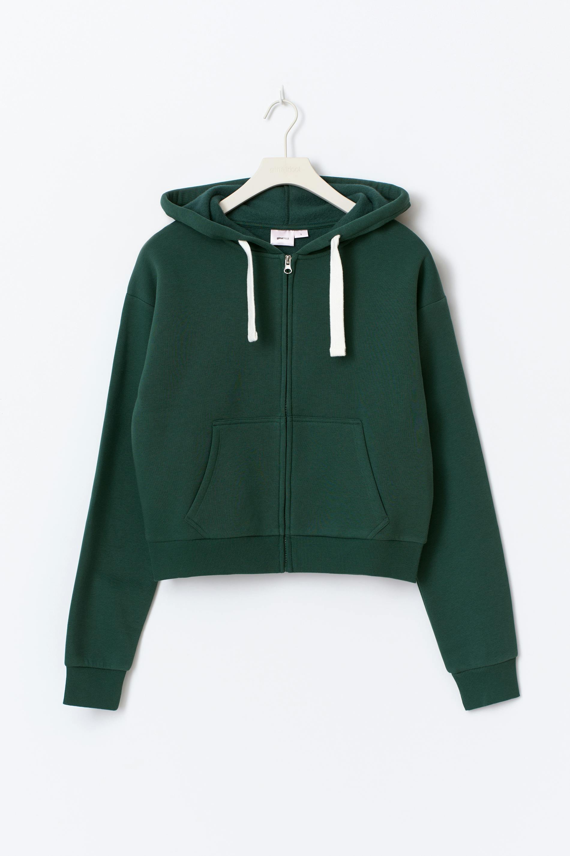 Huvtröja med dragkedja fram. Tröjan är grön och har huva med dragsko. Den har fickor framtill, ribbad mudd vid ärmslut och i nederkant, mjukt tyg och generös passform.