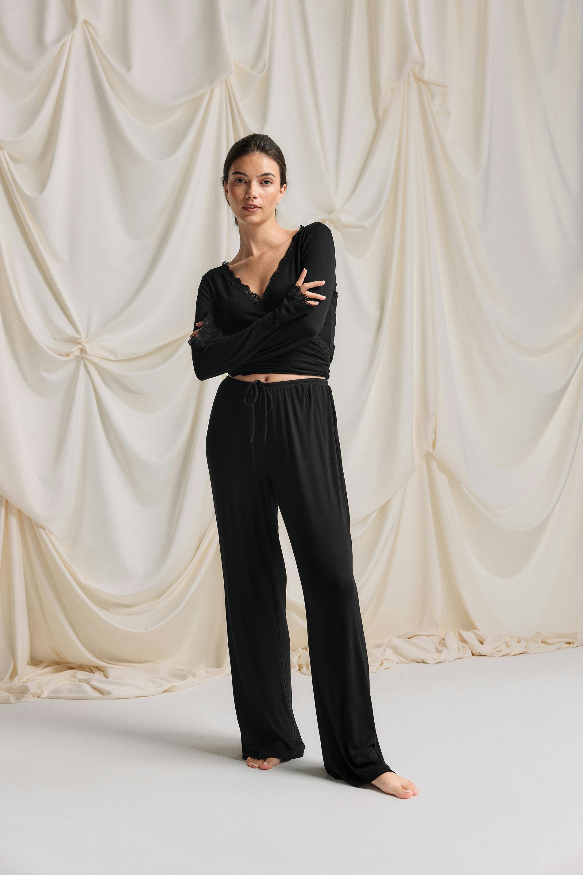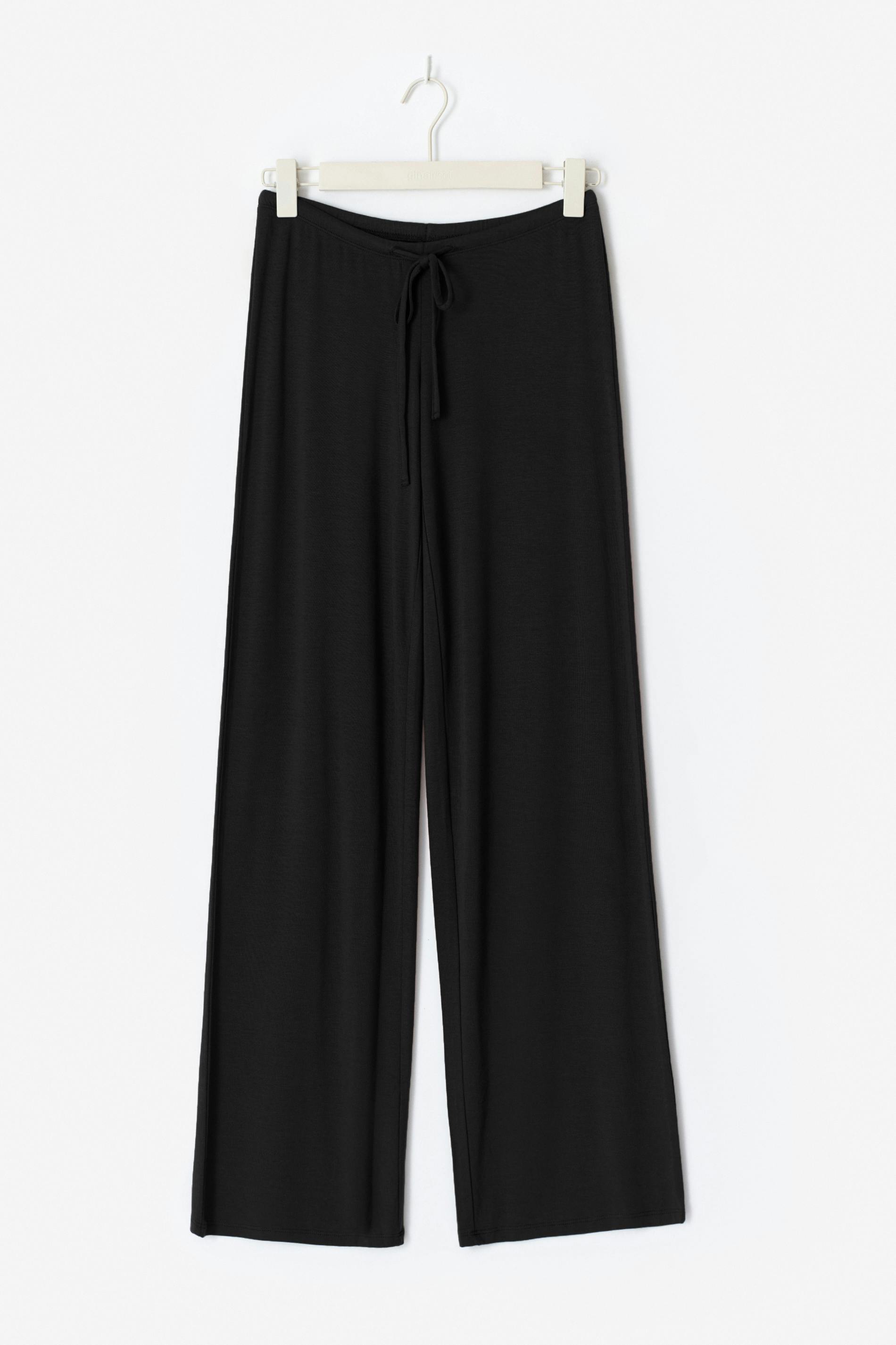 Mysbyxor med mjuk kvalitet. Byxorna är svarta och har låg midja. De har normal passform, knytning framtill, raka ben med fullängd och resår i midjan.
