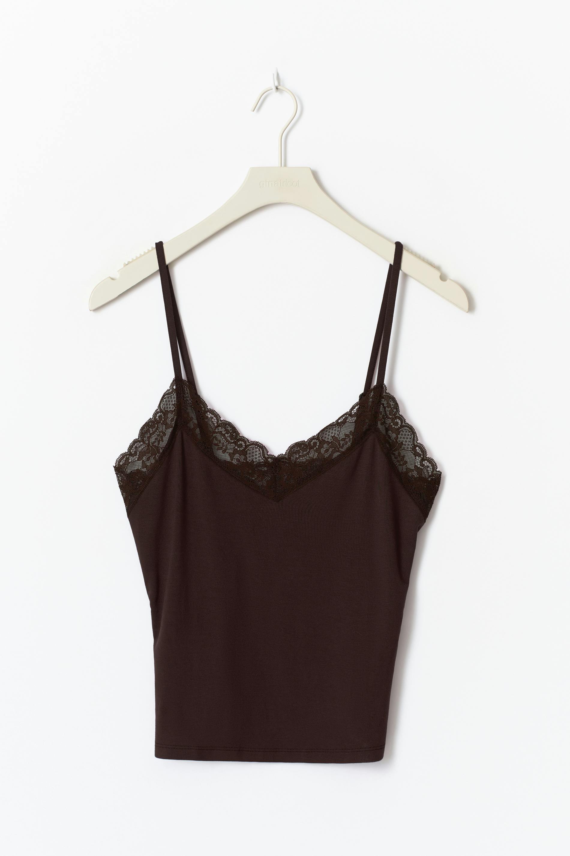Croppat linne med spets kring halsringning. Linnet är brunt och har reglerbara axelband. Det har mjukt material, v-ringning och normal passform.