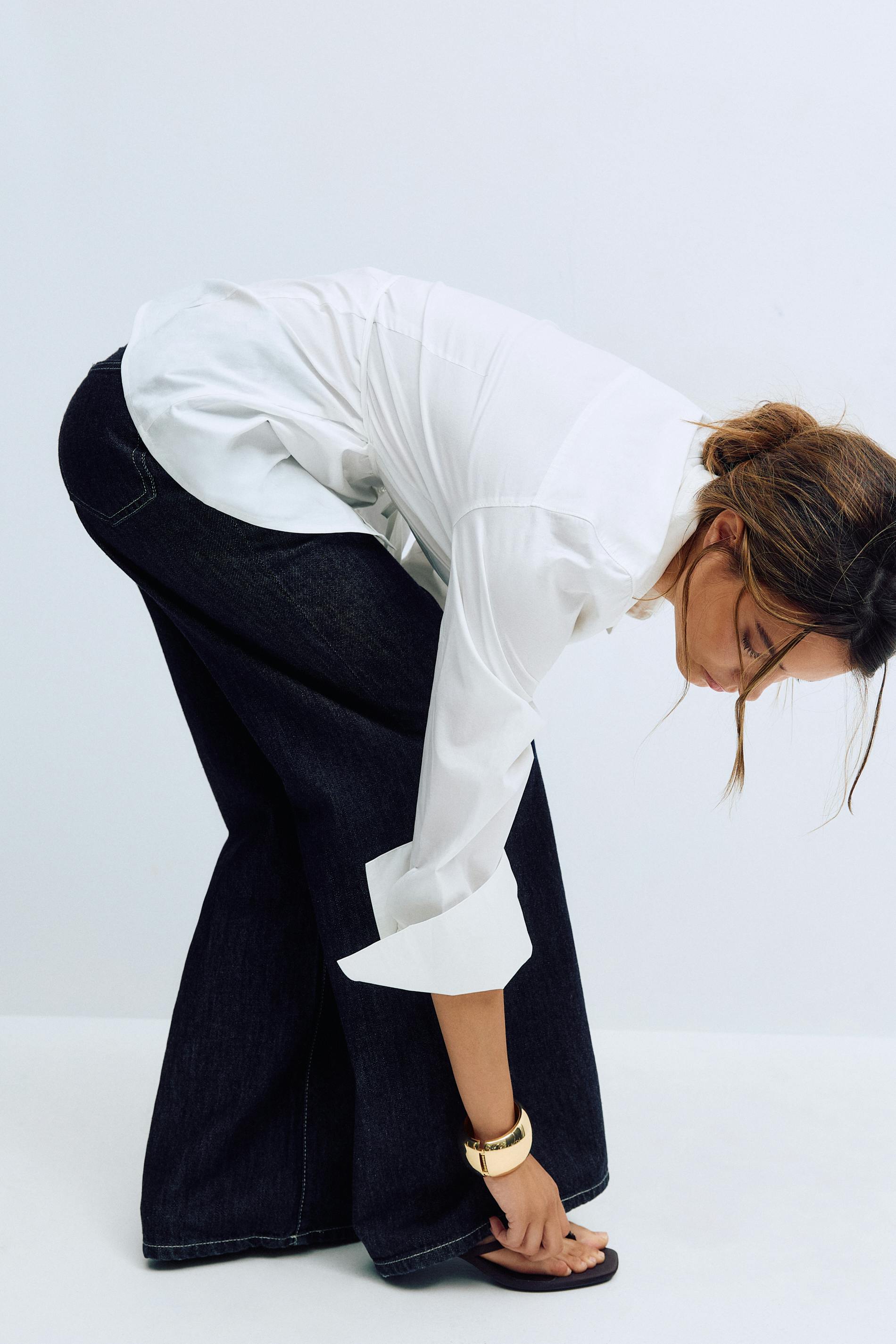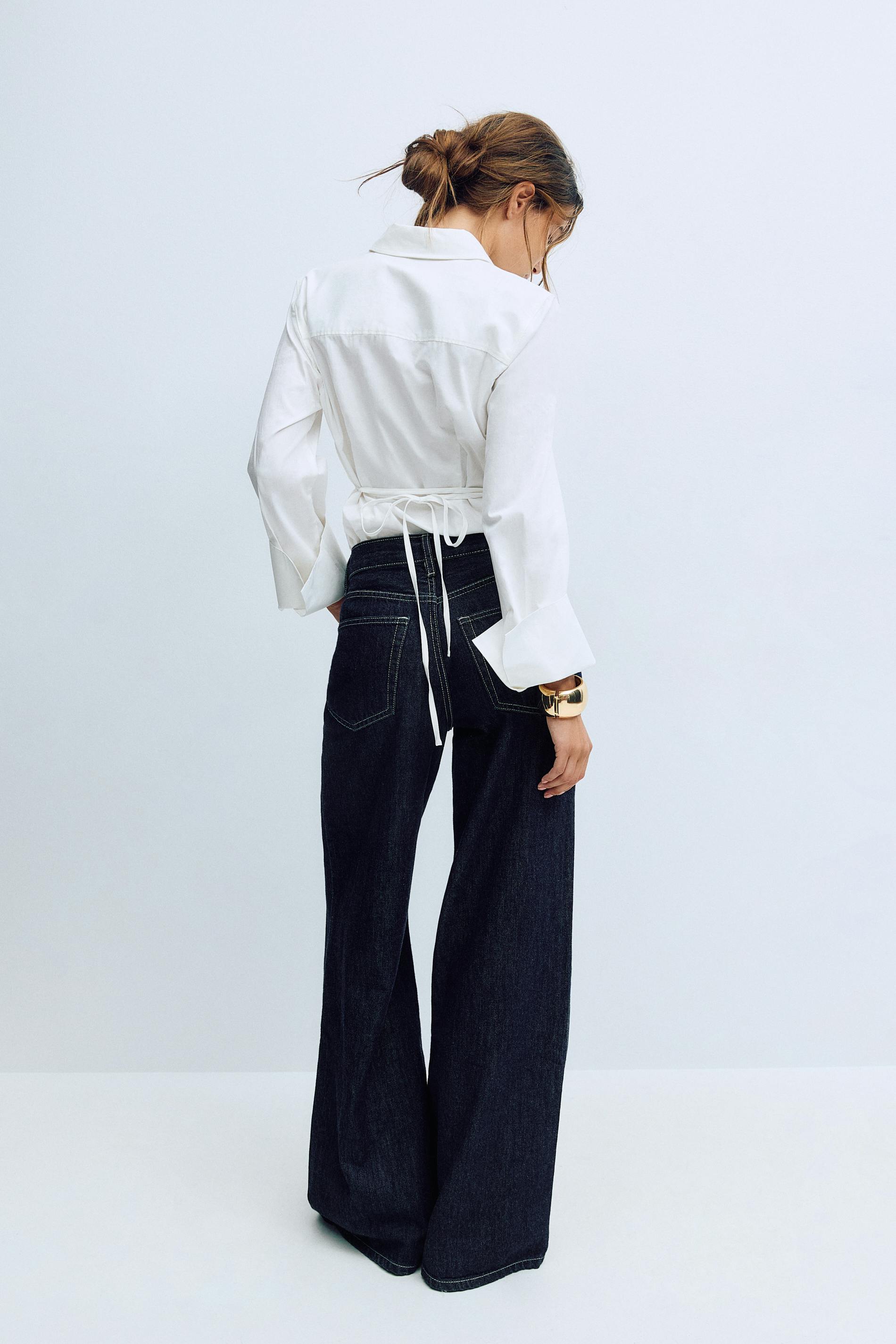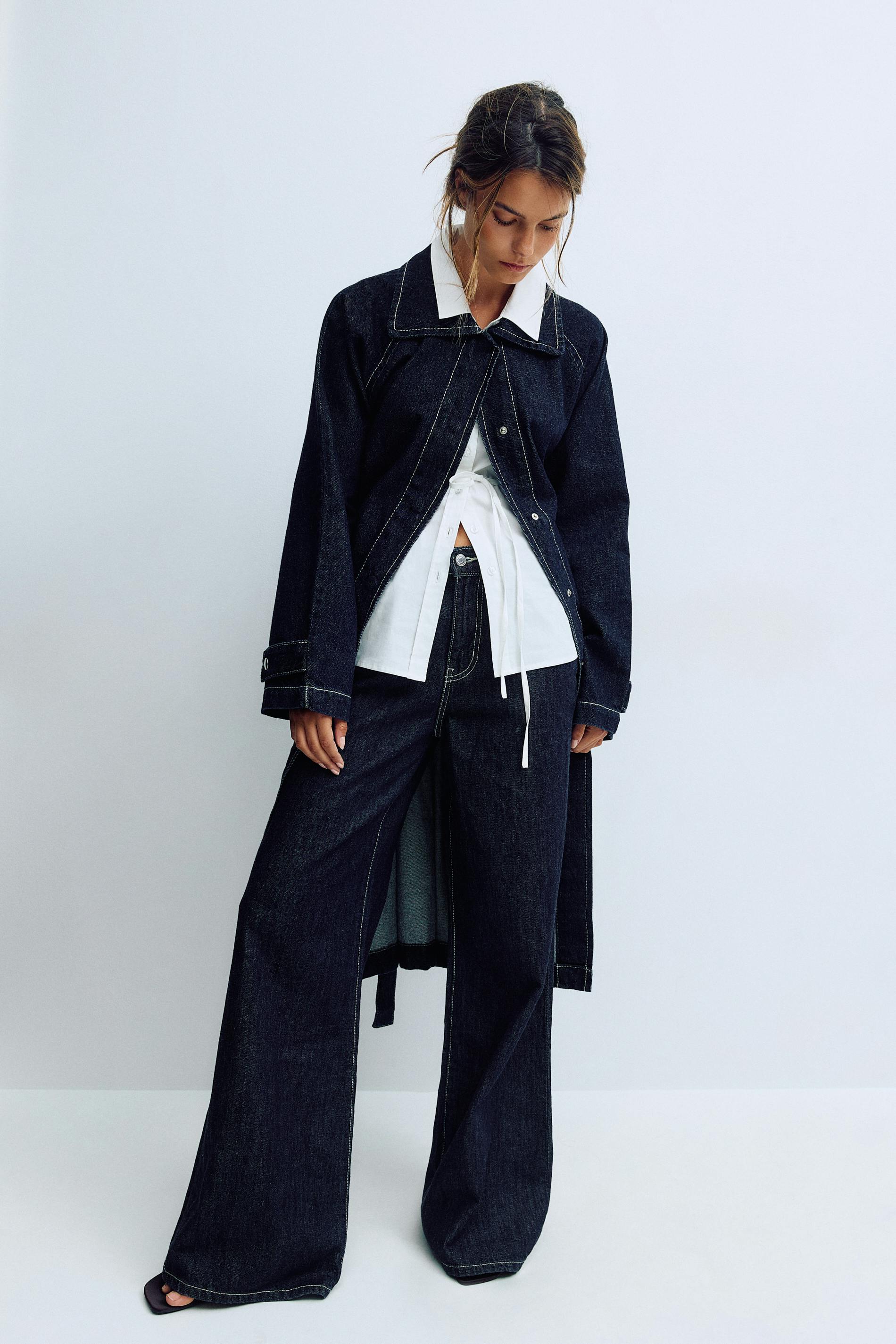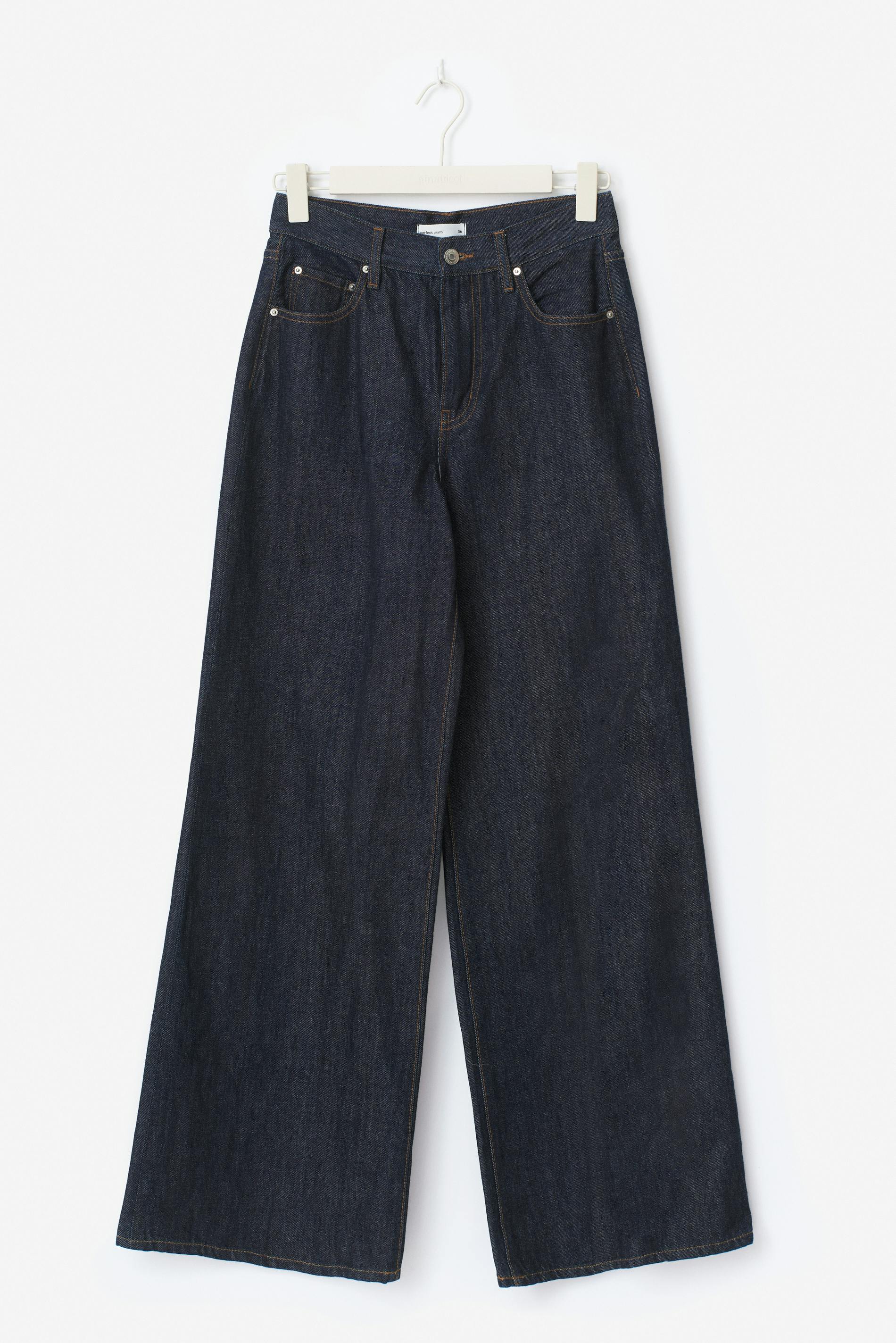 Wide jeans utan stretch med superhög midja. Jeansen är mörkblåa och har vida ben med fullängd. De har dragkedjegylf och fickor fram och bak. Se gärna vår storleksguide för att hitta din storlek.